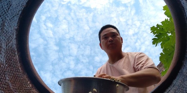 立冬酱成:三分一豆子经270天发酵已经融化,用漏勺捞起成粒 豆豉单缸存放。