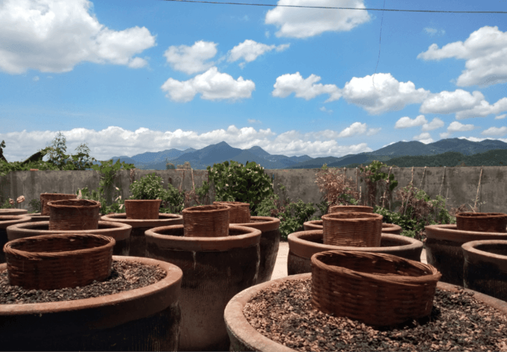 谢大哥的晒场背靠凤山森林公园山麓,四周群山环绕,山清水秀,凤山森林公园松柏青翠,古树幽幽,山上无人居住。谢章民传统家酿遵古制选用“凤山下石流山泉”用以酿造。