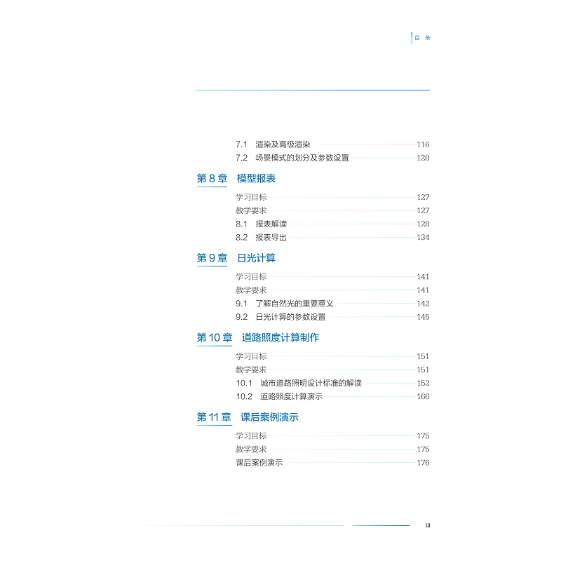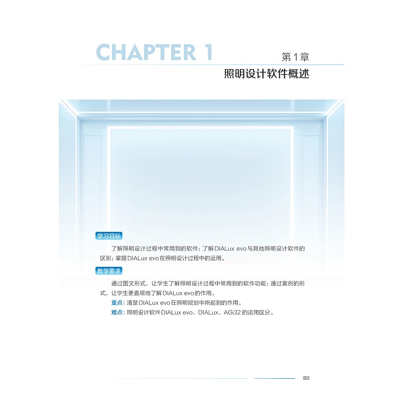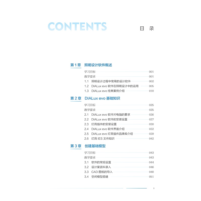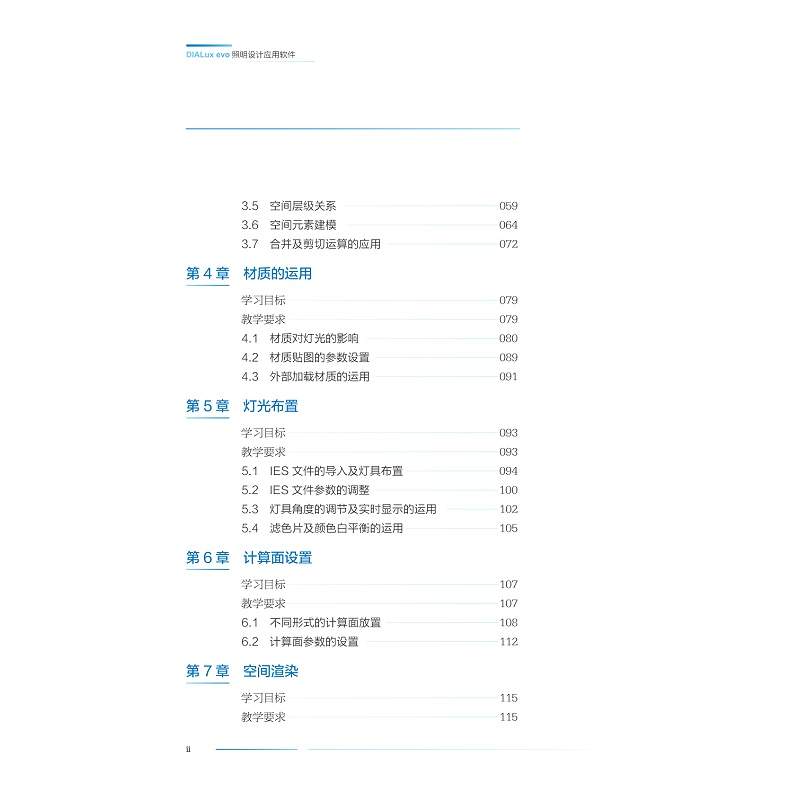 本书介绍照明设计的专业软件应用:照明计算软件(DIALux EVO)和光影交互软件TouchDesigner。确定学生通过课程应达到的目的和目的,如理解界面、创建灯光场景、渲染图像等。通过测验、考试和作业定期评估学生的进步,以提供反馈并确保学习目标得以实现。本教材主要包括以下内容:第一章照明设计软件概述;第二章 照明计算软件(DIALux EVO);第三章 照明设计基础;第四章 照明设计应用软件;第五章 DIALux EVO建模;第六章 照明设计相关规范;第七章 照度计算应用;第八章 模式与场景设置;第九章 照度计算的应用实例;第十章 有效使用照明设计软件的提示和技巧。