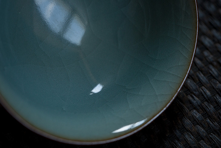 这款小茶碗,以粉青釉着色,釉层厚而透明,