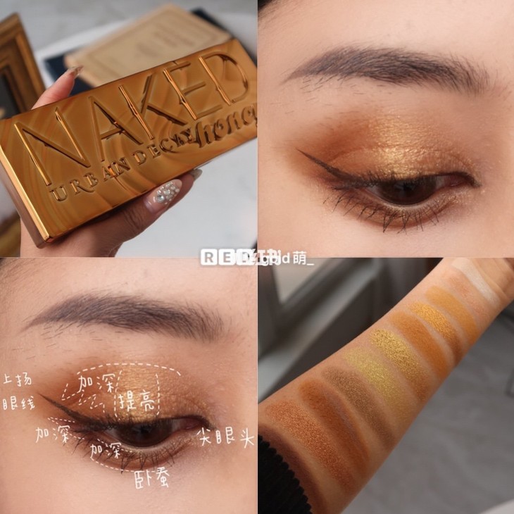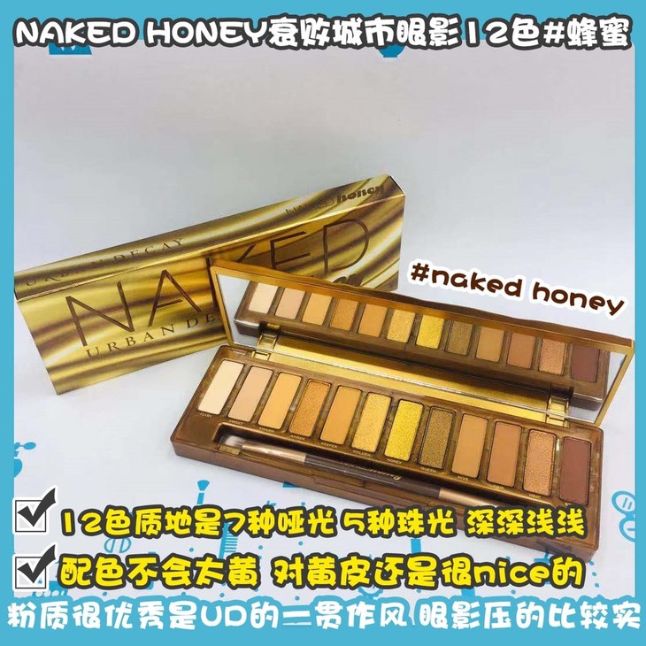 NAKED HONEY衰败城市眼影12色#蜂蜜 👍日常浓妆都🉑的蜂蜜🐝盘眼影!#naked honey看着很夸张,其实还是蛮日常的哦☺!配色不会太黄,对黄皮还是很nice的💕。12色质地是7种哑光➕5种珠光,深深浅浅,整个盘子外观也是金灿灿那种✨!粉质很优秀是UD的一贯作风🌬,眼影压的比较实,所以不飞粉✔!好上色,也很好晕染👅,尤其是金属色,超级顺滑👏~
