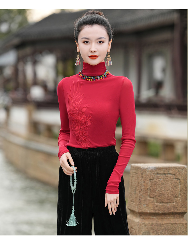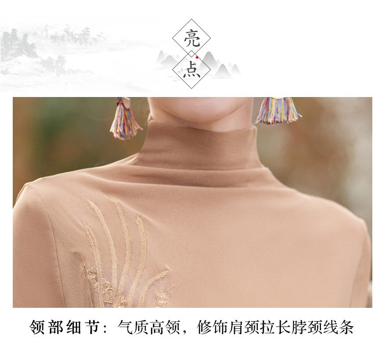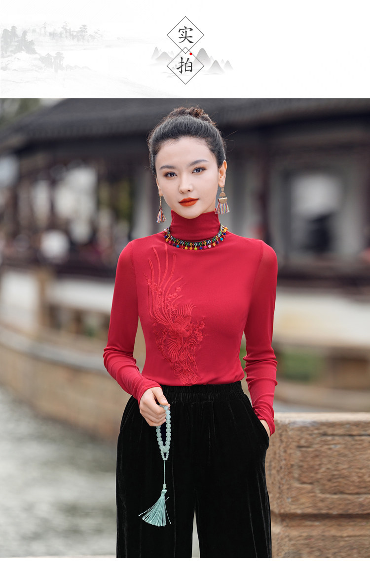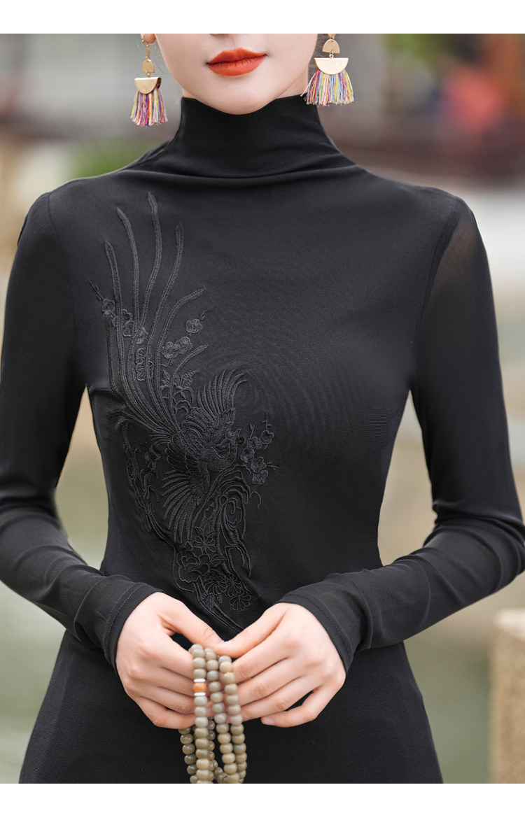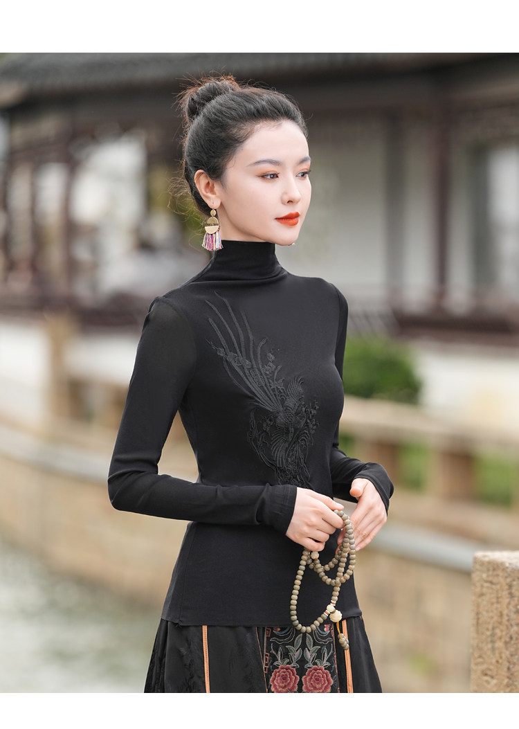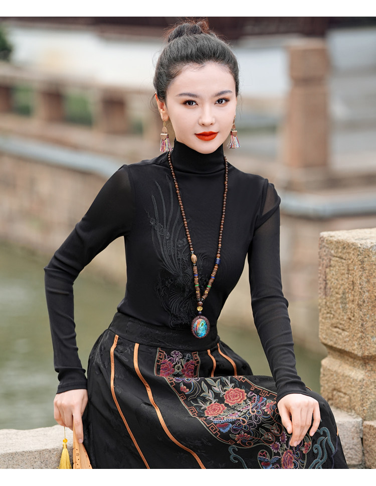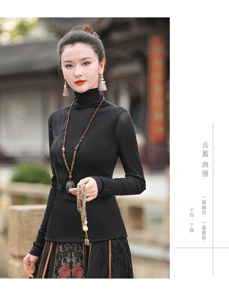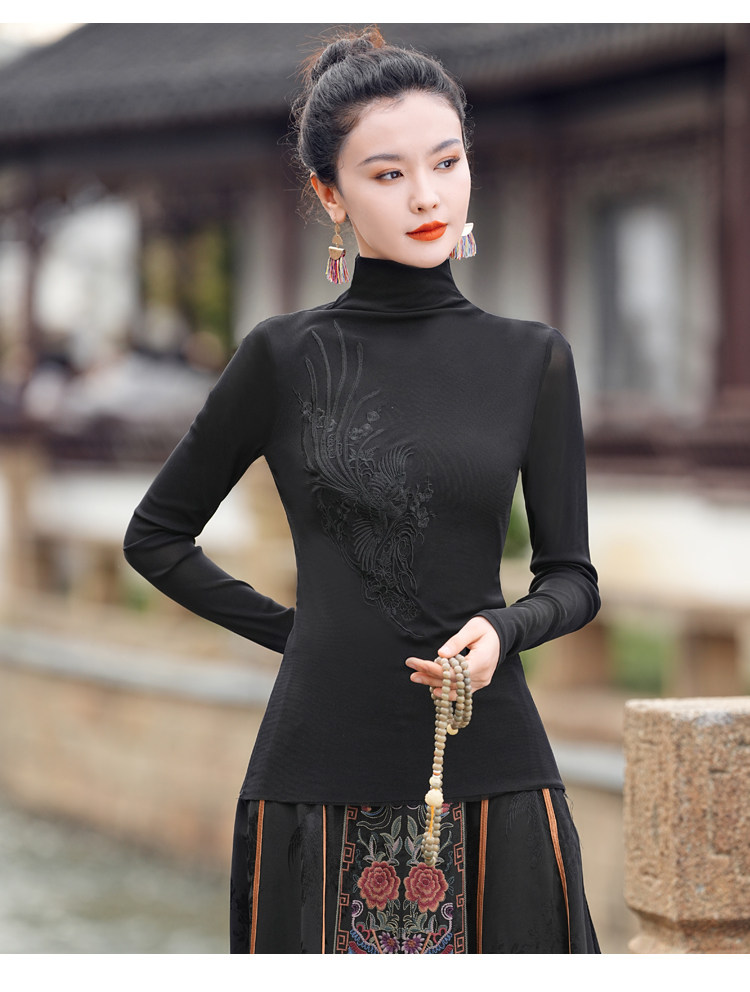 A8061# 新中式国风高级国潮双层网纱立领长袖刺绣T恤女打底衫