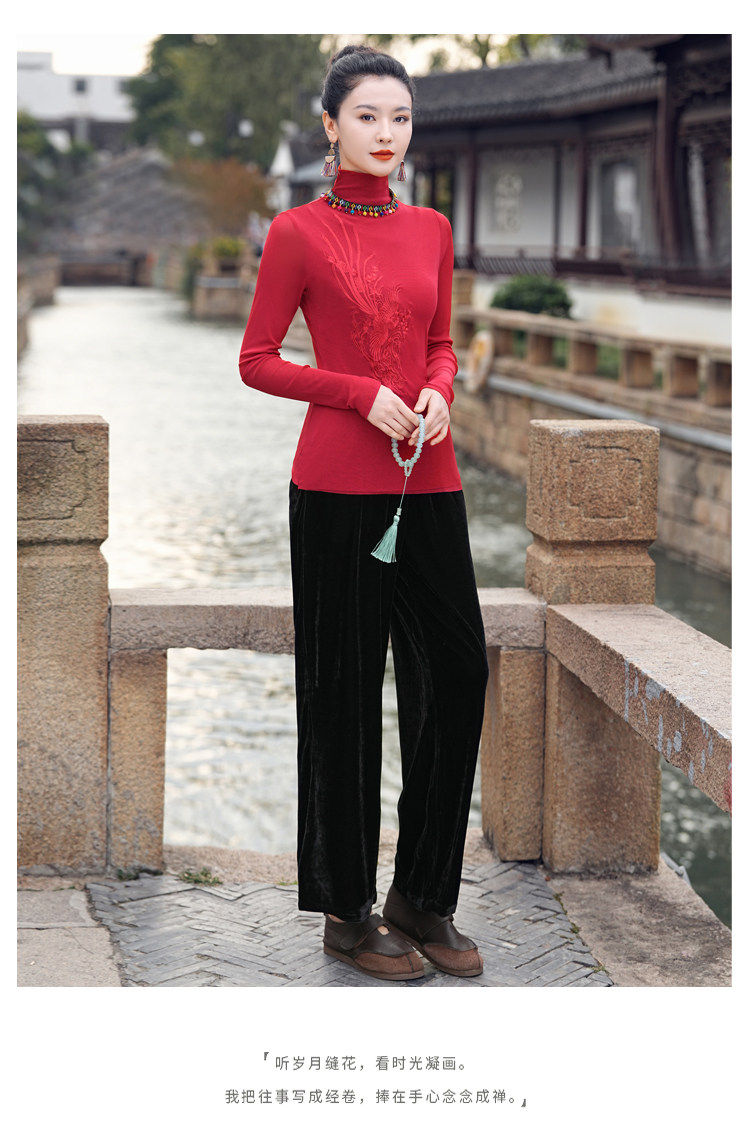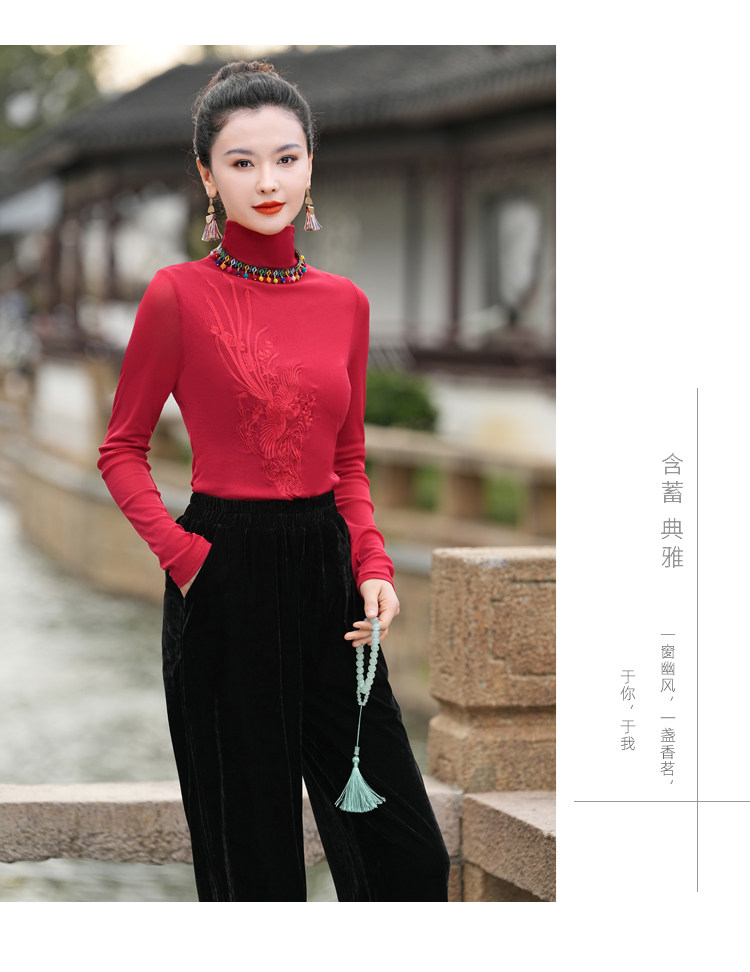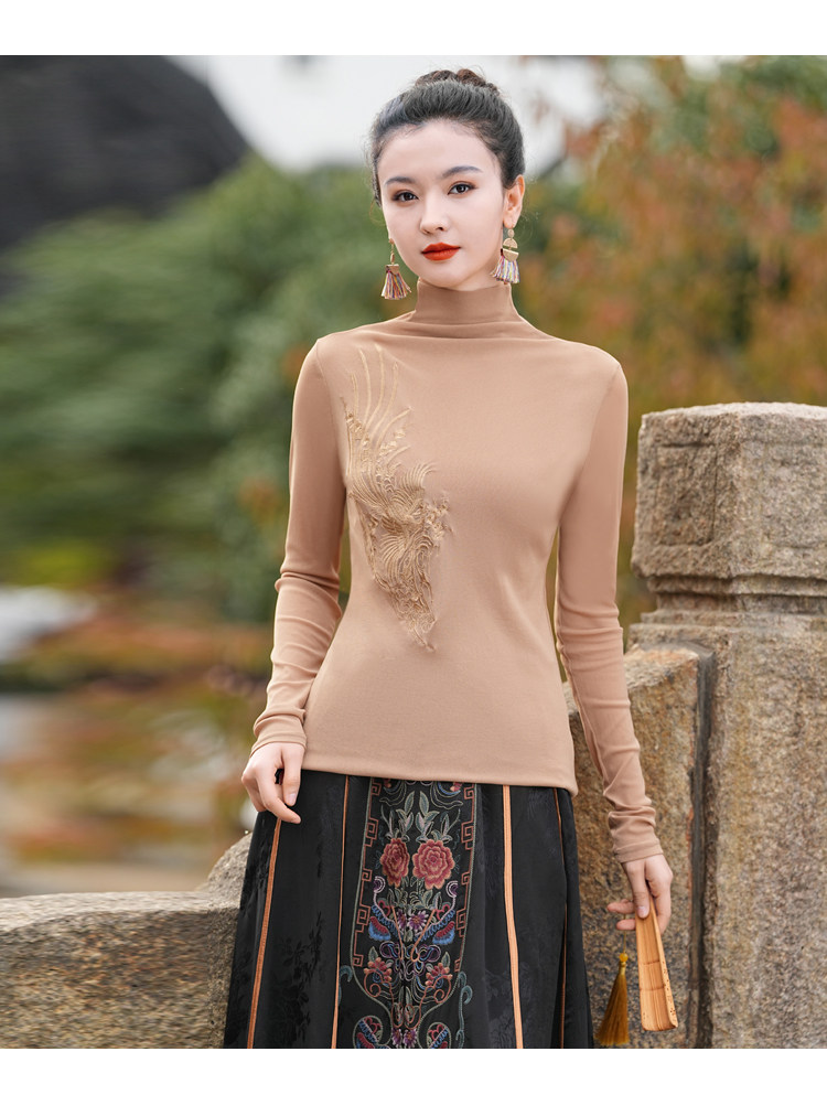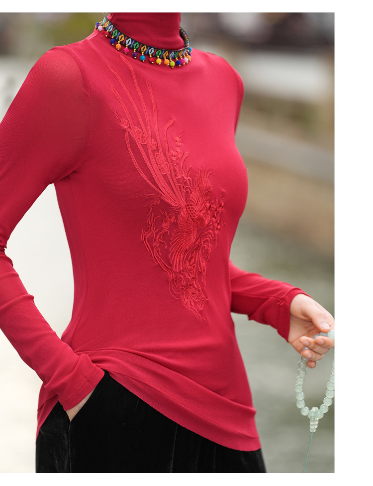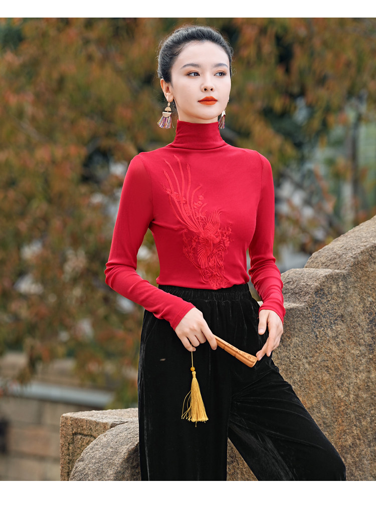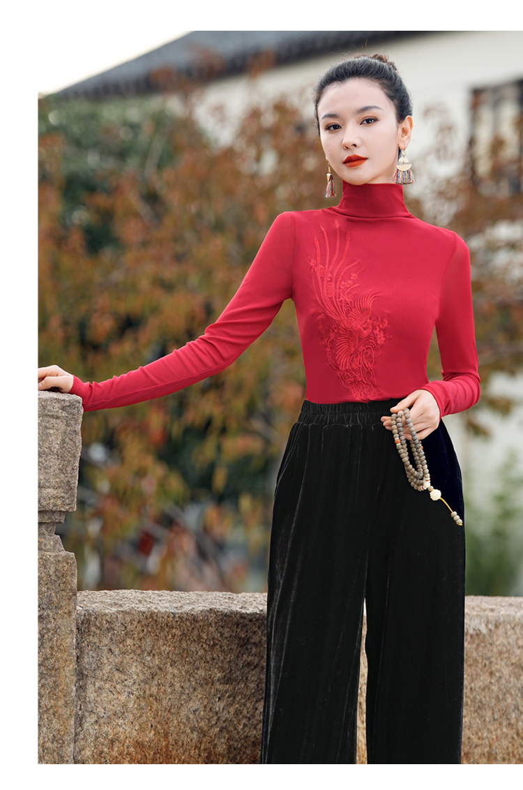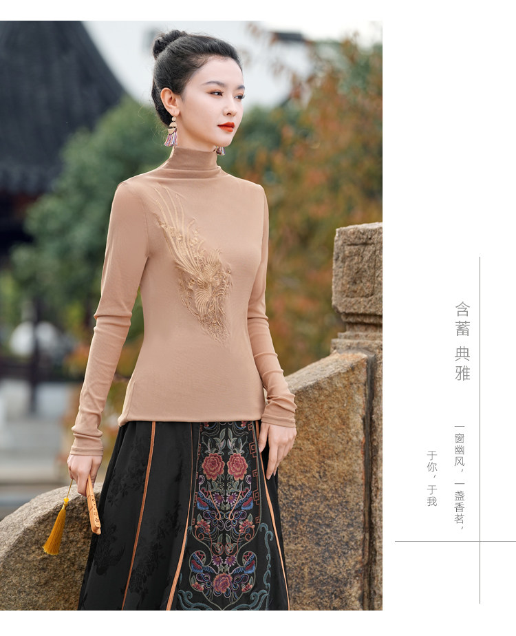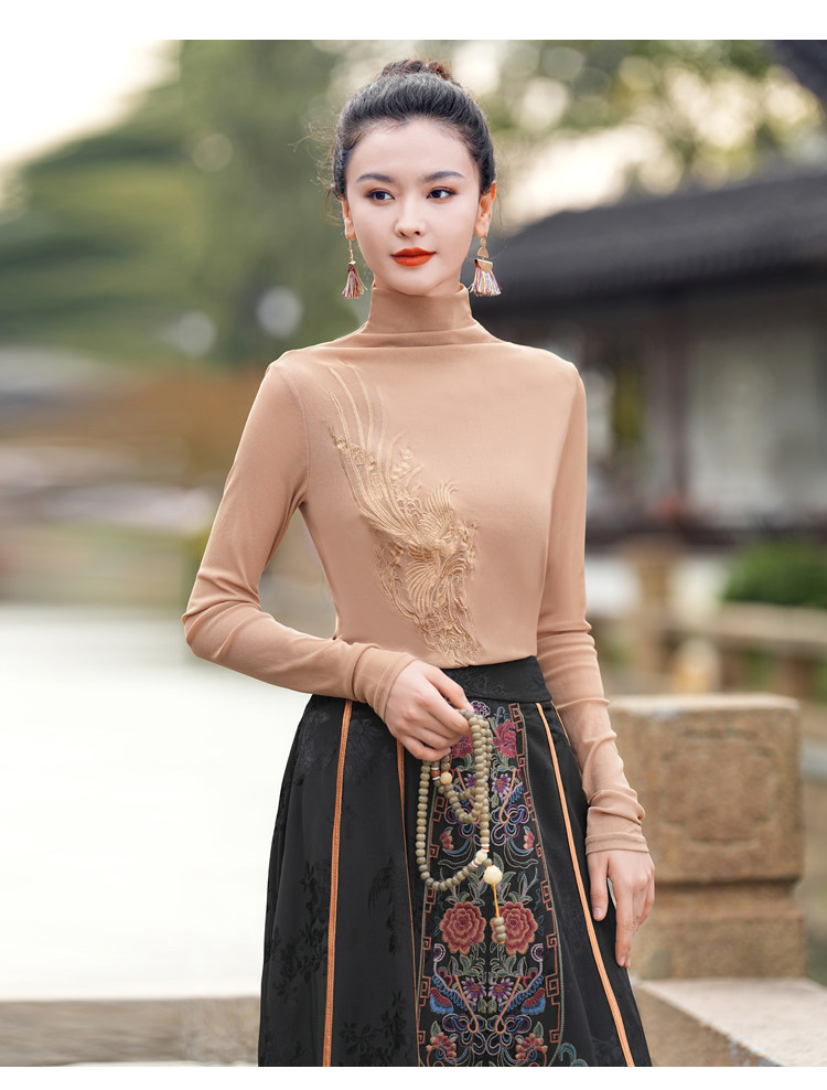 A8061# 新中式国风高级国潮双层网纱立领长袖刺绣T恤女打底衫