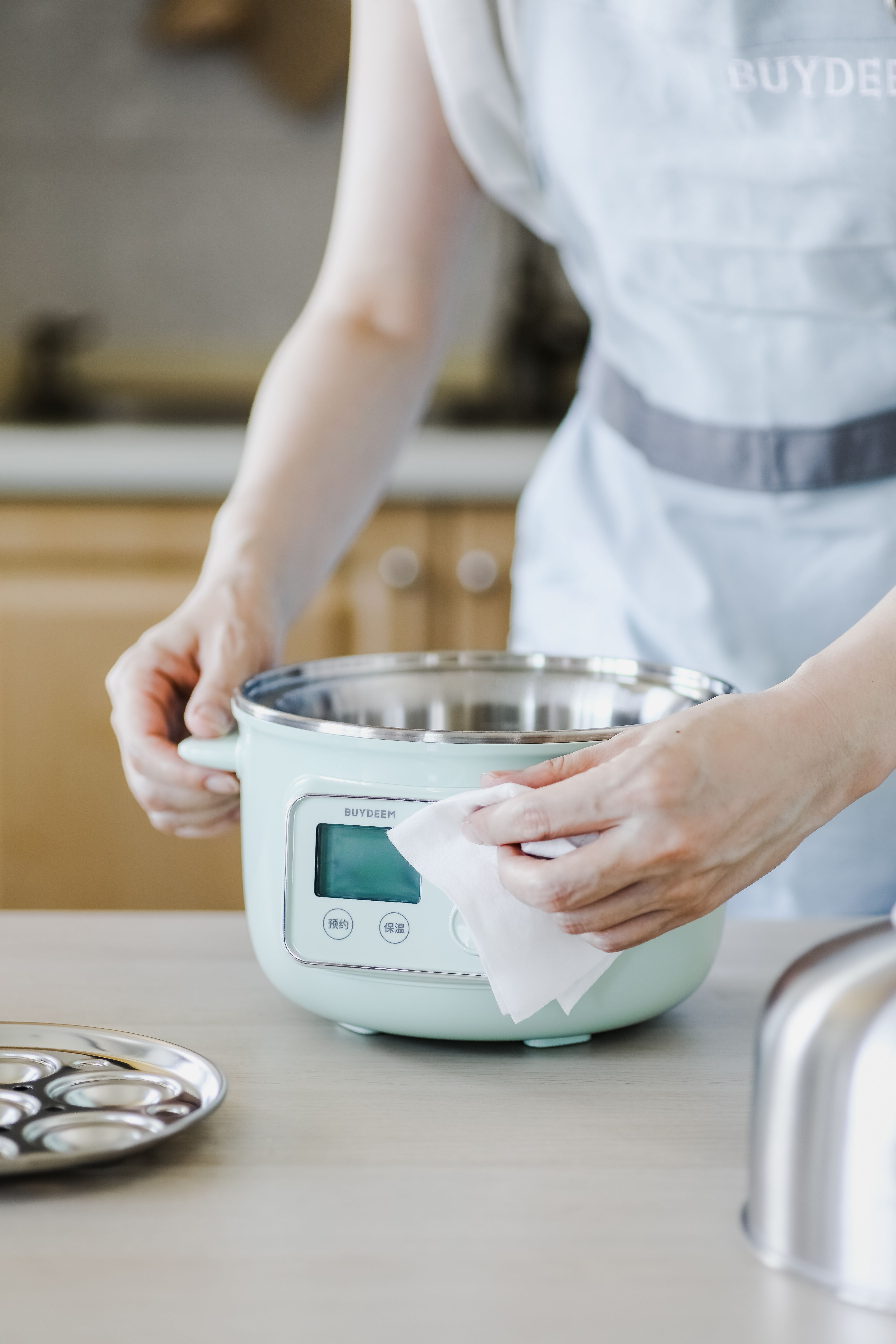 一体设计锅身不易藏污纳垢,盖上硅胶防水塞,不锈钢内胆可正常水洗,外部面板如不慎湿水或脏污,可用干布擦拭。
