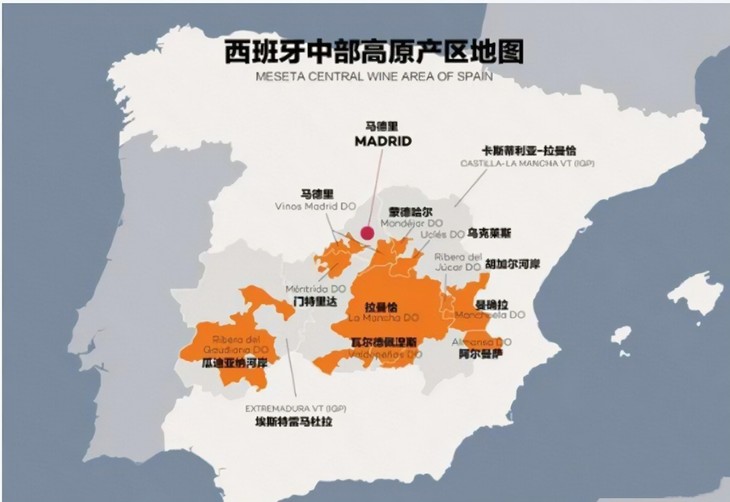 拉曼恰产区位于阿尔瓦塞特(Albacete)、雷阿尔(Ciudad Real)、昆卡(Cuenca)和托莱多(Toledo)省的南部高原,是西班牙乃至全世界醉大的葡萄酒产区。