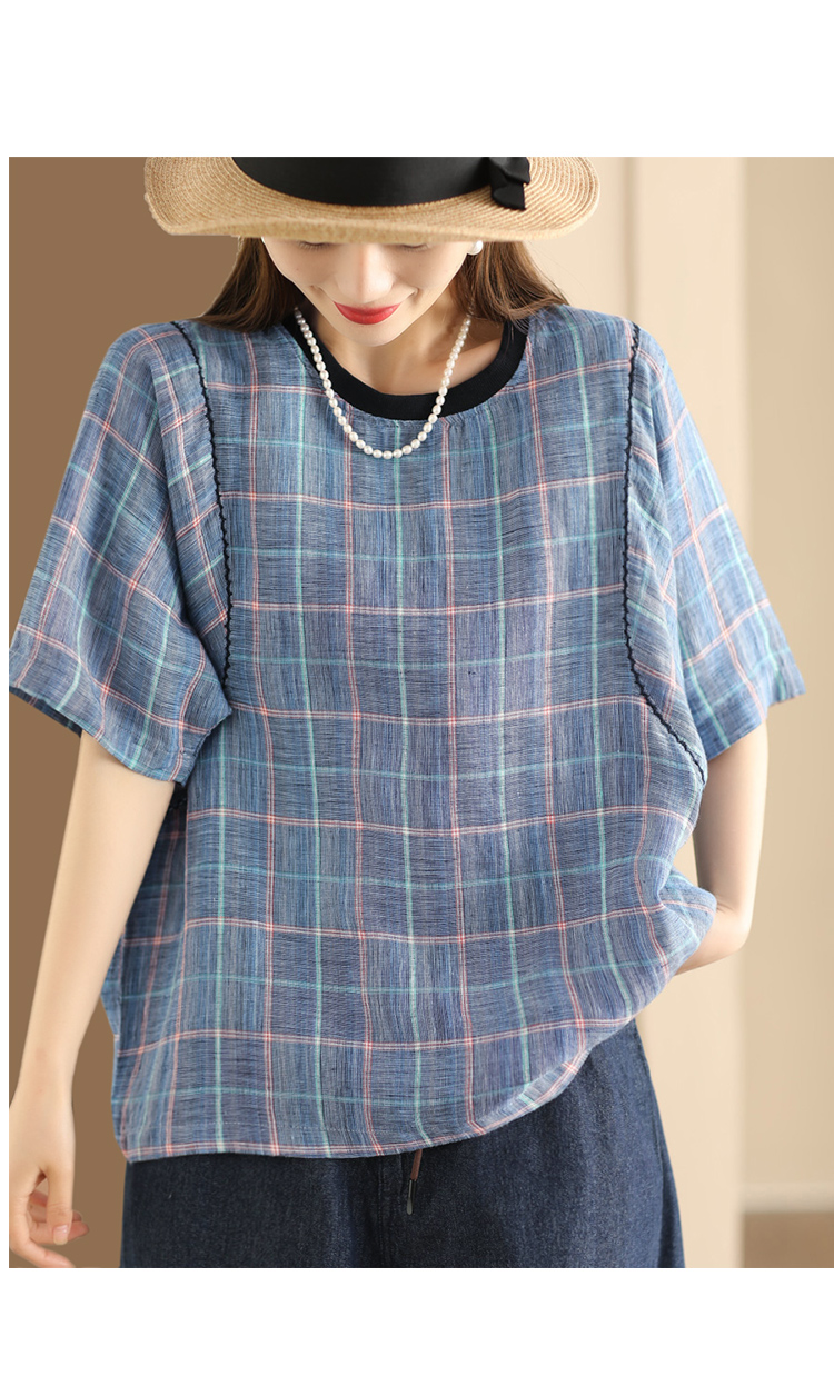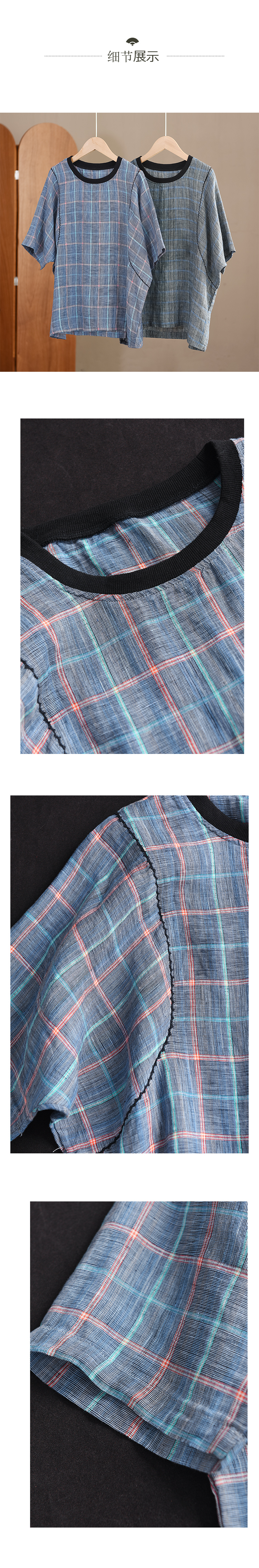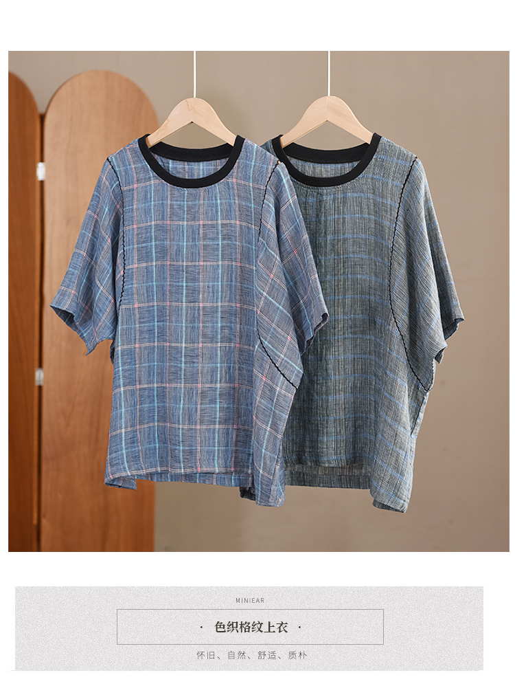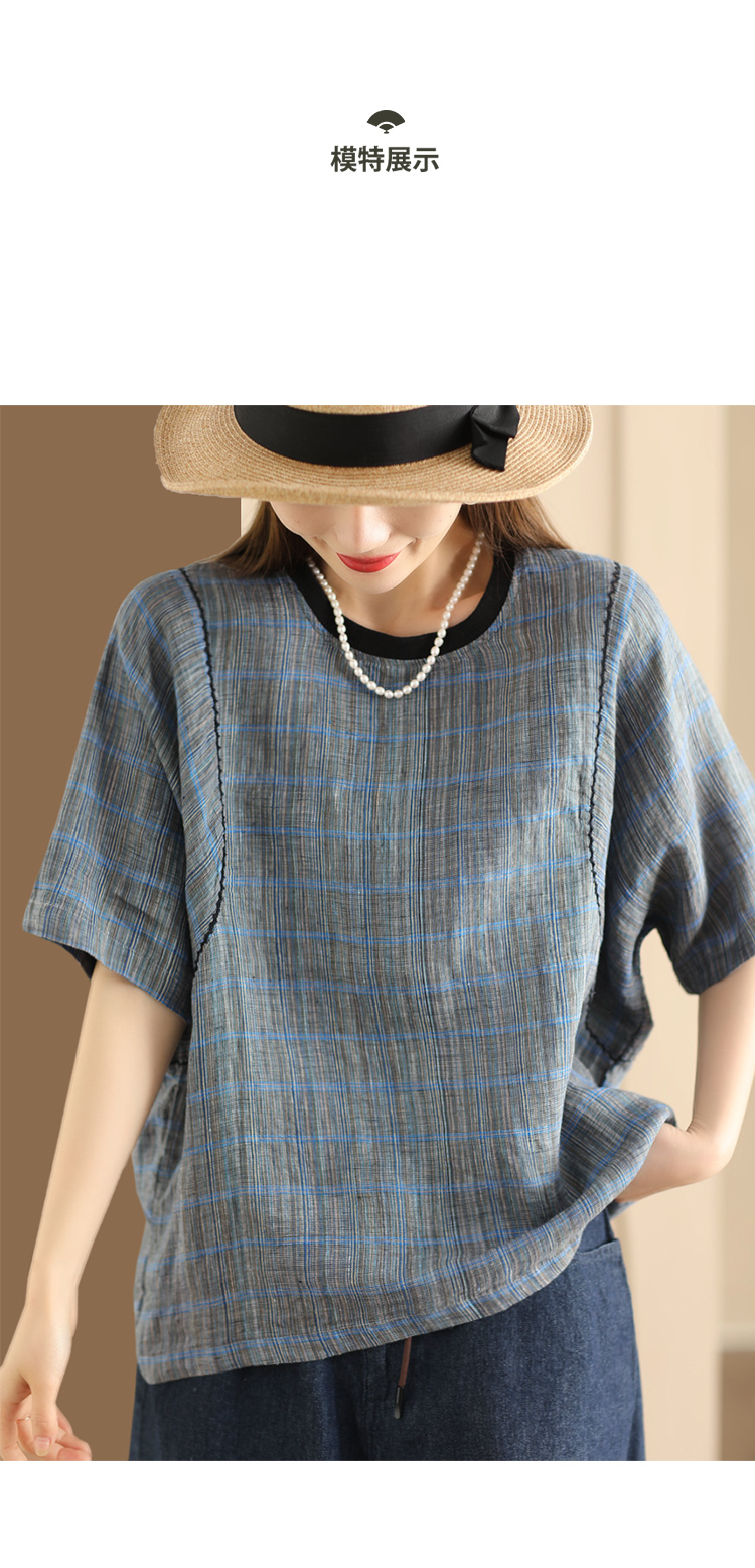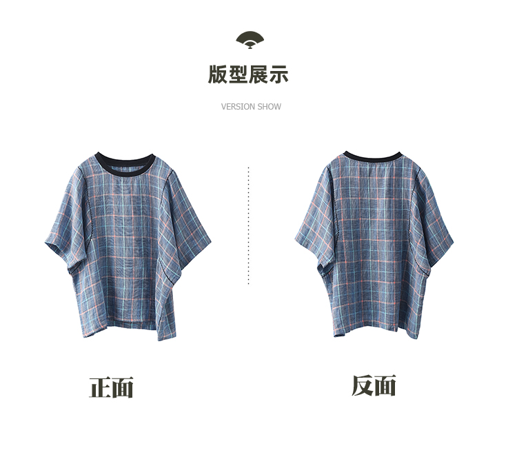 雀说新款勾线色织格纹上衣女拼接螺纹圆领短袖格子衫休闲AL727
