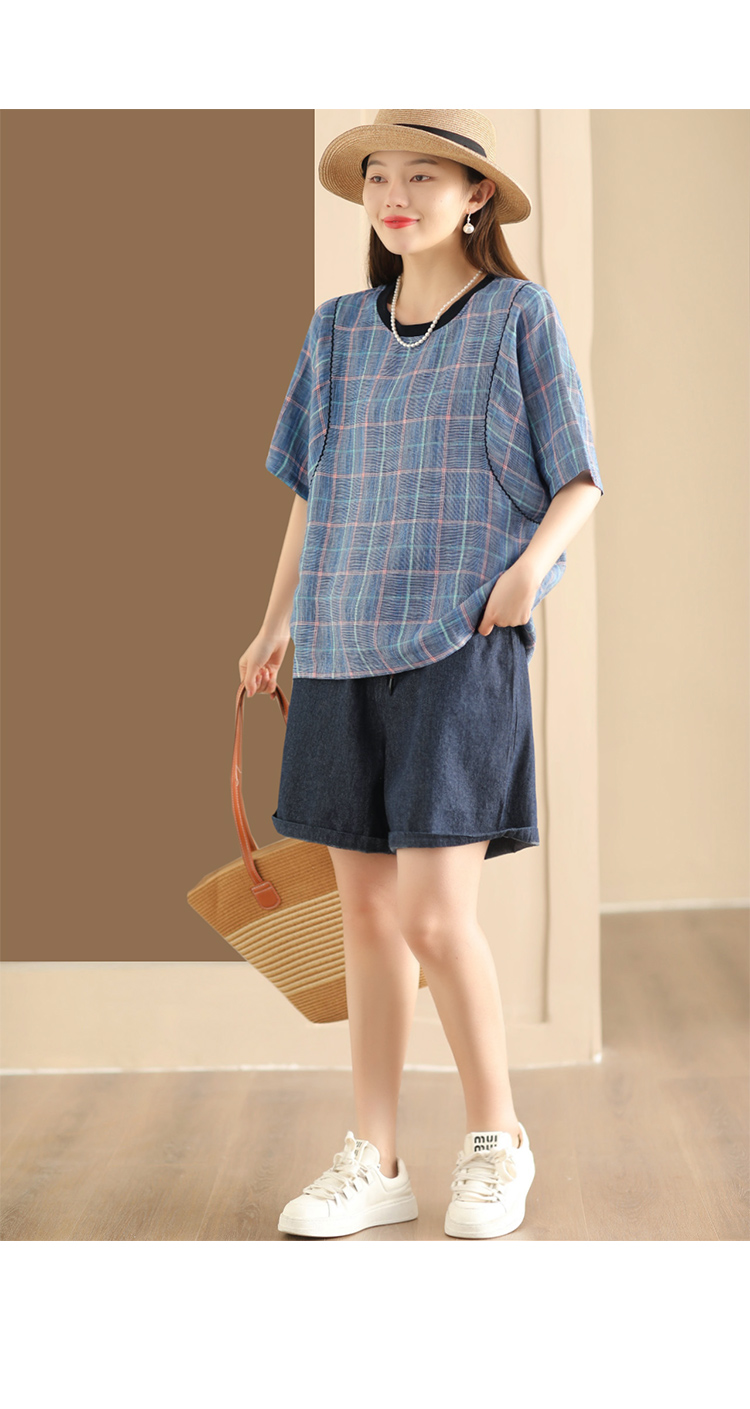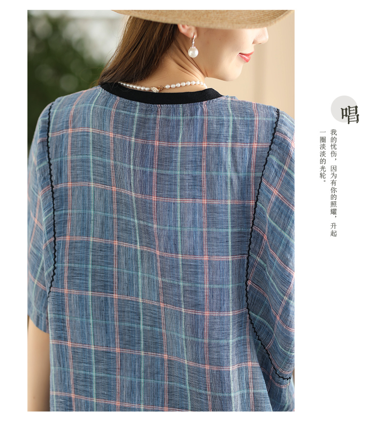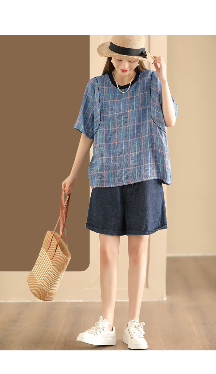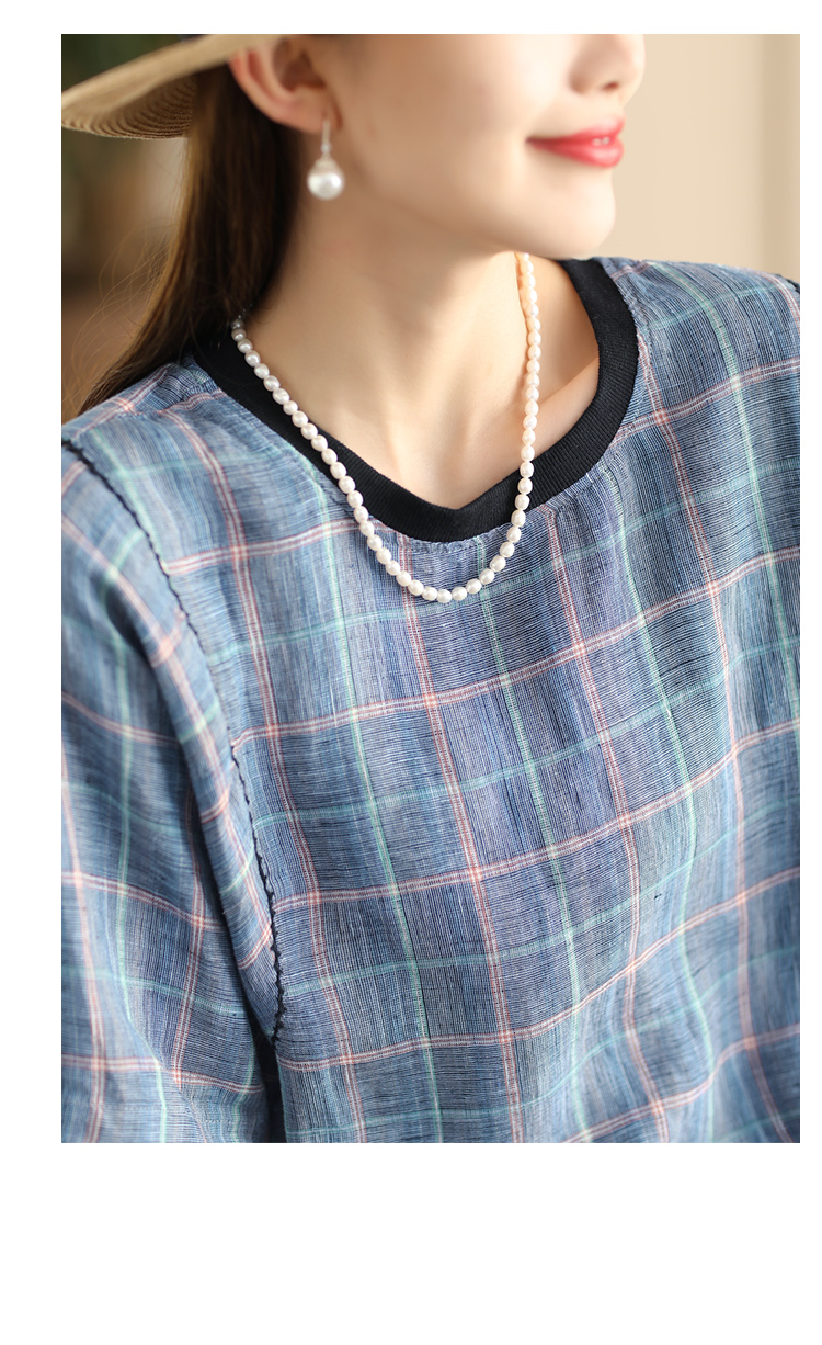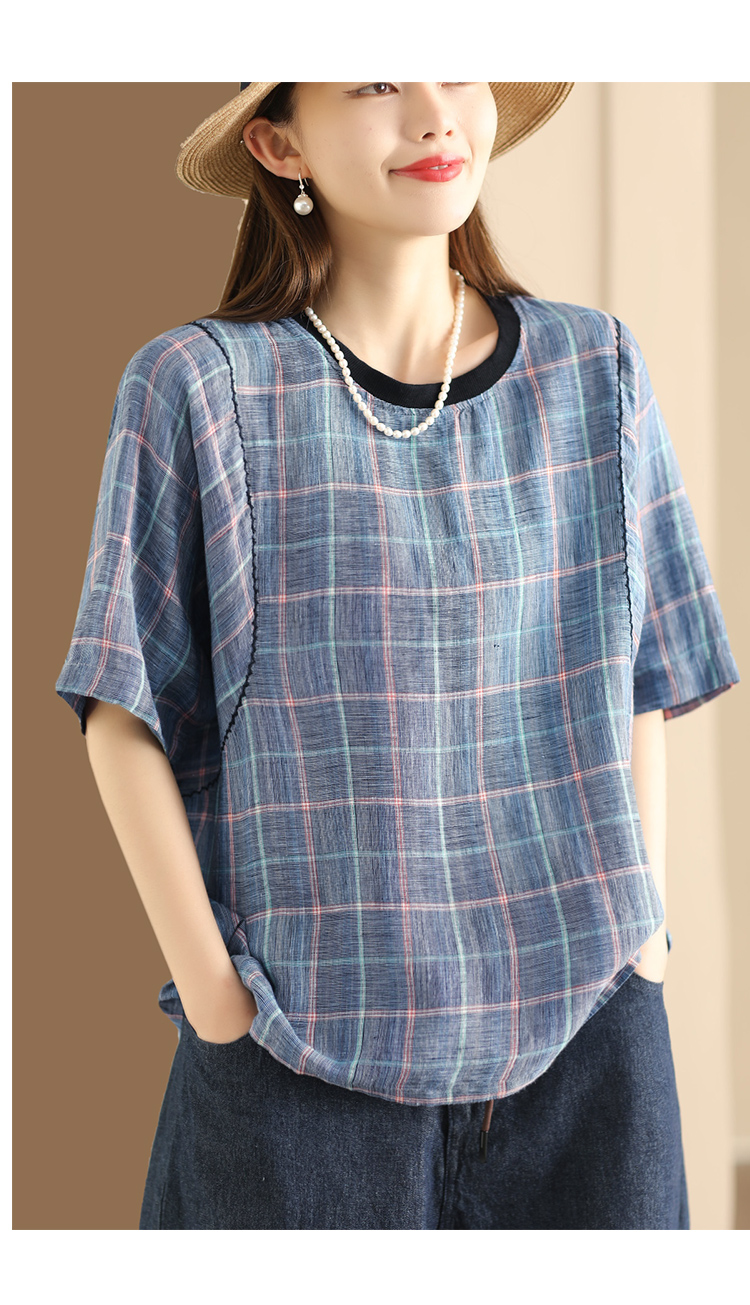 雀说新款勾线色织格纹上衣女拼接螺纹圆领短袖格子衫休闲AL727