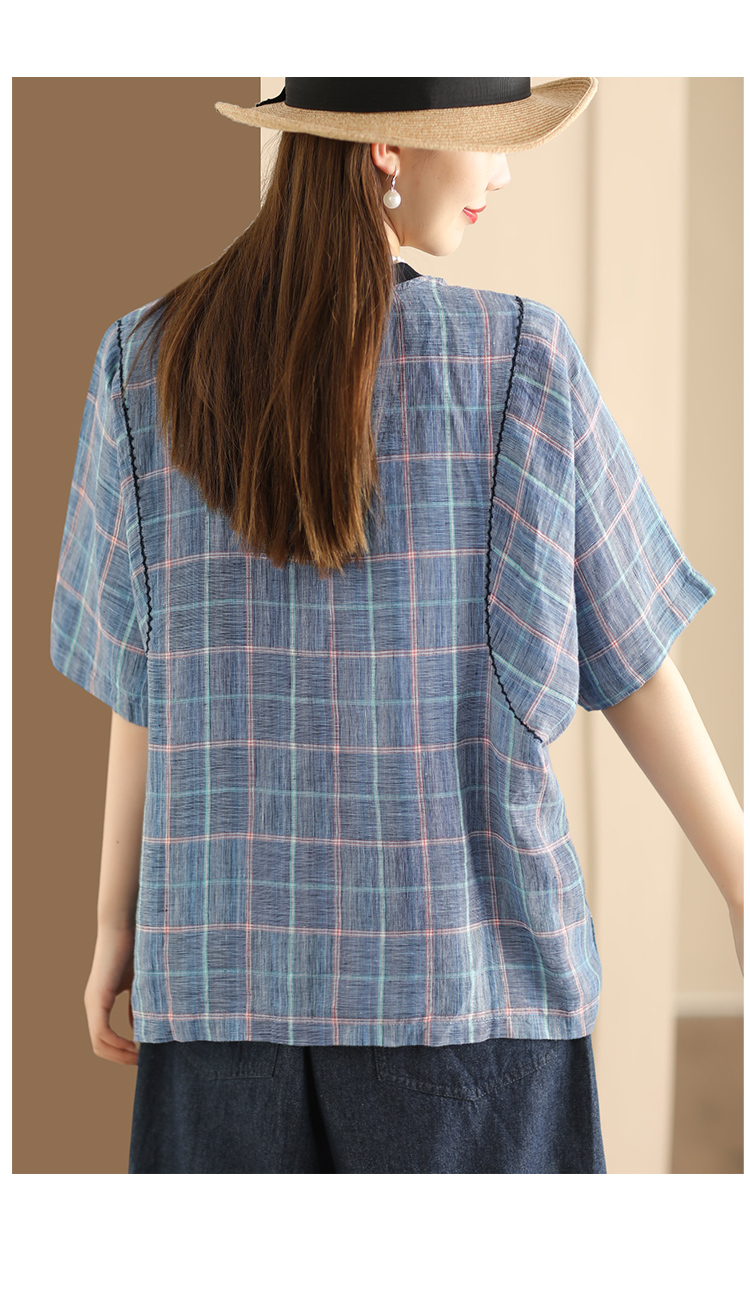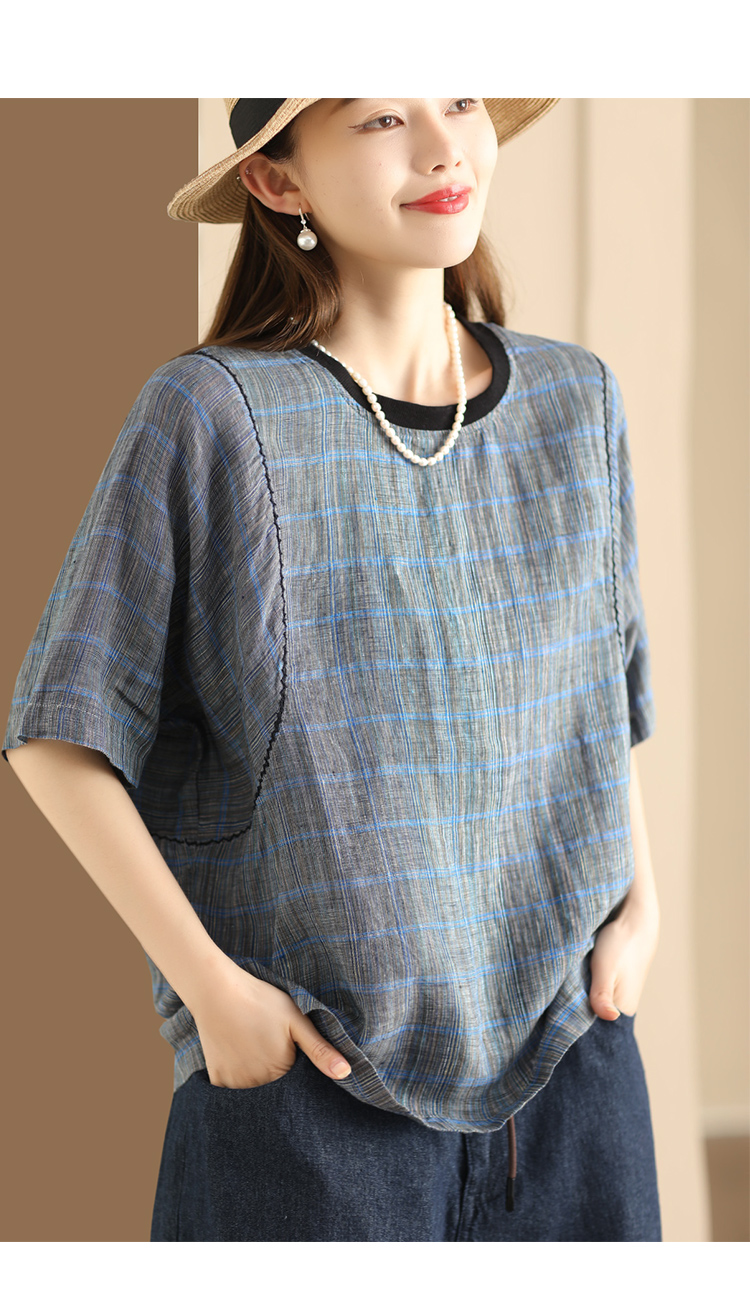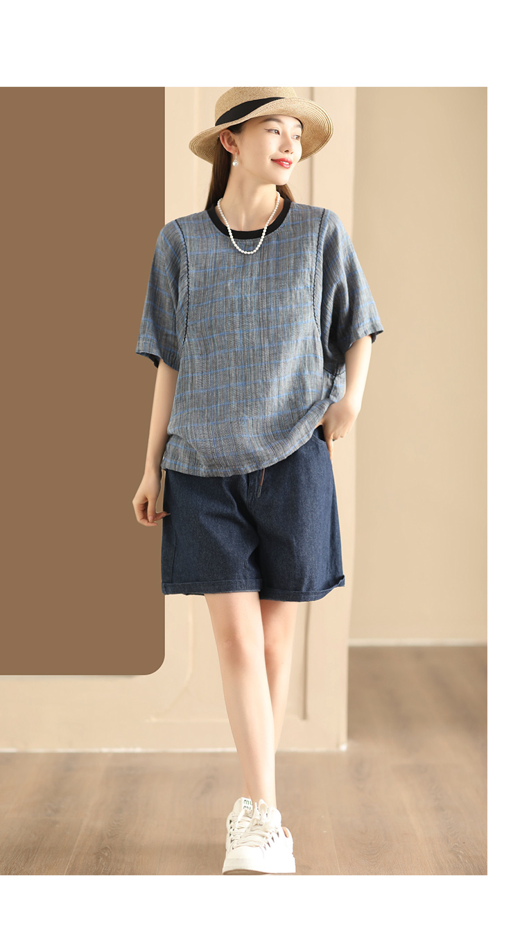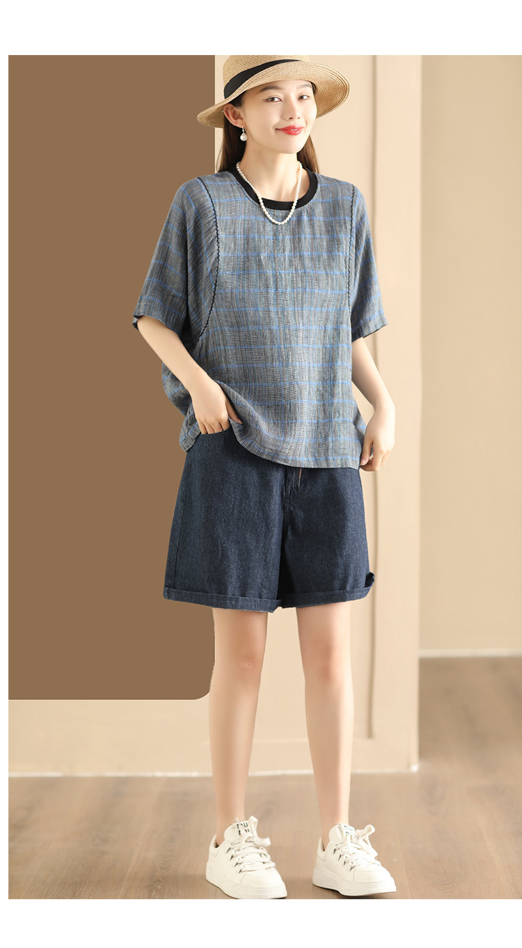雀说新款勾线色织格纹上衣女拼接螺纹圆领短袖格子衫休闲AL727