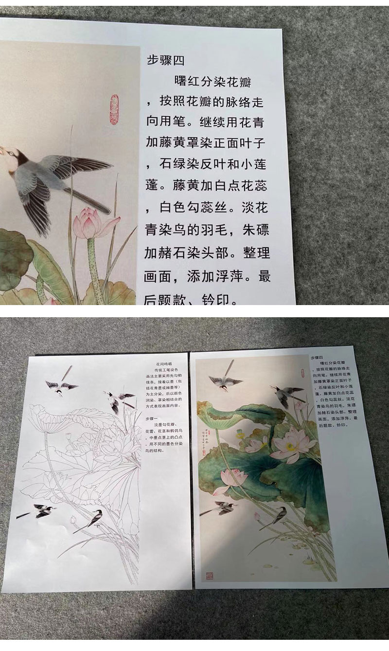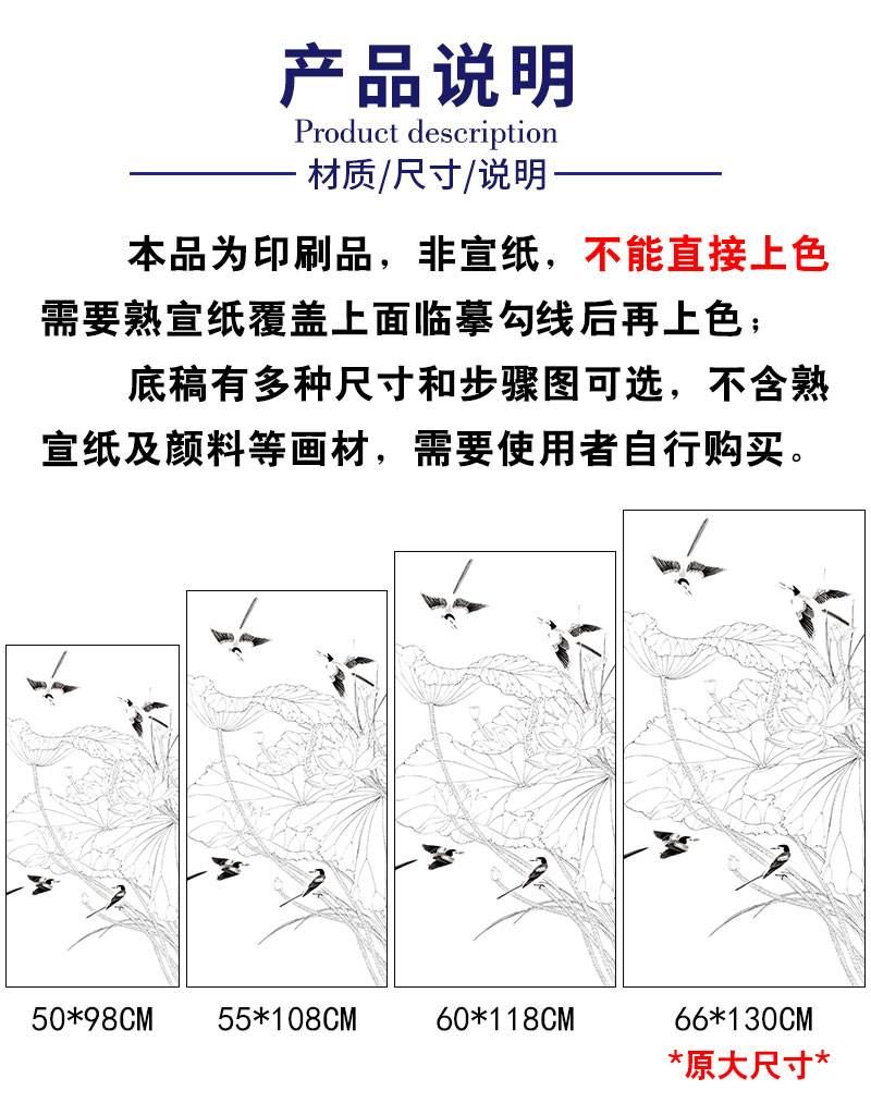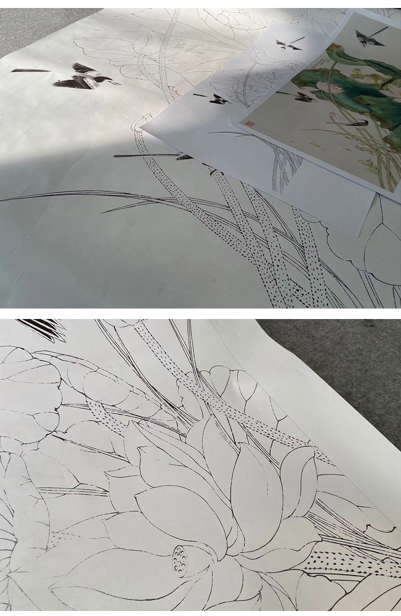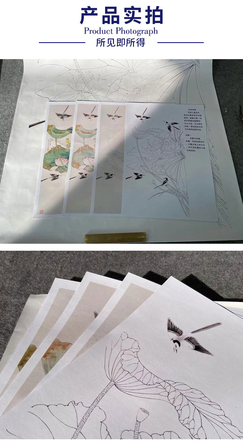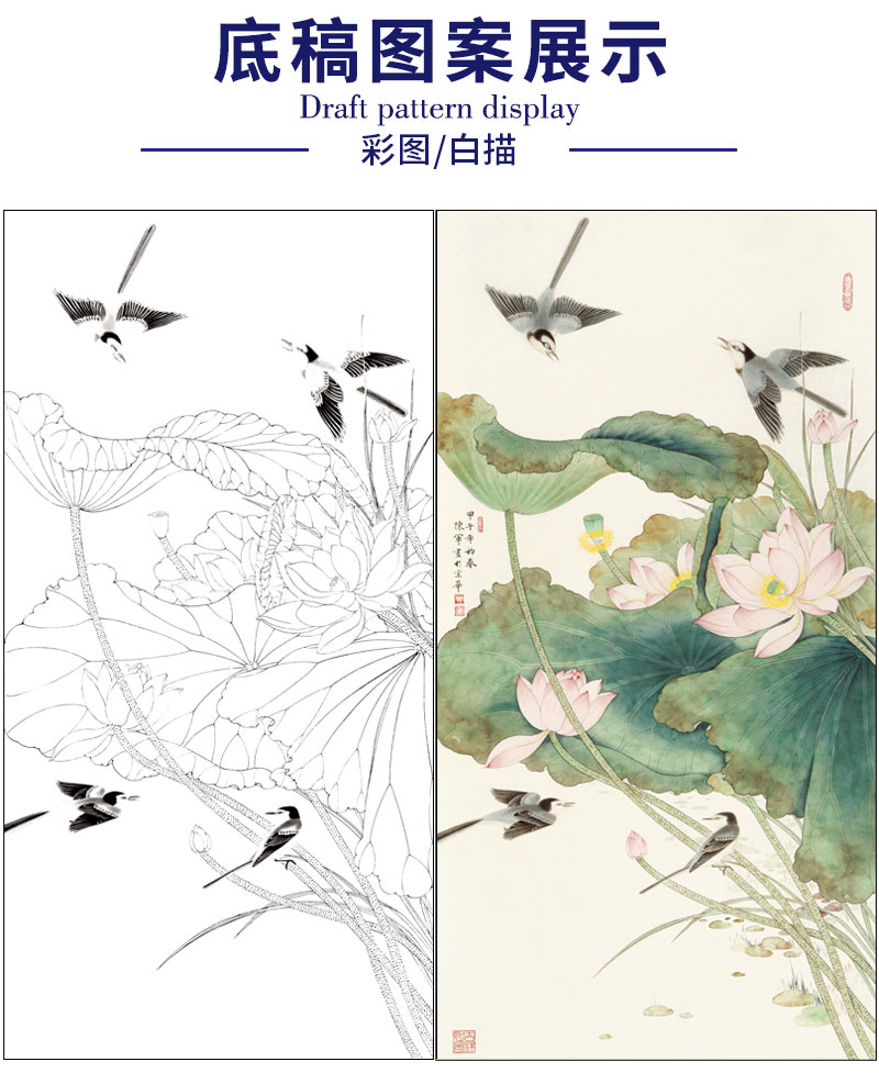 【有步骤】陈军四尺工笔画白描底稿《花间鸣唱》荷花鹡鸰鸟初学者临摹花鸟线稿CJ03