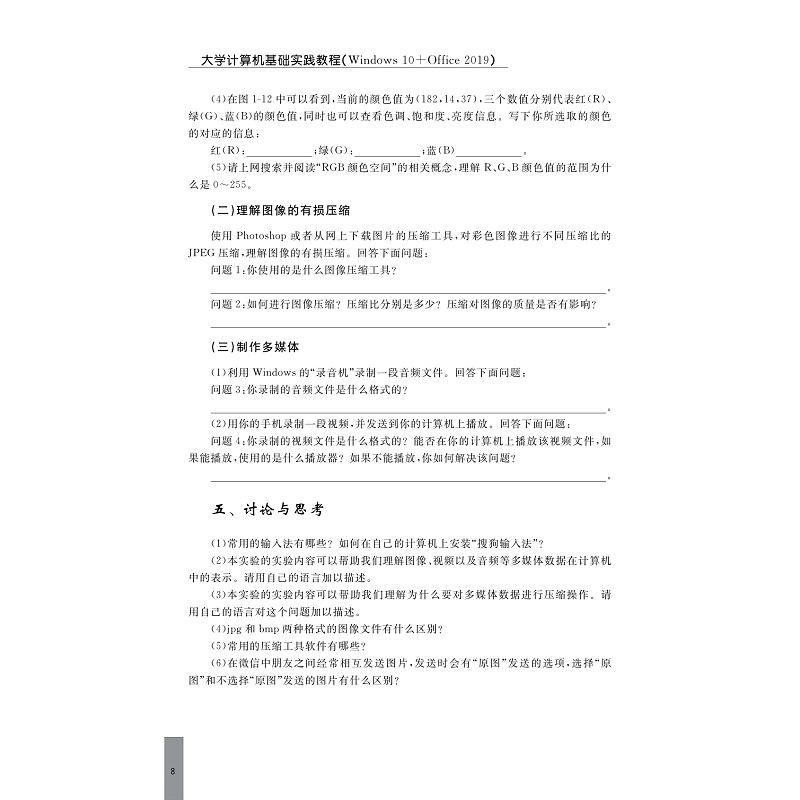 本实践教程以Windows10,Office2019为工具,主要容包含Windows10操作,Word,Excel,PPT等办公软件操作,以及计算机网络的基本设置,Access数据库管理系统的基本操作,以及数据分析和数据可视化基础操作等。本实践教程本书内容包含了Windows10,Office2019,大数据等zuixin的计算机技术,结合各专业的计算机应用能力培养,在此类教材中首次将数据可视化的思想作为新的教学内容和实践操作内容,以培养学生数据思维能力。本书可作为高等院校各类专业的大一新生“大学计算机基础”课程的教材。