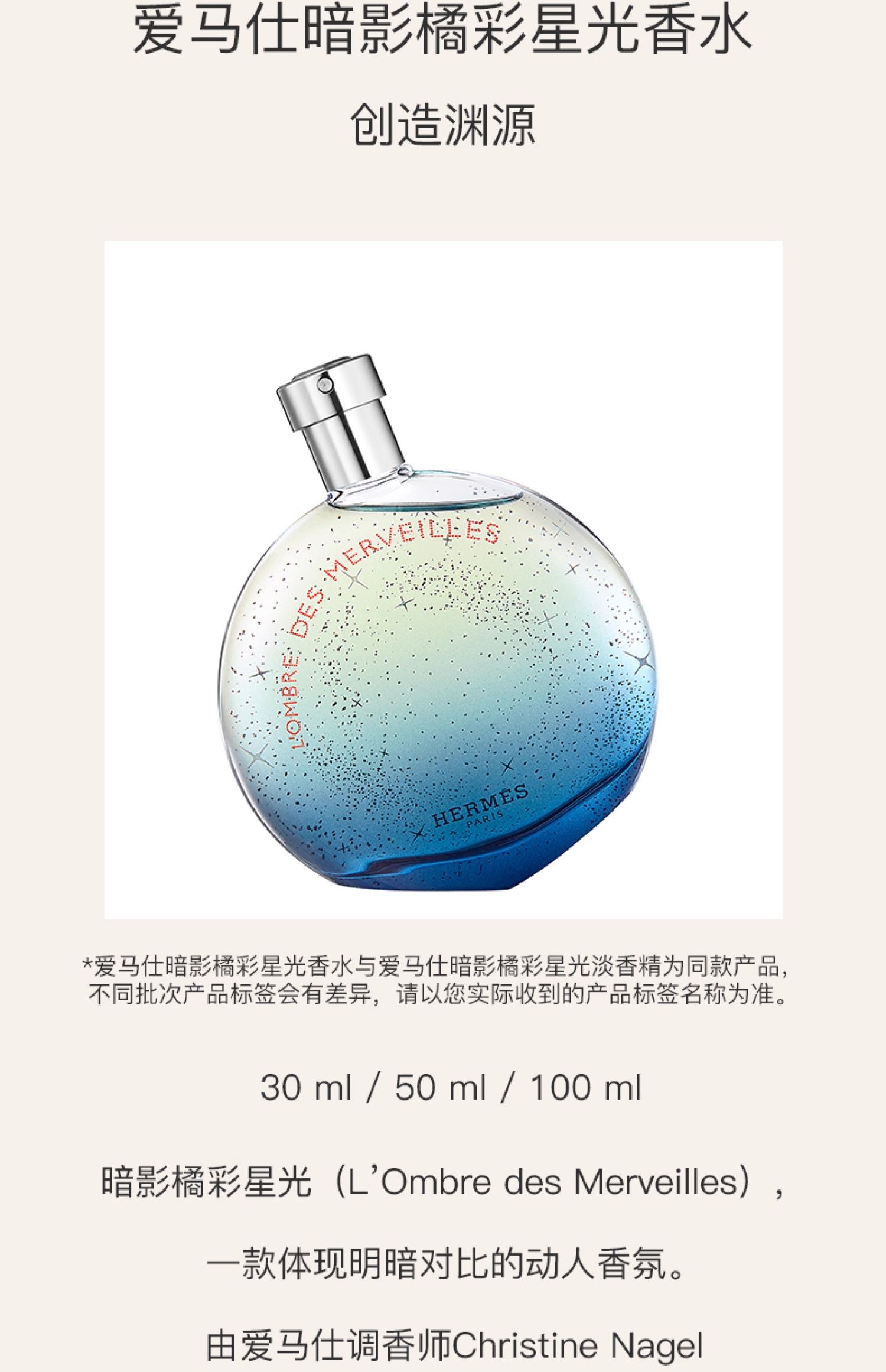 【保税直邮 义乌海关】HERMES爱马仕 EDT蓝色橘彩星光淡香水100ml/瓶