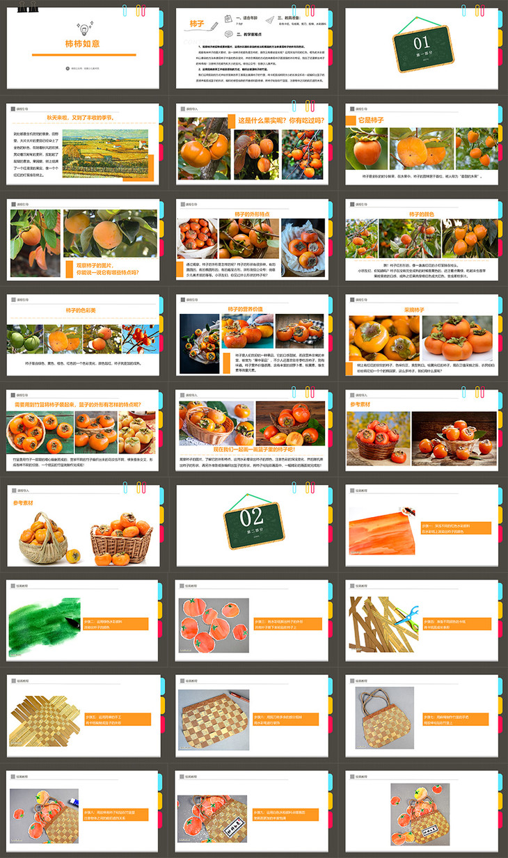 我们运用剪贴的方式并结合简单的手工表现出装满柿子的竹筐,将卡纸剪成相同大小的长条交织在一起编织出篮子的质感并裁剪成篮子的形状,编织时感受线条的节奏感和韵律感,将柿子粘贴在竹篮里,注意物体之间的前后遮挡关系。