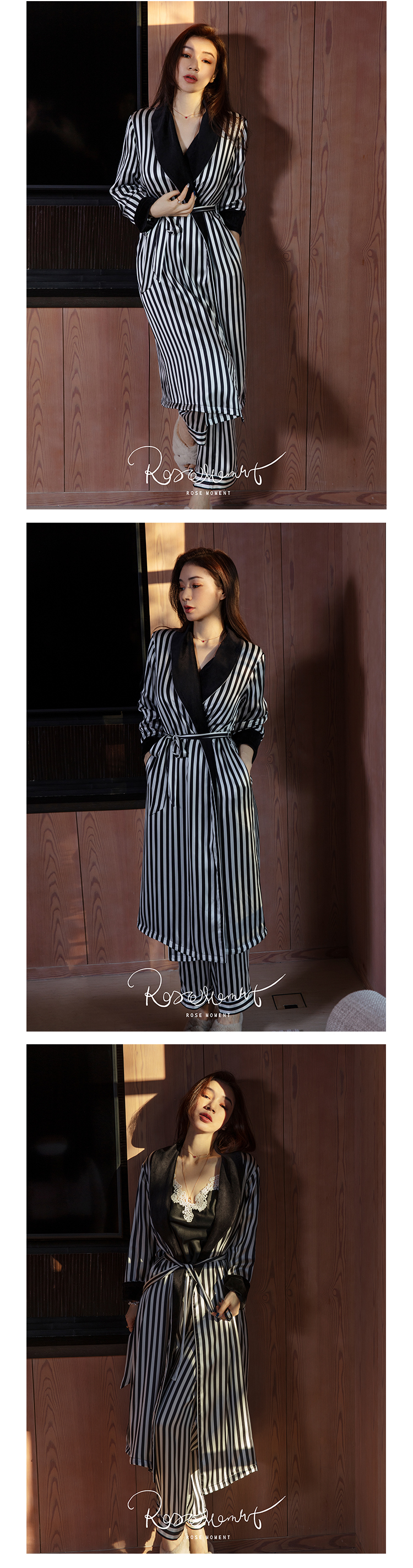 丝绒翻领珍珠装饰边黑白条印花真丝长袍 P02549