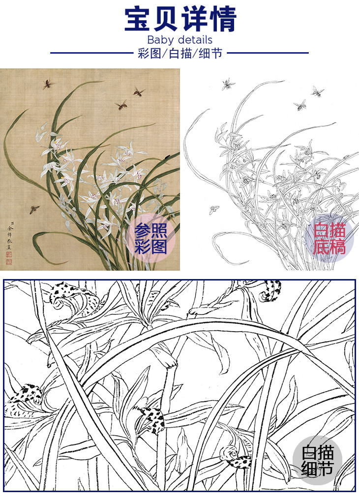 横幅工笔花鸟白描底稿-兰花-周中耀《二君子图》-多种白描尺寸可选-ZT14