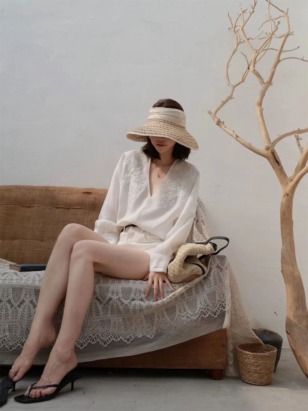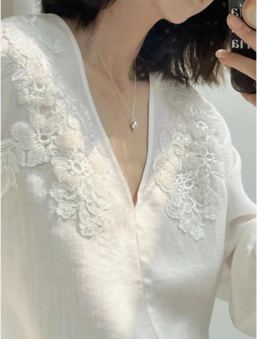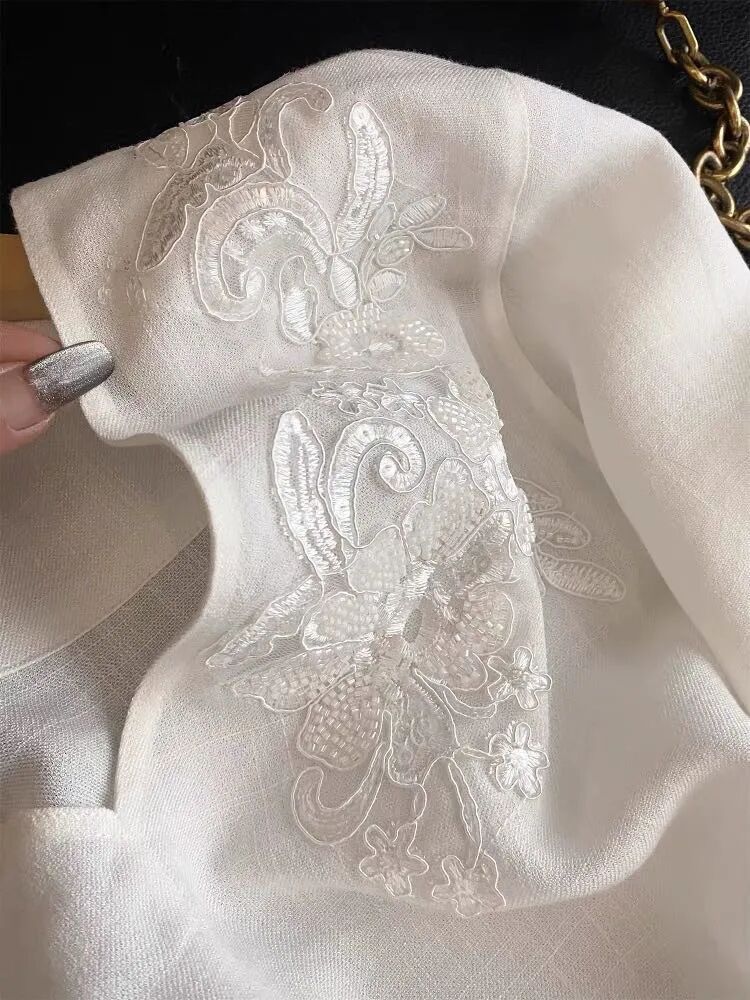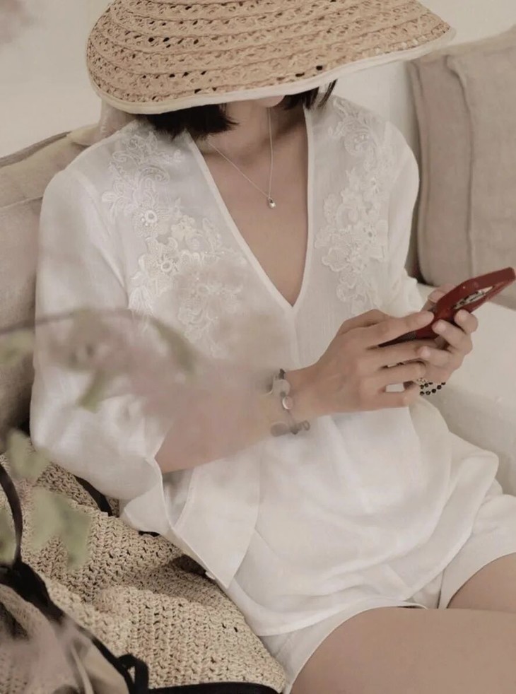 好是好,不便宜,一件要400+,掌柜也买了一件回来穿,实在是喜欢不得了,就想着给大家推荐,火速联系了我们合作很久的供应商伊泺杉,打磨出来这一件属于我们自己的—— 法式刺绣仿苎麻V领上衣。