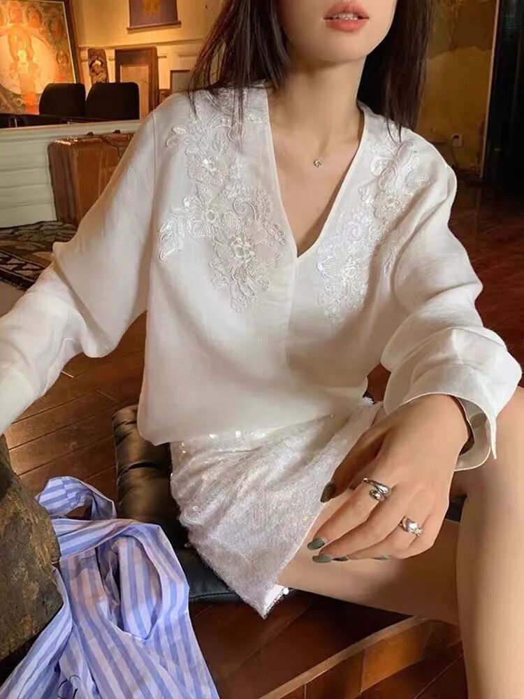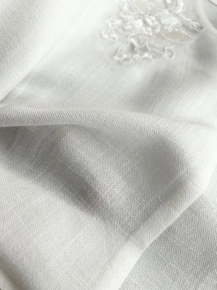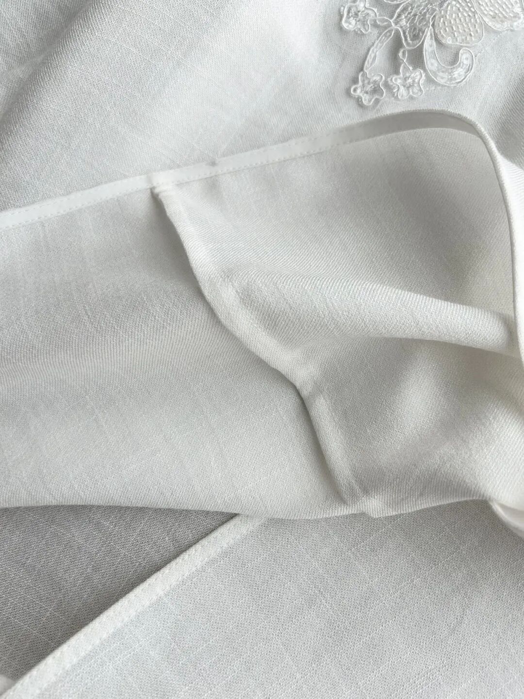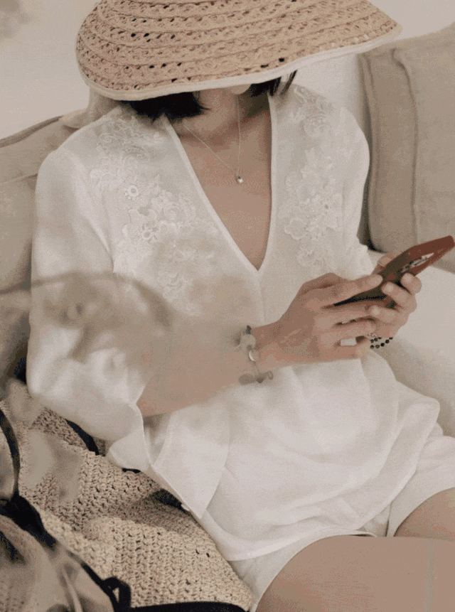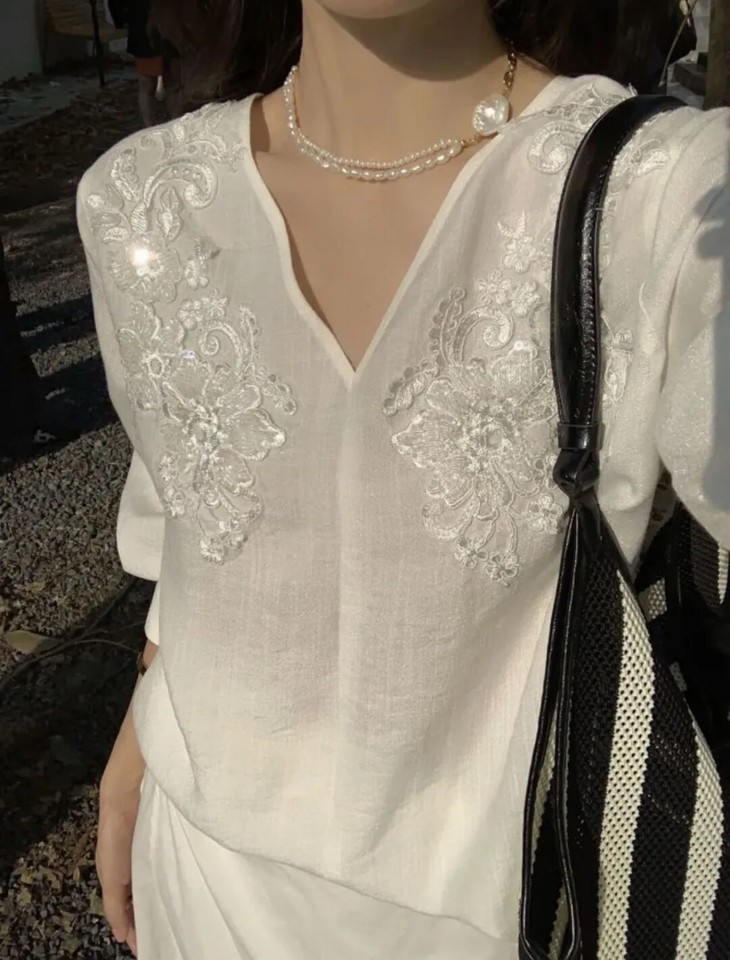 好是好,不便宜,一件要400+,掌柜也买了一件回来穿,实在是喜欢不得了,就想着给大家推荐,火速联系了我们合作很久的供应商伊泺杉,打磨出来这一件属于我们自己的—— 法式刺绣仿苎麻V领上衣。