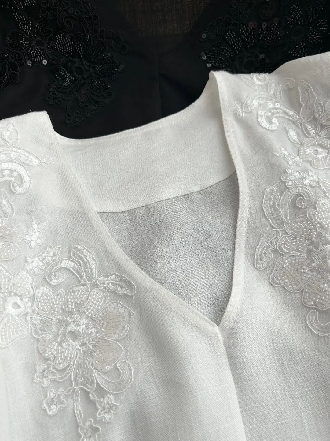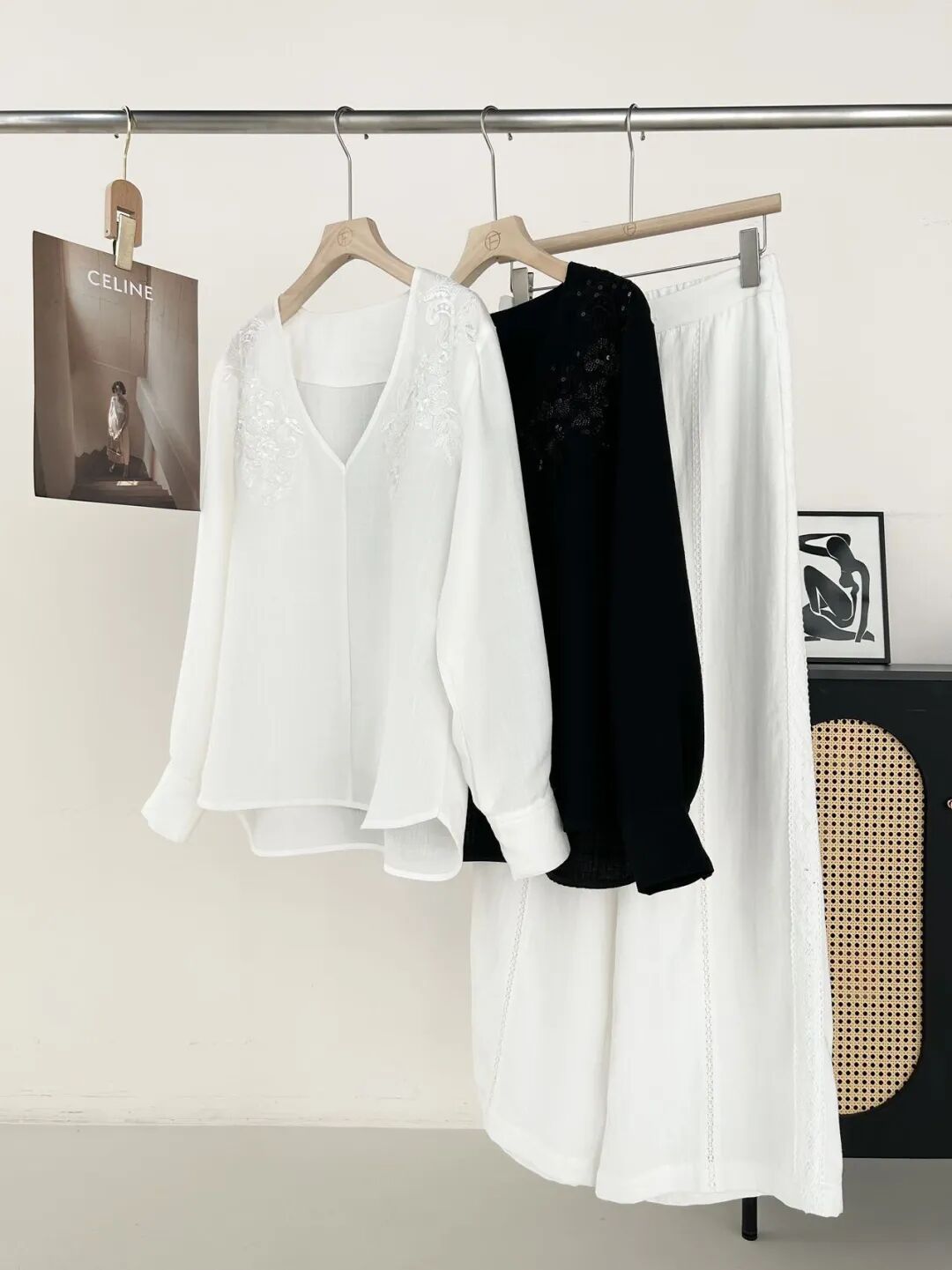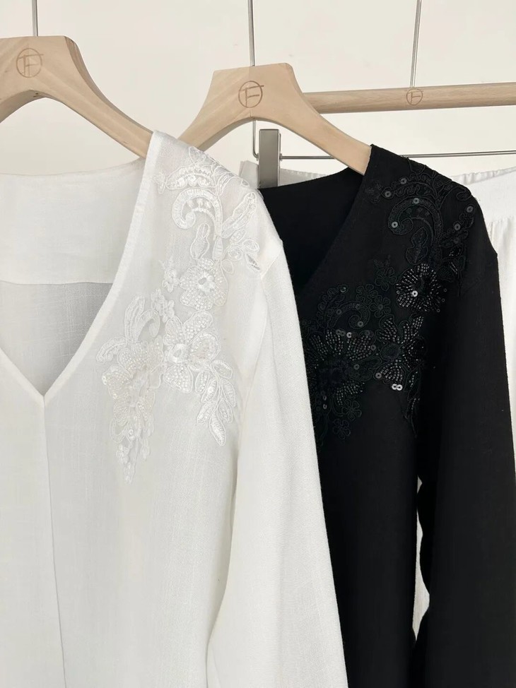 品牌:伊泺杉 品名:法式刺绣仿苎麻V领上衣 材质:72%人棉+24%锦纶+4%涤纶 颜色:黑色、白色 尺码:S-L