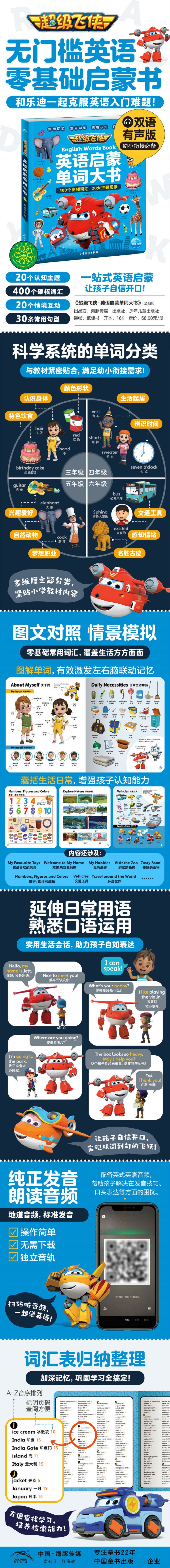 《超级飞侠英语启蒙单词大书》是一册专为学龄前儿童打造的英语词汇学习用书。本书精选了近400个常用词汇,以深受孩子喜爱的超级飞侠形象为素材,将单词与形象生动的图片和贴近生活的情景结合,并用方便记忆的图文编排形式,能激发孩子的联想能力,帮助孩子熟悉相应的英语表达,减轻认知和识记难度。