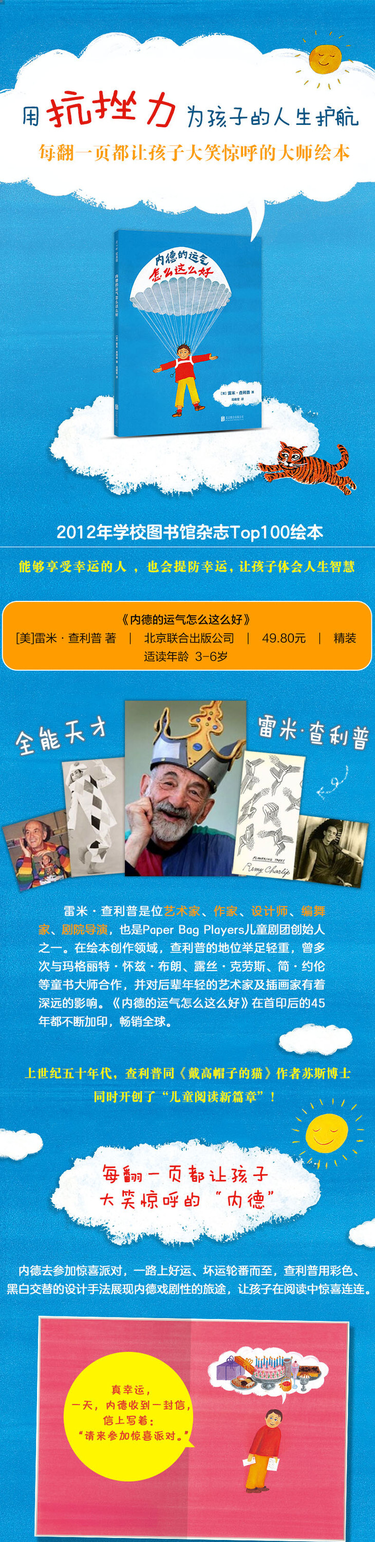 艺术家、作家、设计师、编舞家、剧院导演,THE PAPER BAG PLAYERS儿童剧团创始人之一。该剧团成立60年来,获得过奥比奖、纽约艺术奖、百老汇戏剧学院戏剧奖等众多奖项。在绘本创作领域,雷米·查利普的地位也举足轻重,他曾多次与知名作家,包括玛格丽特·怀兹·布朗、露丝·***、简·约伦等合zuo,并对后辈年轻的艺术家及插画家有着深远的影响。《内德的运气怎么这么好》出版至今不断加印,深受孩子的喜欢。