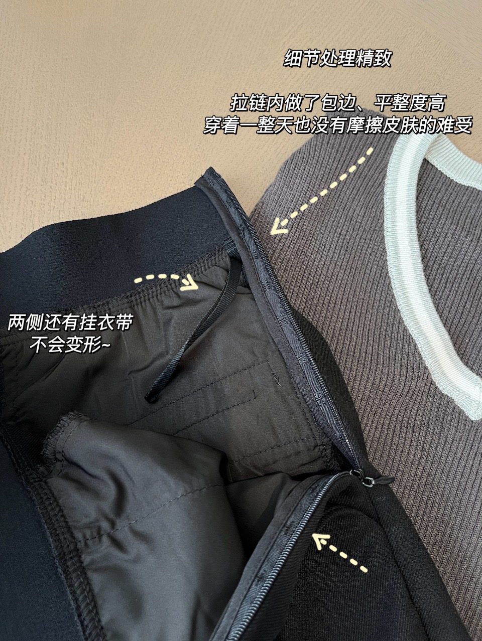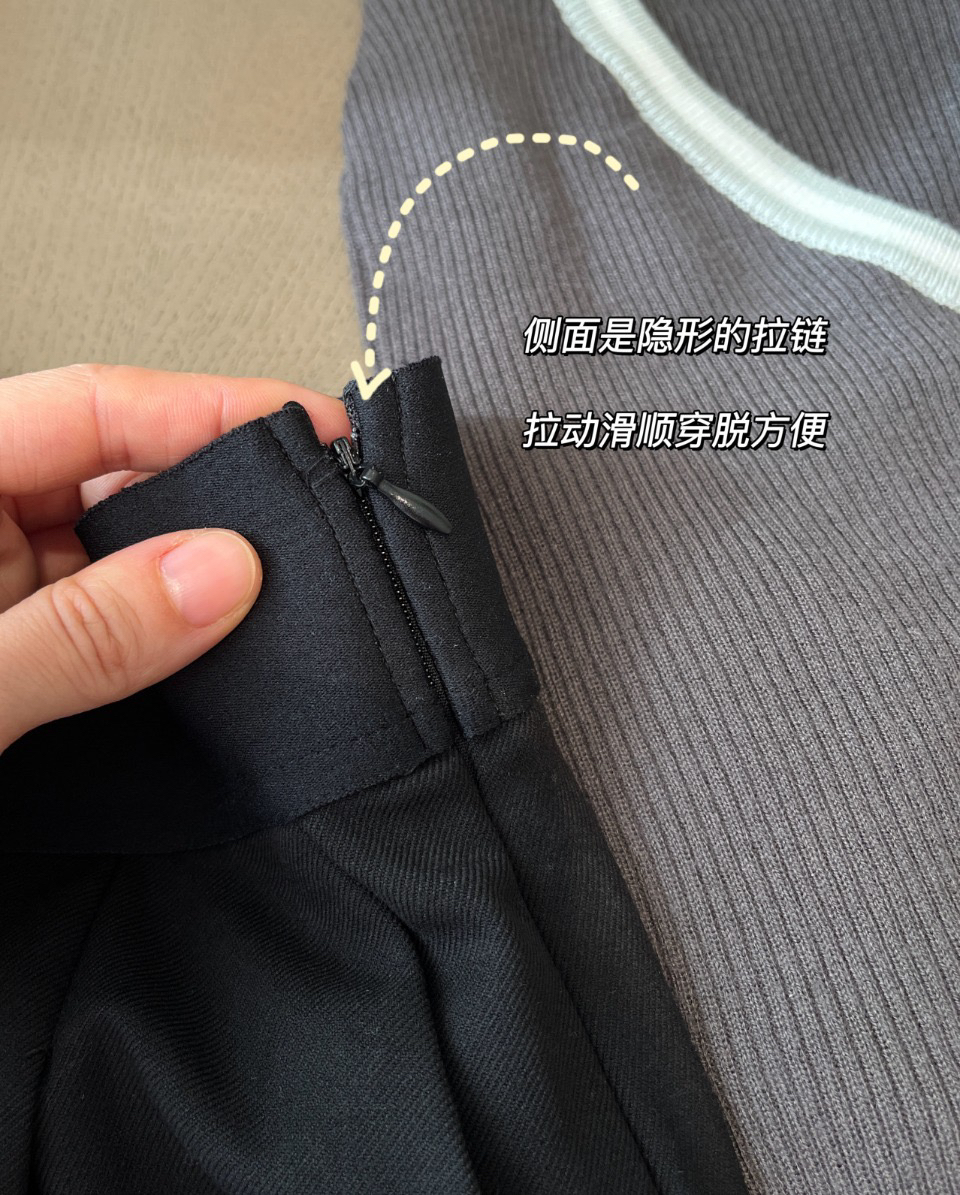 侧面是隐形的拉链,拉动滑顺穿脱方便细节处理精致,拉链内做了包边、平整度高,穿着一整天也没有摩擦皮肤的难受,两侧还有挂衣带,不会变形~