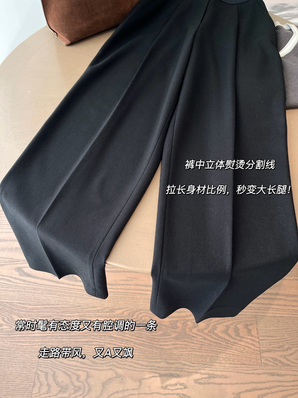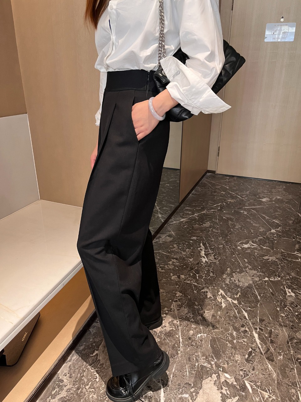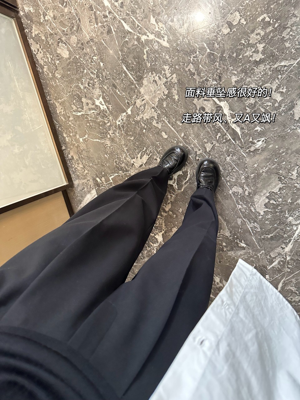 模特身高168/100斤,身上穿的是S码效果,腰围合适,臀围松弛感很好,及脚面裤长,松量宽阔但不拖沓,配衬衫/西装/风衣/针织衫类都很match~可正式可休闲!