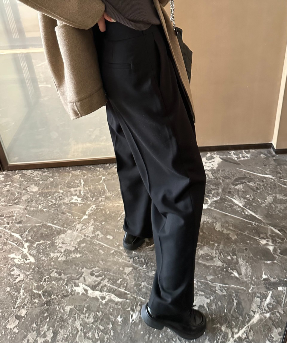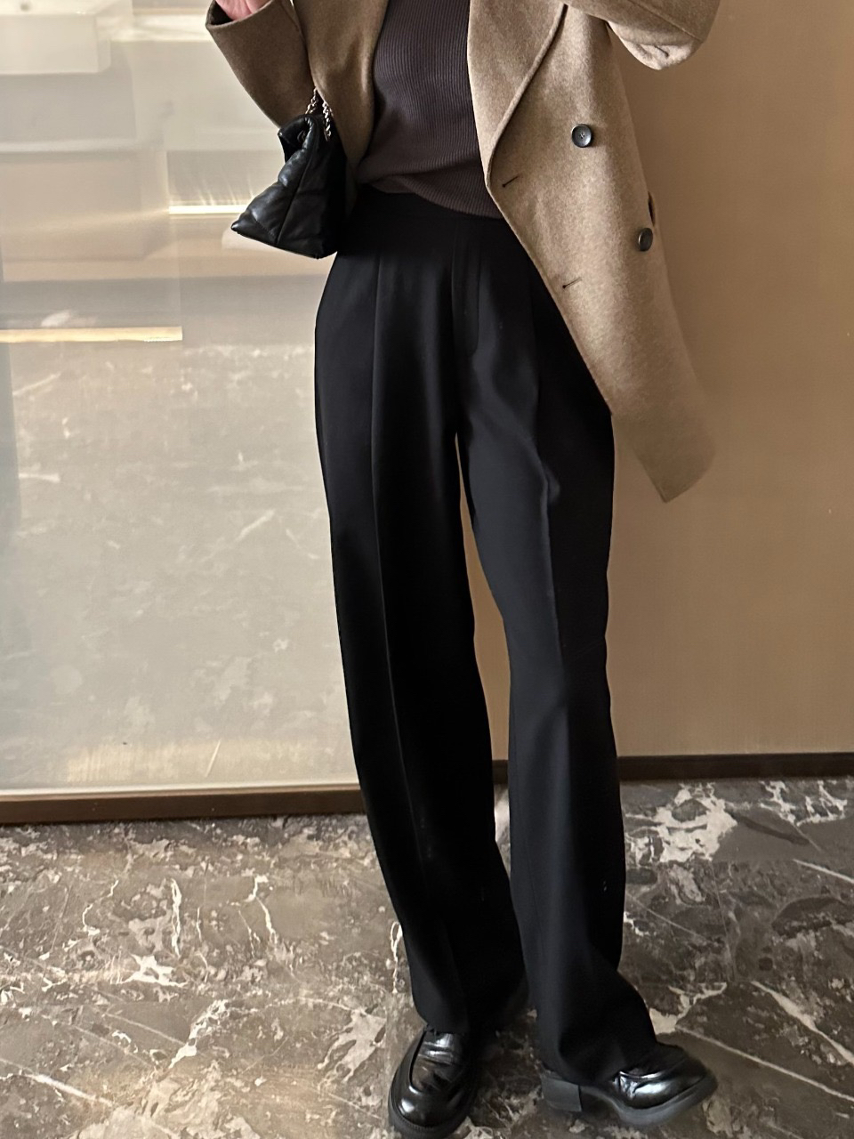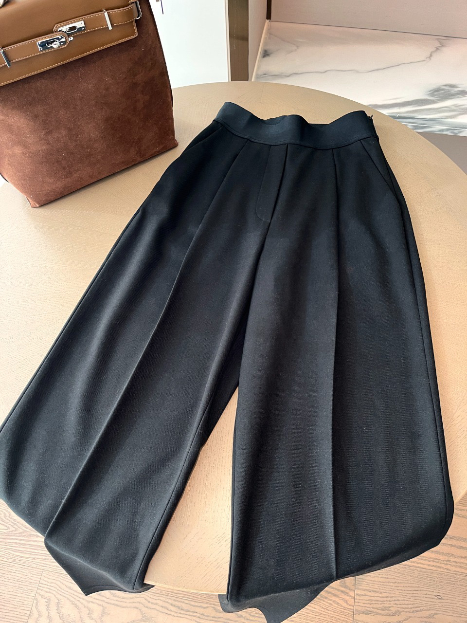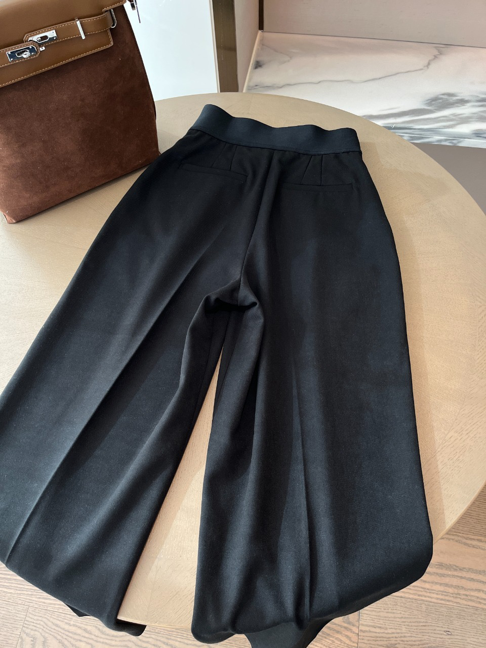 模特身高168/100斤,身上穿的是S码效果,腰围合适,臀围松弛感很好,及脚面裤长,松量宽阔但不拖沓,配衬衫/西装/风衣/针织衫类都很match~可正式可休闲!