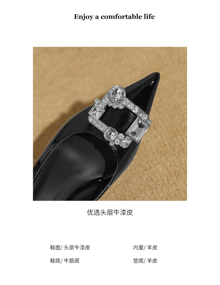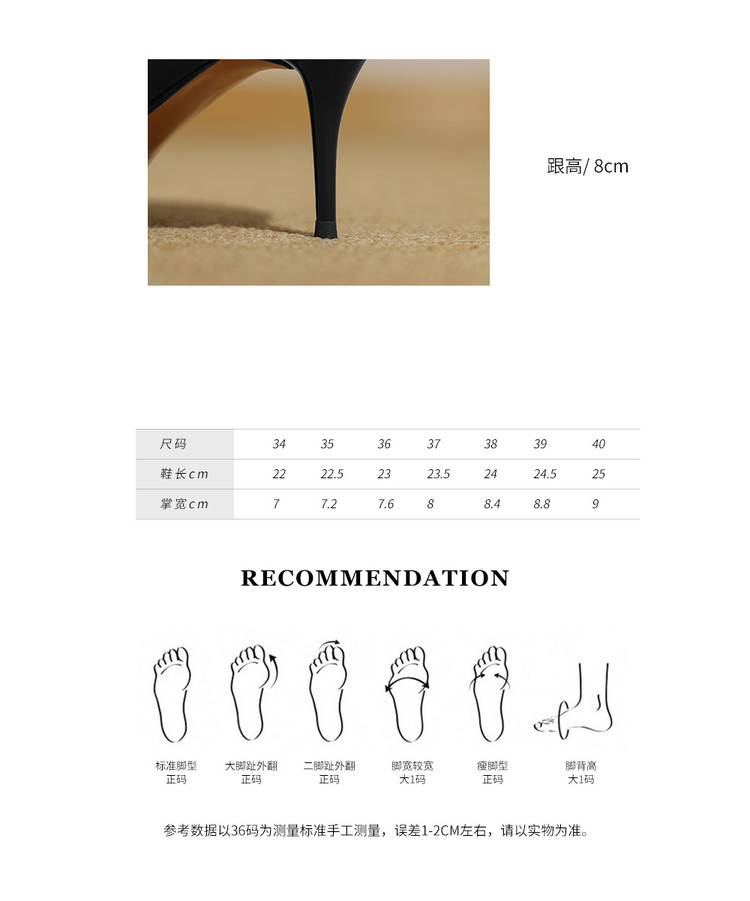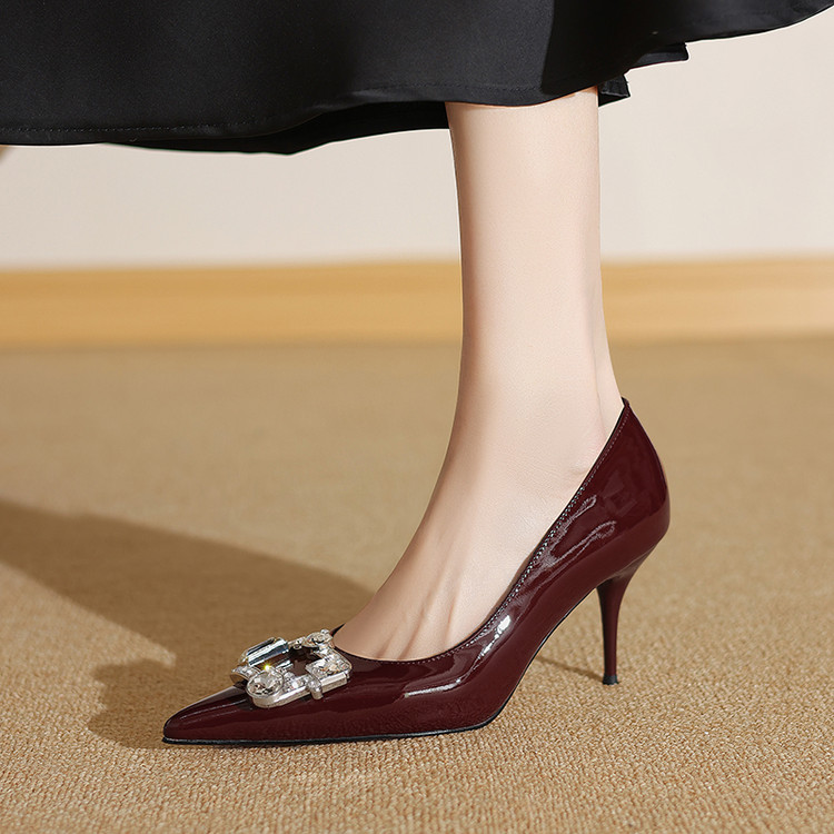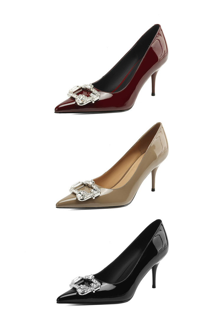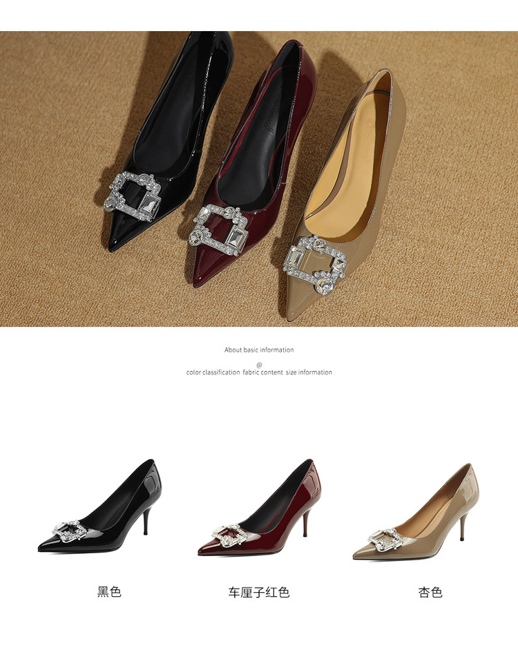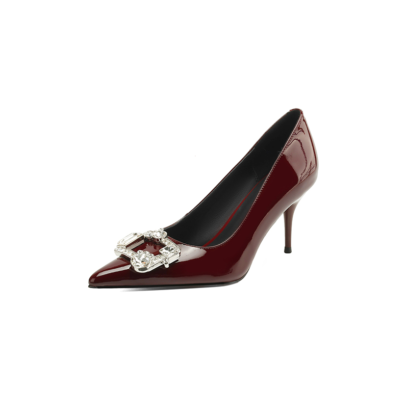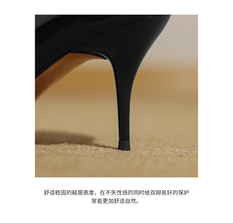 货号:25069帮面材质: 头层牛漆皮内里材质:羊皮鞋垫材质:羊皮鞋底材质:牛筋底颜色:黑色/车厘子红/杏色跟高:8CM掌宽:8CM尺码:34-39