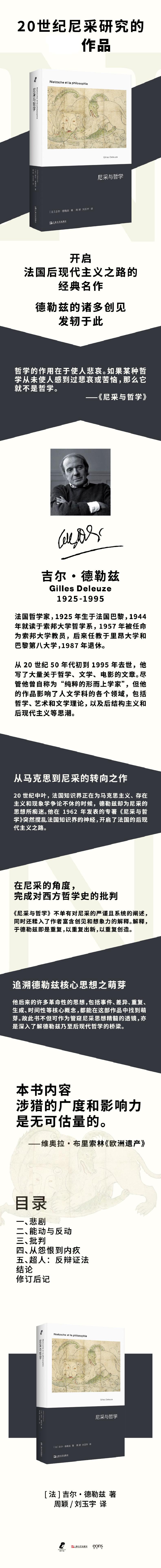 20世纪中叶,法国知识界正在为马克思主义、存在主义和现象学争论不休的时候,德勒兹却为尼采的思想所痴迷。他在1962年发表的专著《尼采与哲学》突然搅乱法国知识界的神经,开启了法国的后现代主义之路。《尼采与哲学》不单有对尼采的严谨且系统的阐述,同时还糅入了作者富含创见和想象力的解释。解释,于德勒兹即是重复,以重复出新,以重复创造。他后来的许多革命性的思想,包括事件、差异、重复、生成、时间性等核心概念,都能在这部作品中找到萌芽。故此书不但可作为管窥尼采思想精髓的透镜,亦是深入了解德勒兹乃至后现代哲学的桥梁。