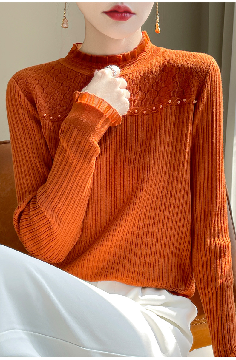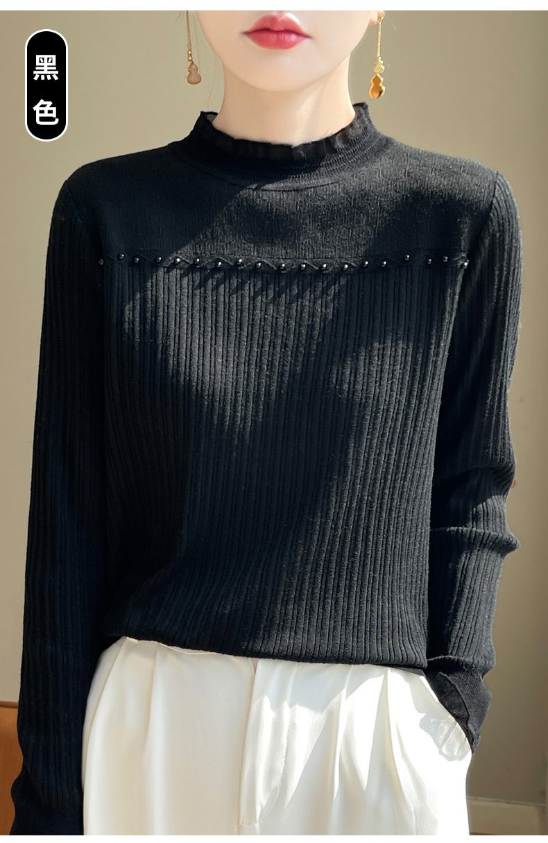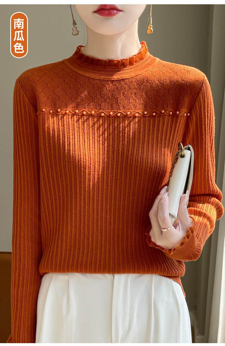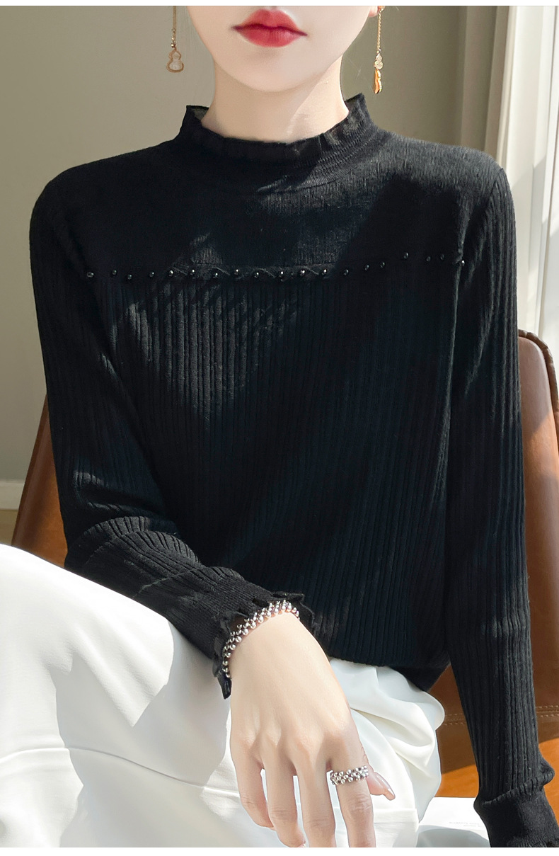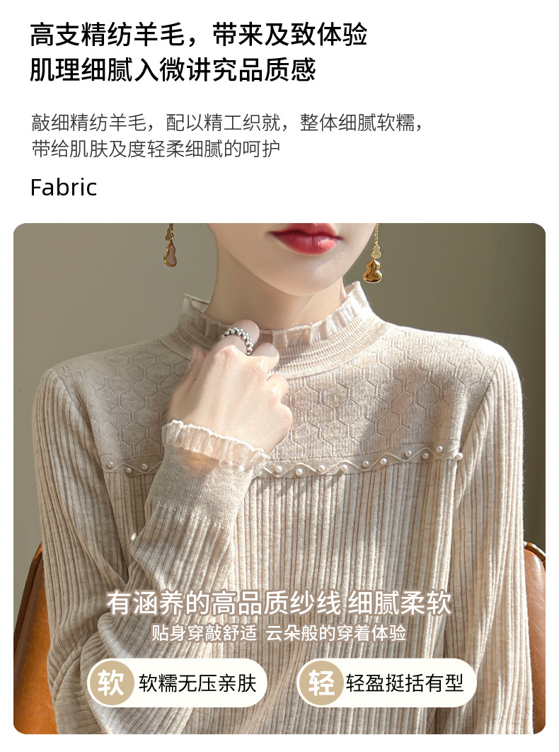 QHJY-JY1115精纺半高领羊毛衫女蕾丝花边镂空提花长袖针织毛衣钉珠打底衫上衣