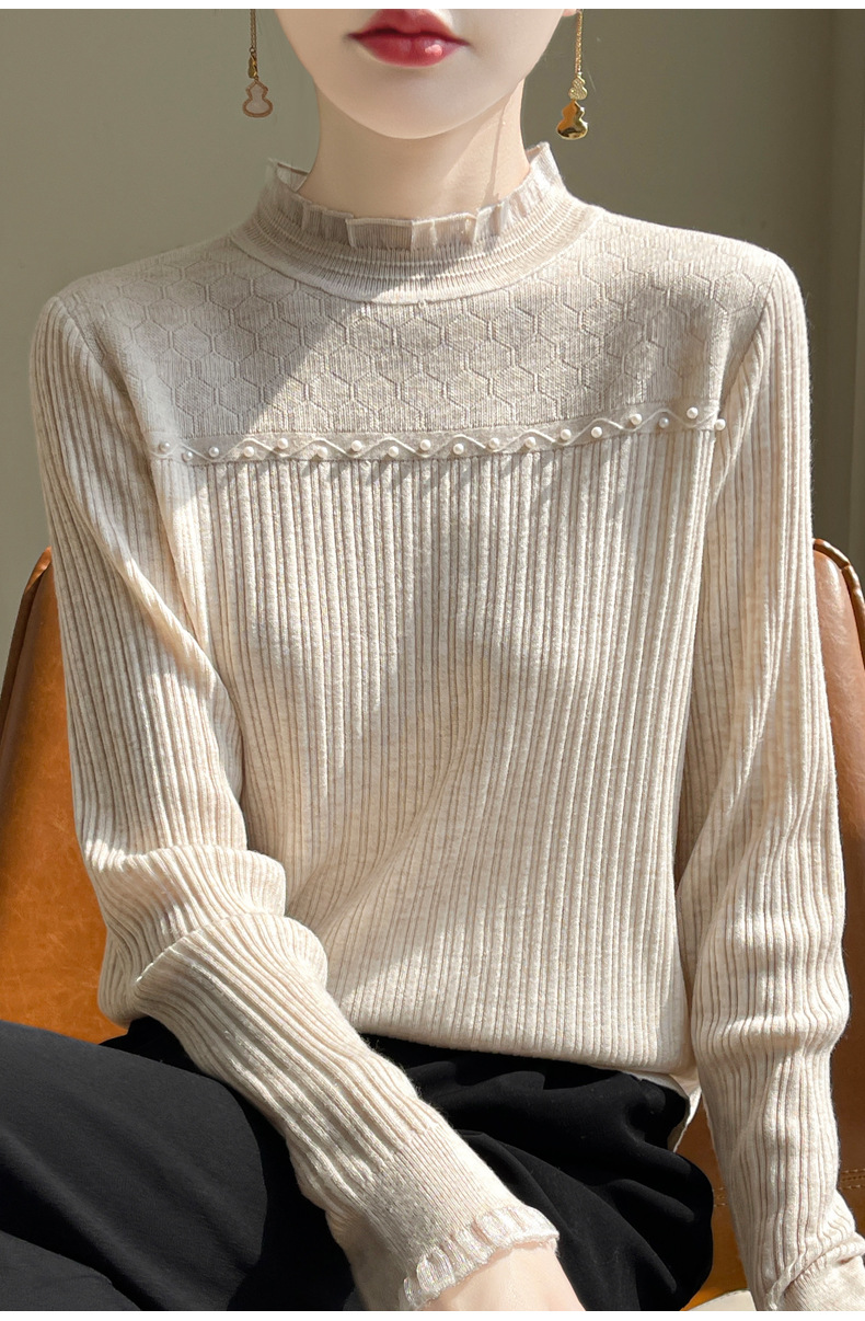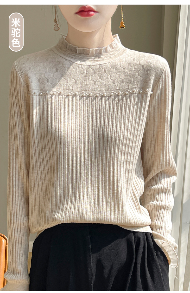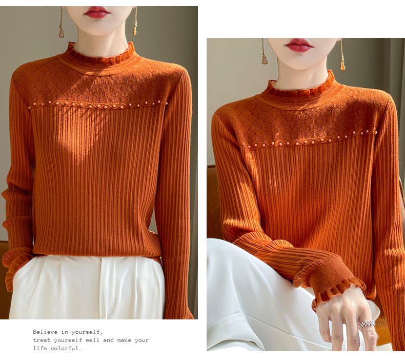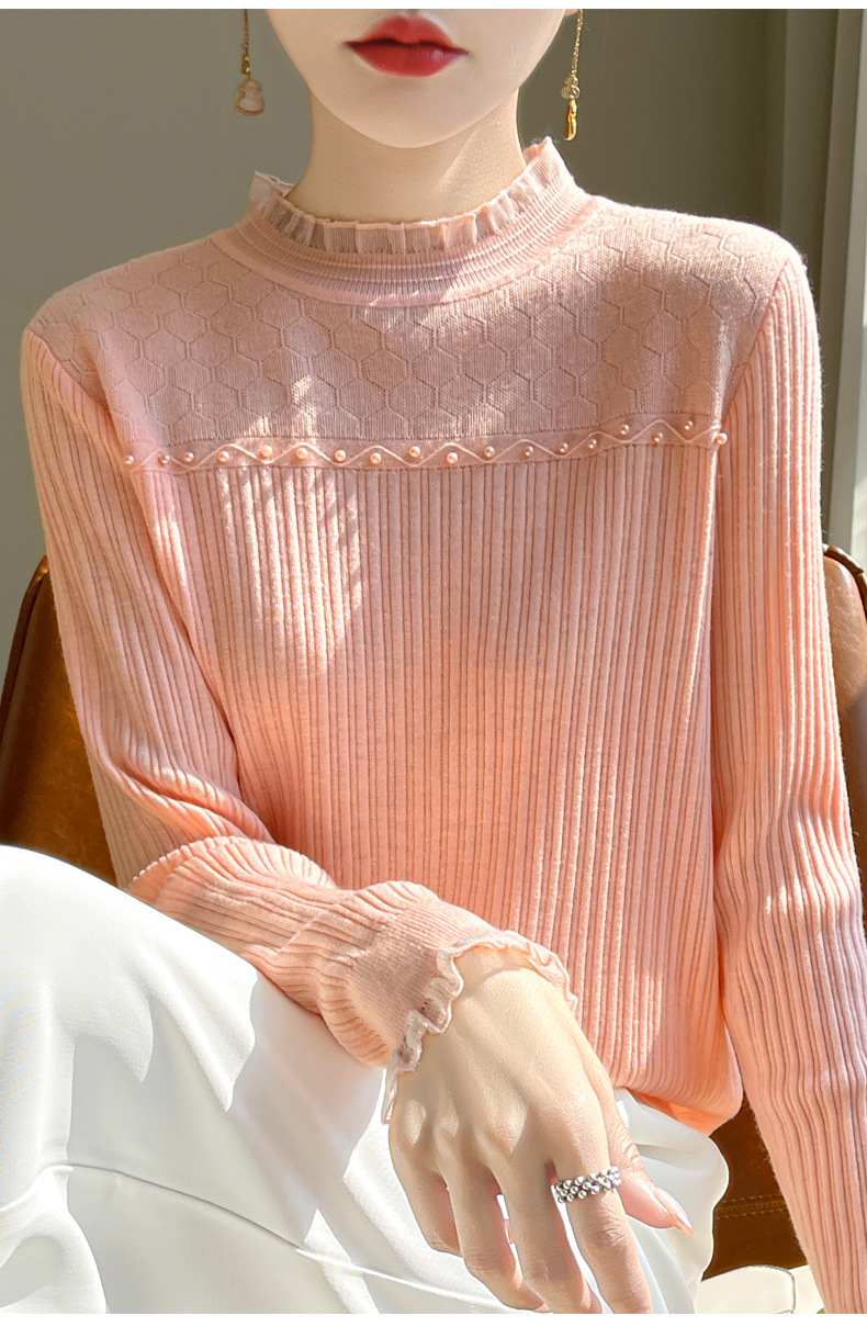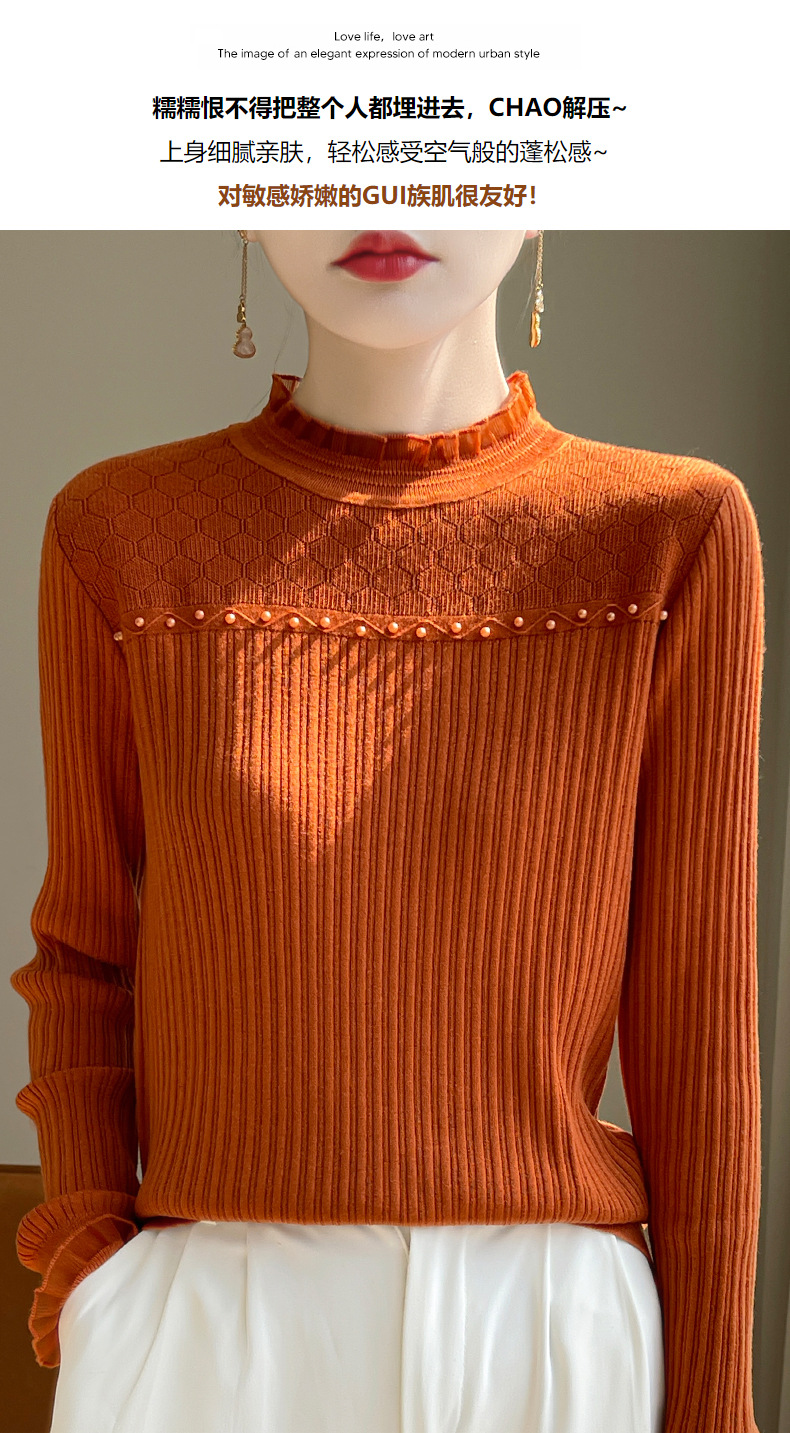 QHJY-JY1115精纺半高领羊毛衫女蕾丝花边镂空提花长袖针织毛衣钉珠打底衫上衣
