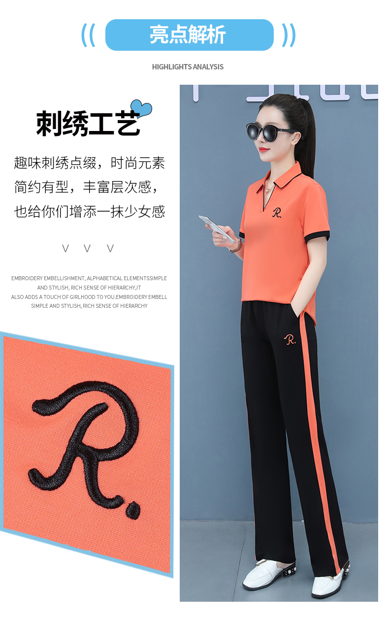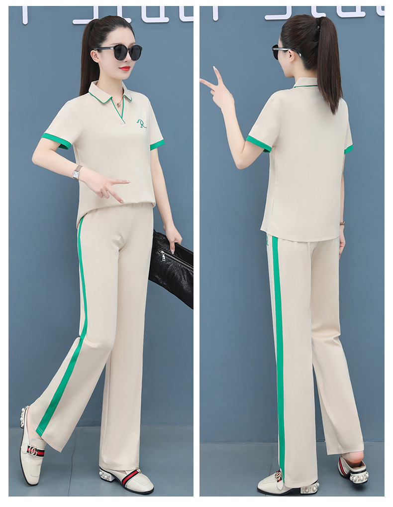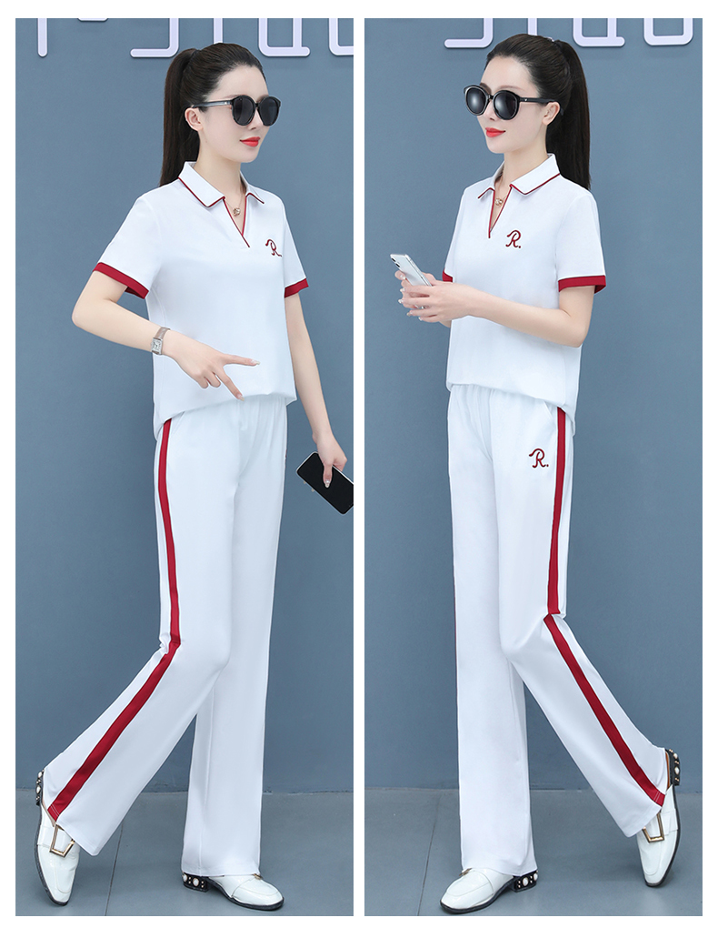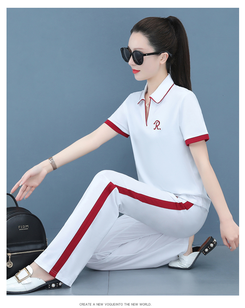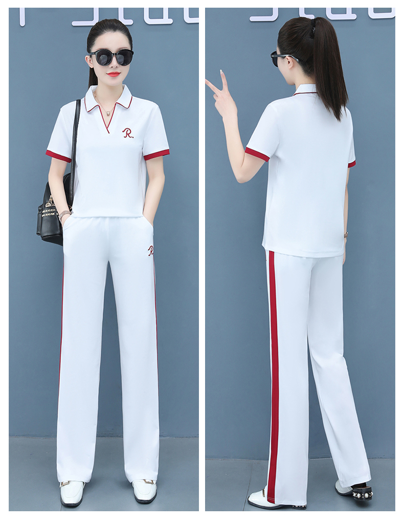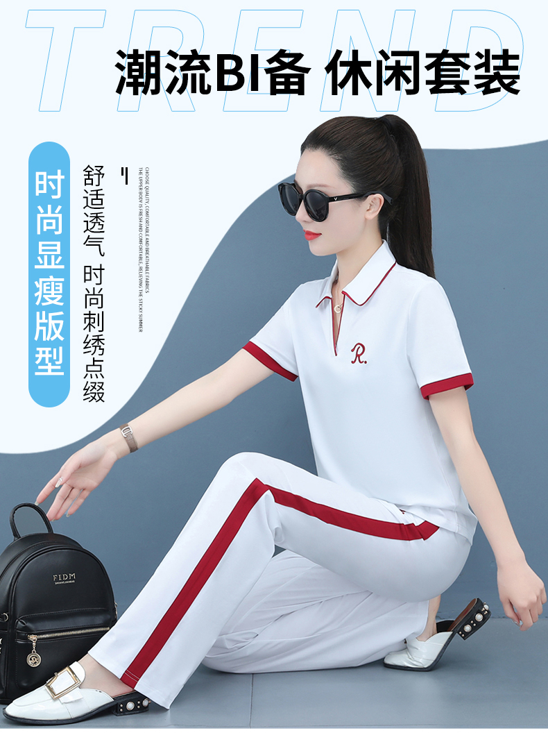 SP-103-23119X翻领休闲运动服套装女士2023年夏季新款刺绣减龄白色阔腿裤两件套