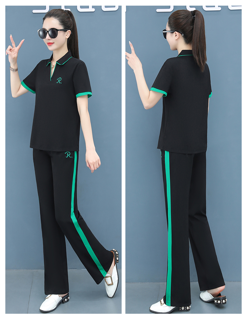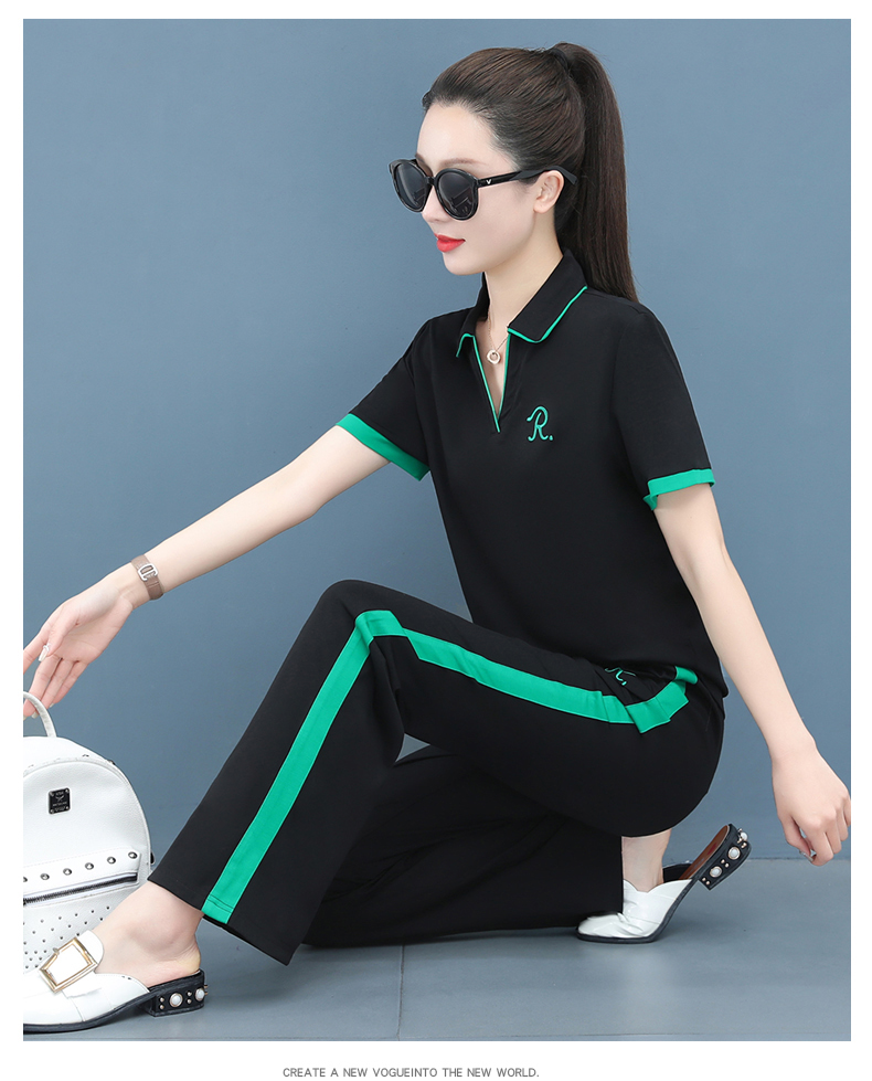 翻领休闲运动服套装女士2023年夏季新款刺绣减龄白色阔腿裤两件套