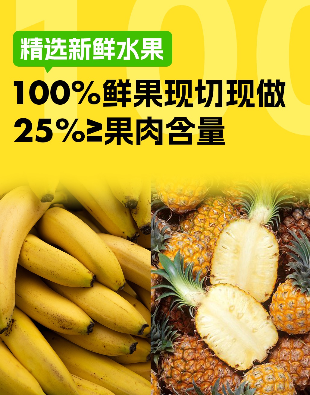 一、💯%鲜果现切现做,确保果肉含量超过25%,让每一口都充满自然的甜香🍌🍍。