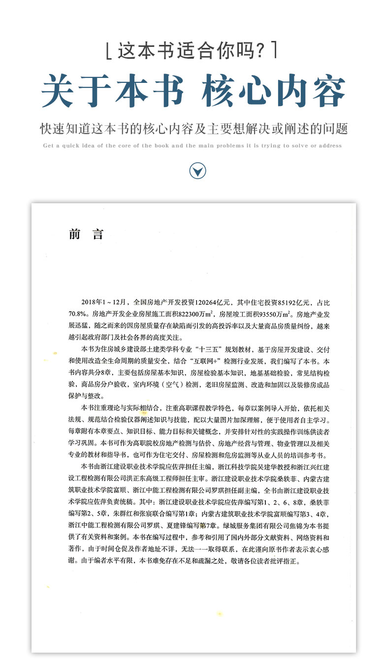本教材是住房城乡建设部土建类学科专业“十三五”规划教材,基于房屋开发建设、交付和使用改造全生命周期的质量安全,结合“互联网+”检测行业发展进行编写。本教材内容共分8章,主要包括房屋基本知识、房屋检验基本知识、地基基础检验、常见结构检验、商品房分户验收、室内环境(空气)检测、老旧房屋监测、改造和加固以及装修房成品保护与整改。 本书可作为高职院校房地产检测与估价、房地产经营与管理、物业管理以及相关专业的教材和指导书,也可为住宅交付、房屋检测和危房监测等从业人员培训参考书。