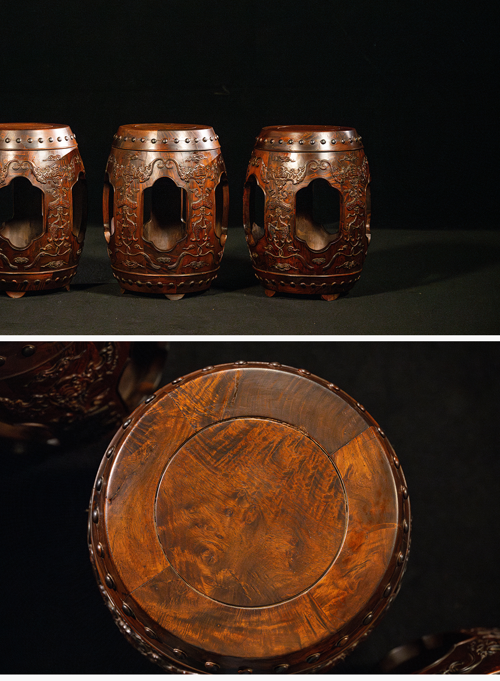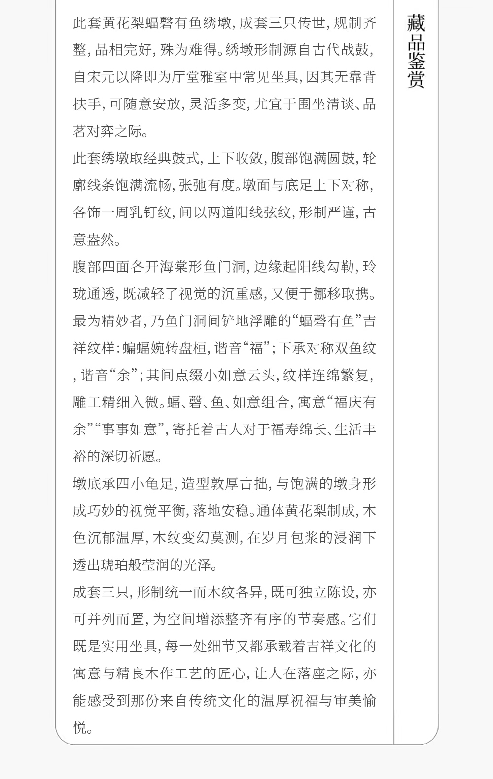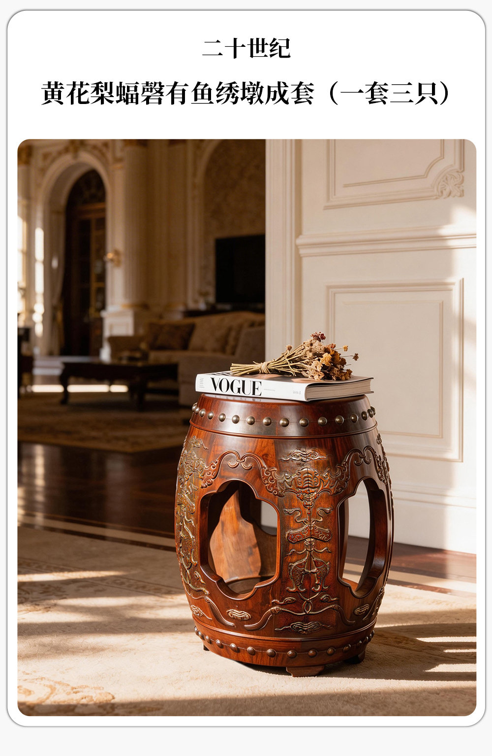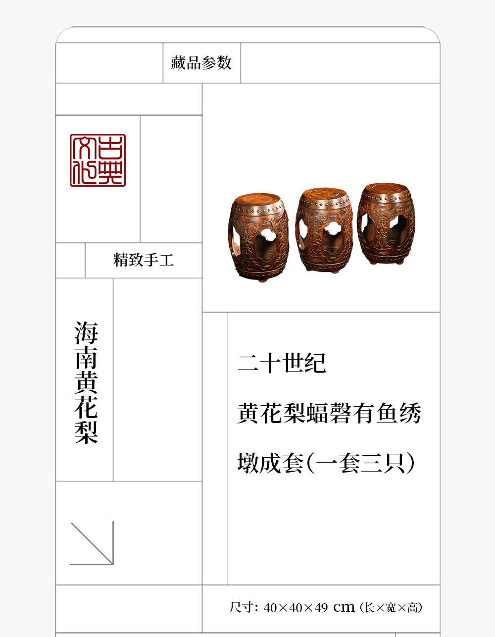 二十世纪 黄花梨蝠磬有鱼绣墩成套(一套三只)