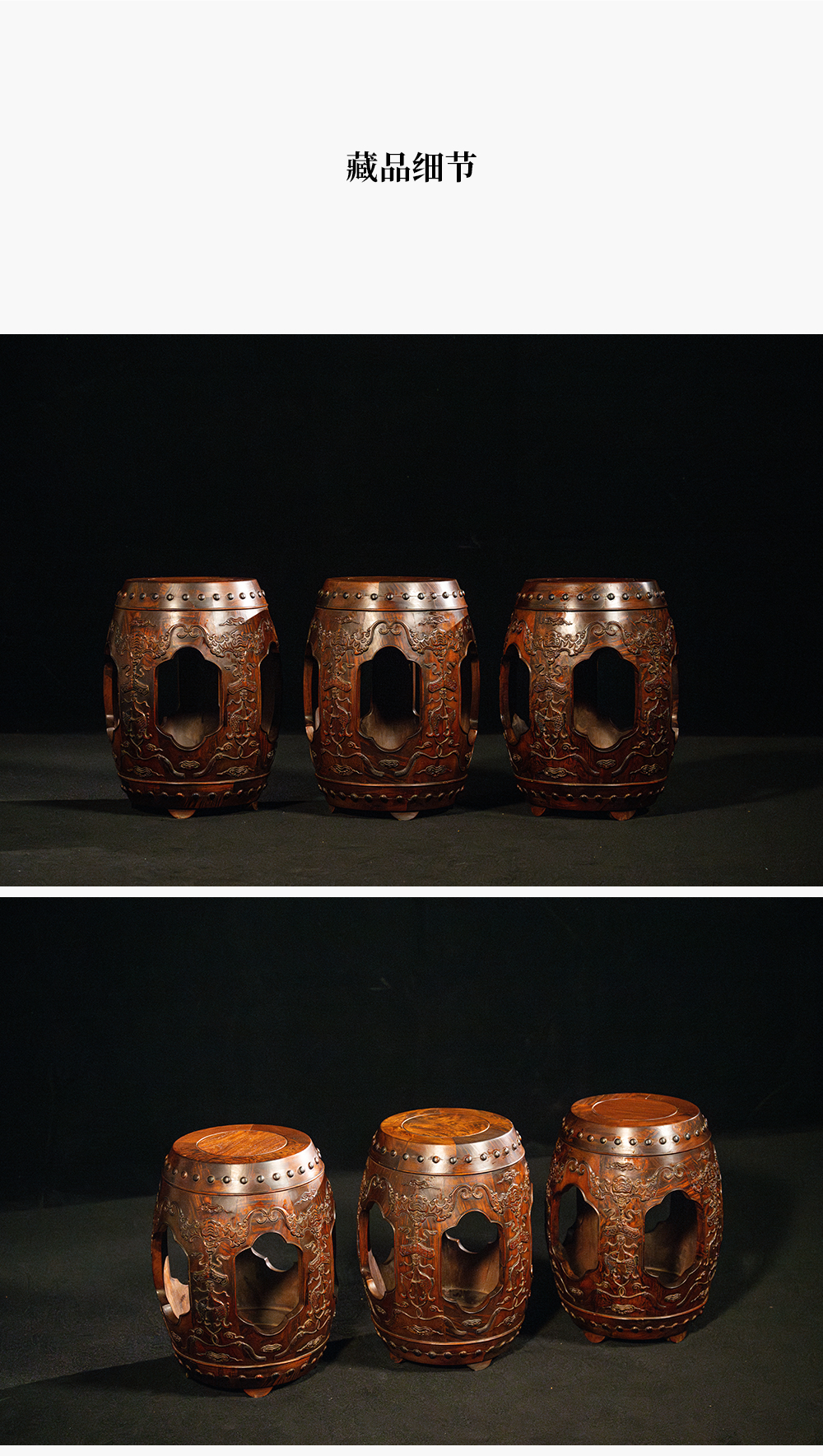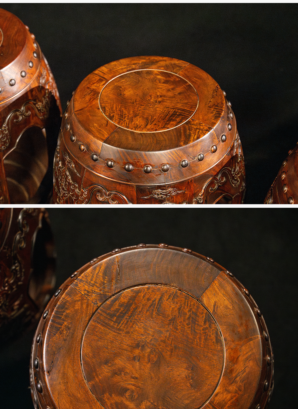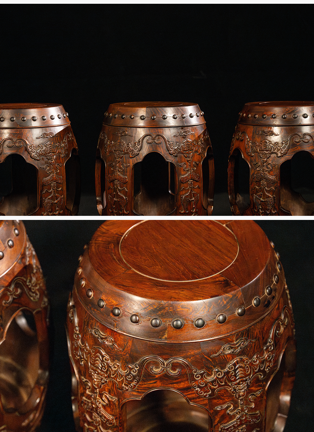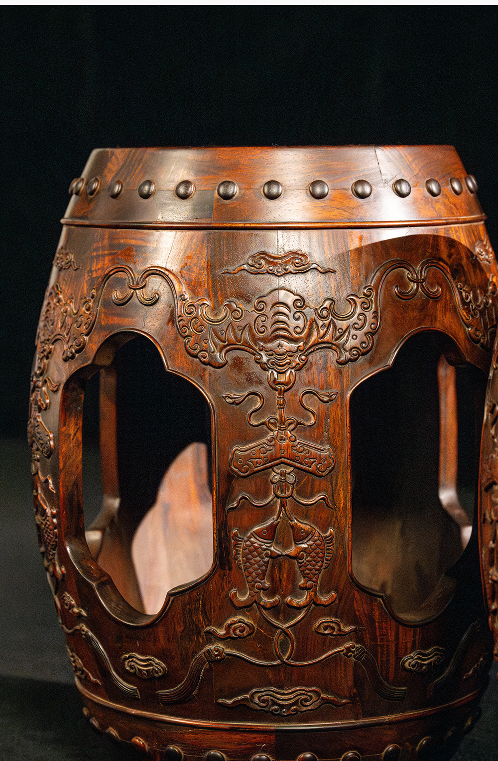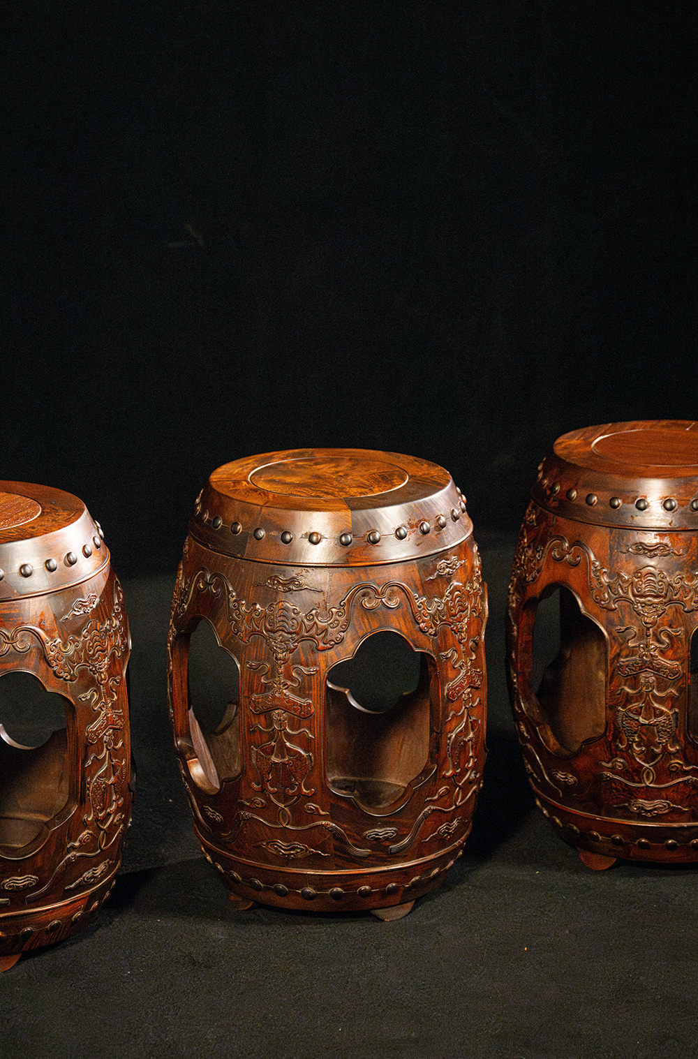 二十世纪 黄花梨蝠磬有鱼绣墩成套(一套三只)