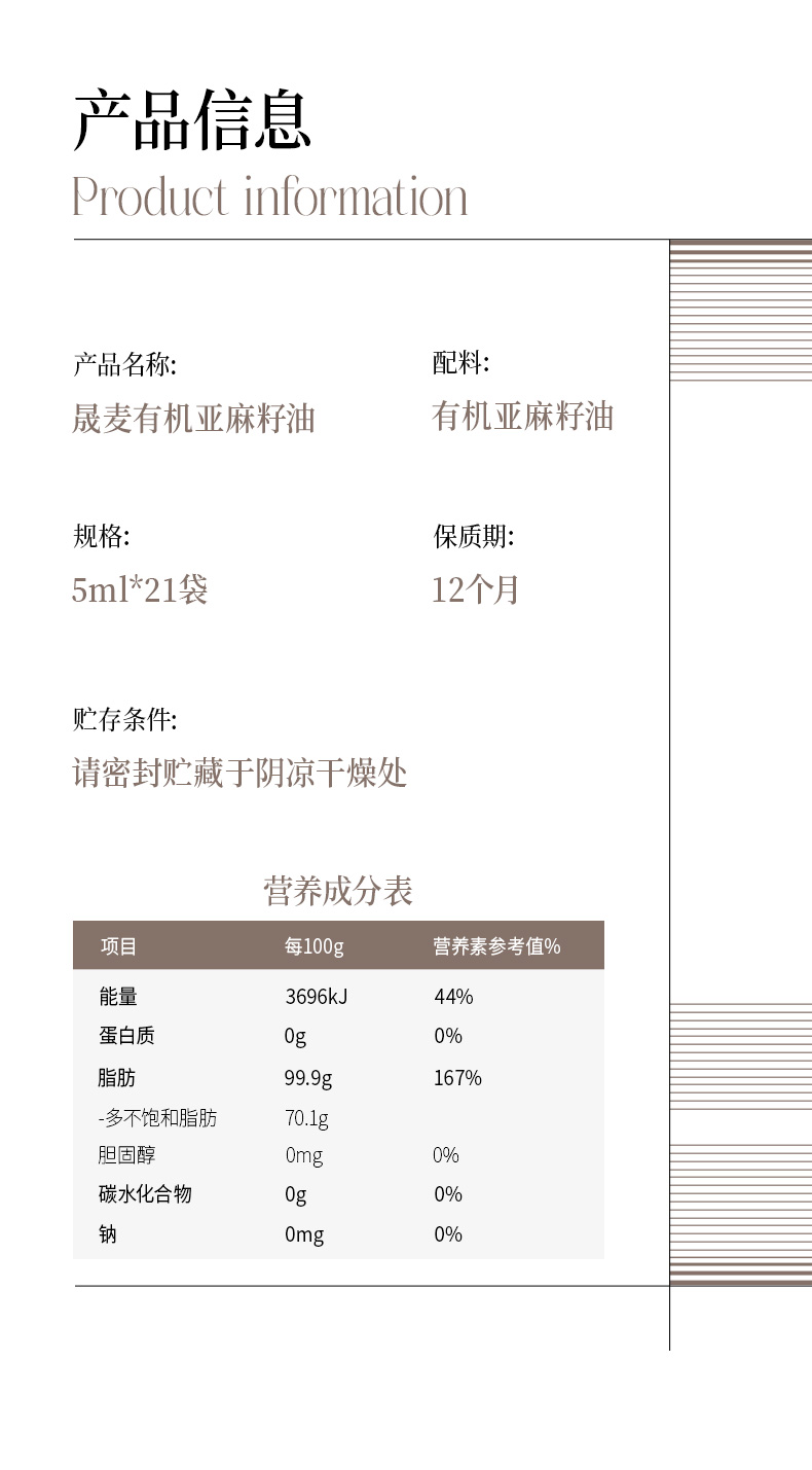 晟麦有机亚麻籽油5ml*21袋/盒