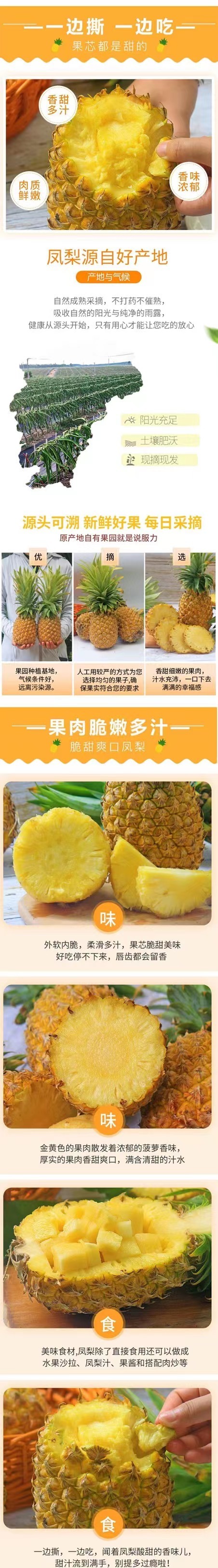 小贴士:手撕凤梨个头不大,再者现在农业发达,很多判断标准已不适用。所以以前用锯刺来判断菠萝和凤梨已经不适用了,手撕凤梨的叶子上有锯刺的(不是菠萝),收到青皮就可以吃,也可以放黄一些,不建议放太久放坏掉。