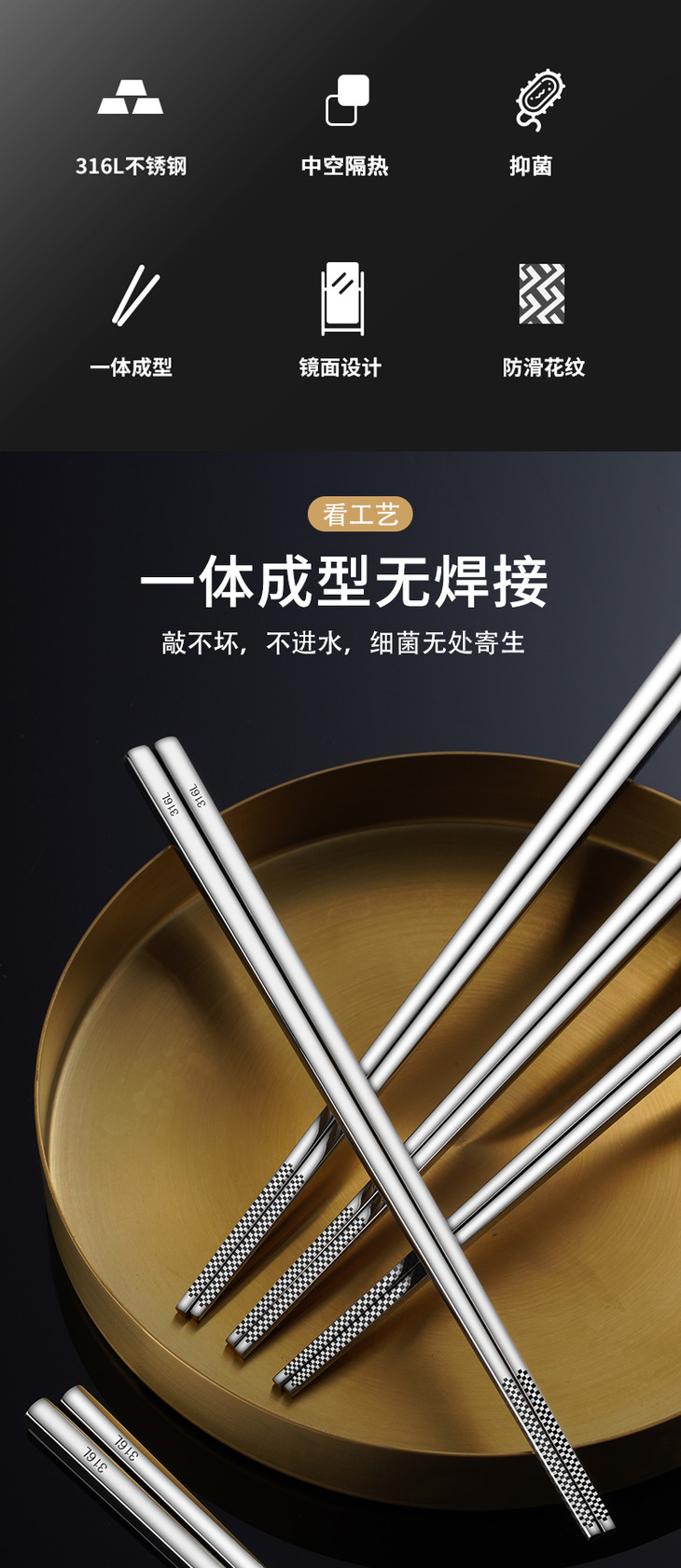 【厨具精选】不发霉 316L不锈钢筷子 防滑防霉 耐用隔热 一体成型敲不坏不进水 让家人吃的更放心