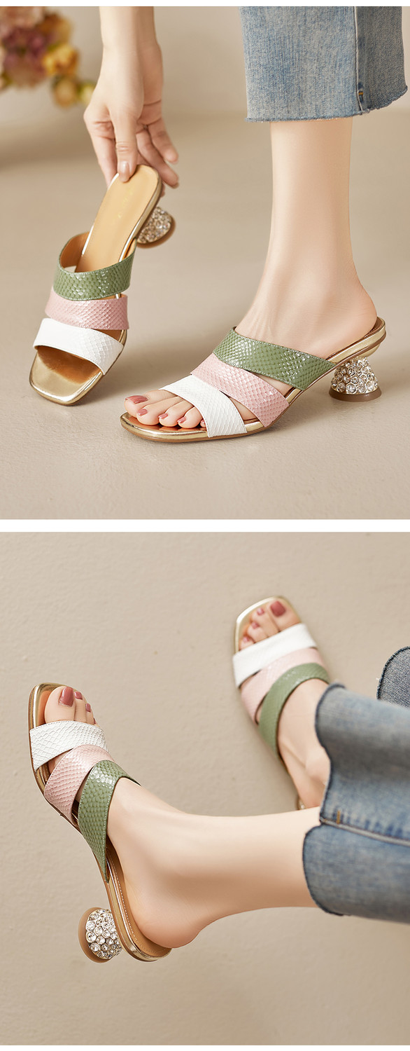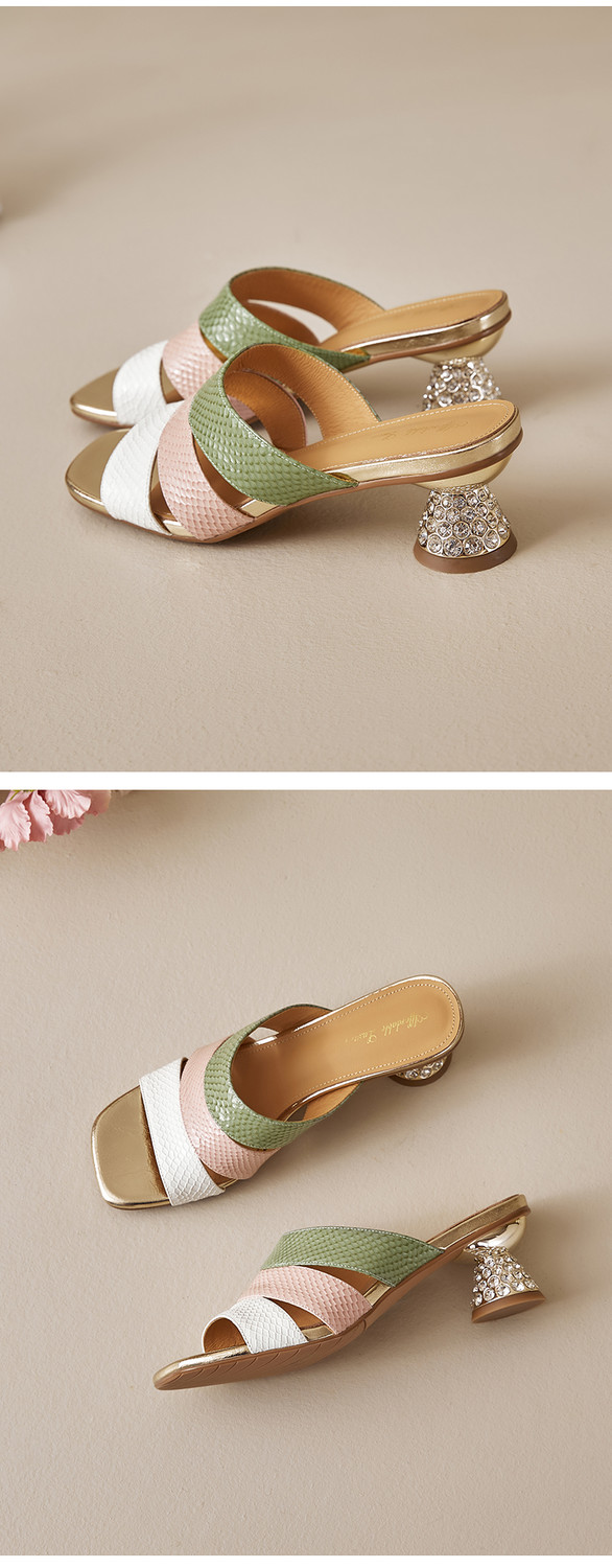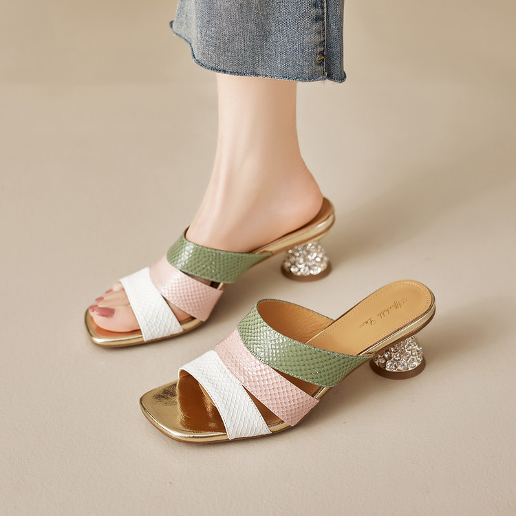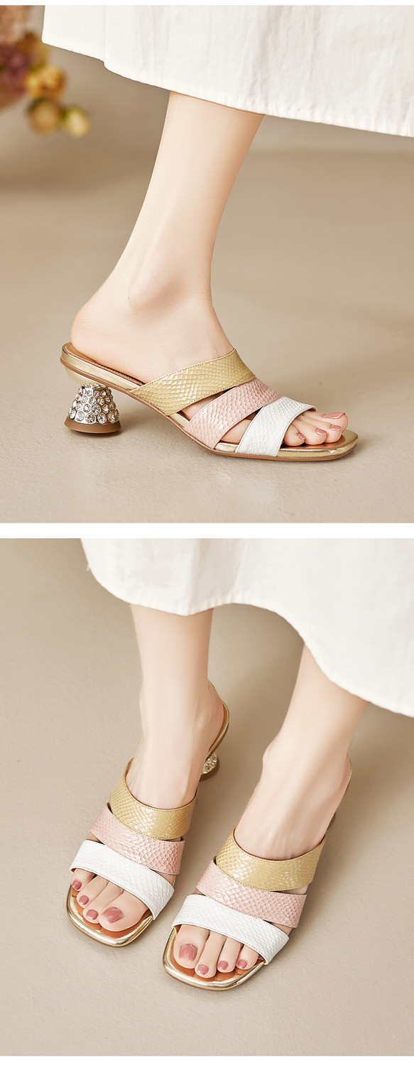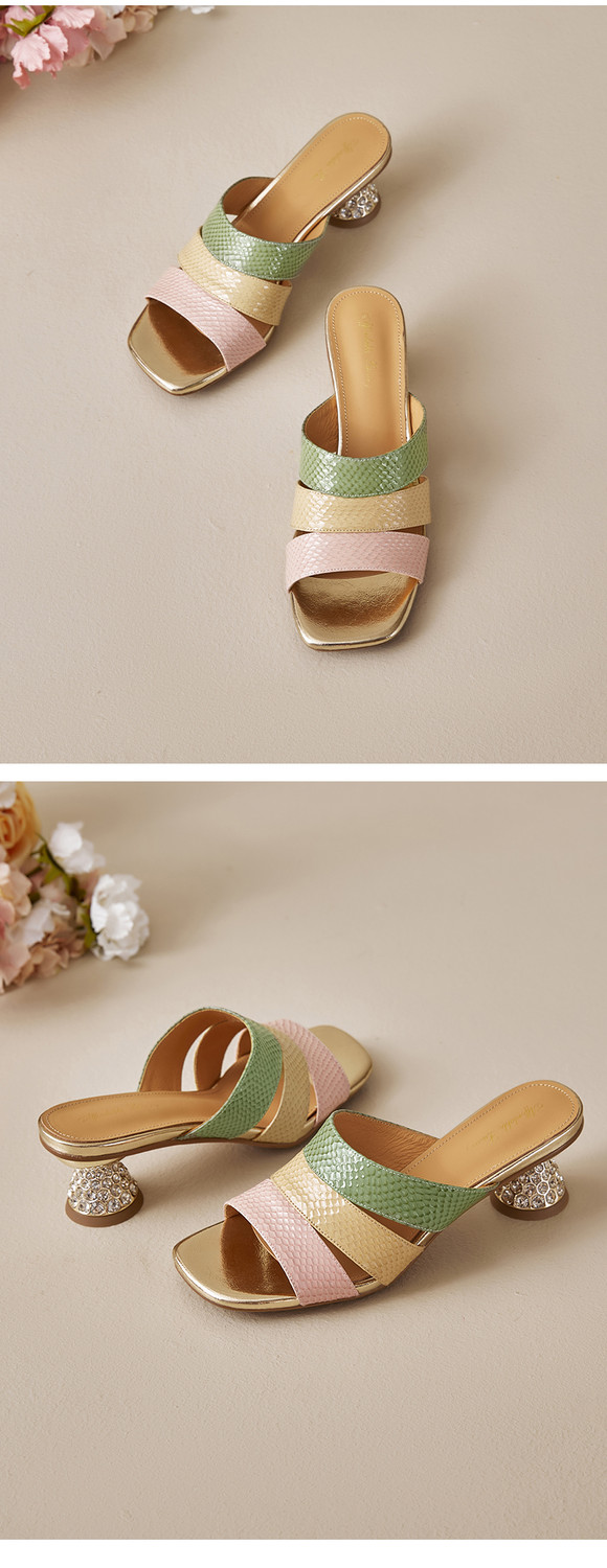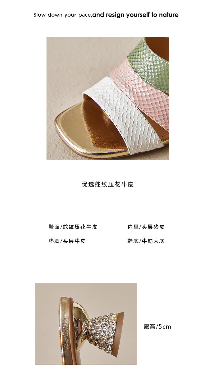 【预售5天】夏新款真皮一字拖女外穿露趾凉拖鞋拼色百搭时尚粗跟高跟凉鞋MBJR&6921