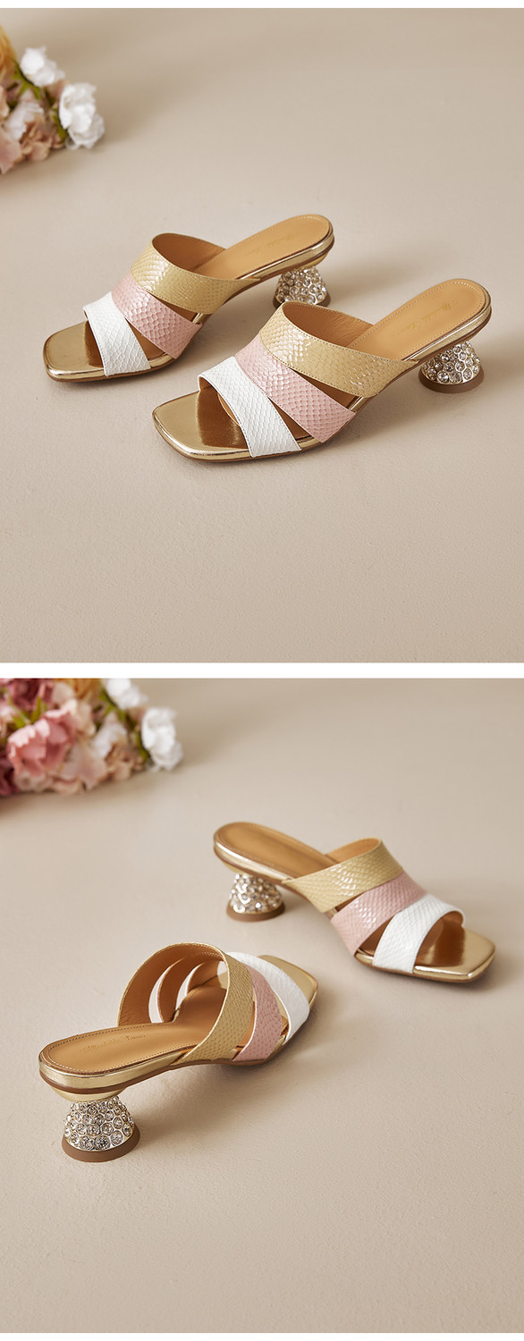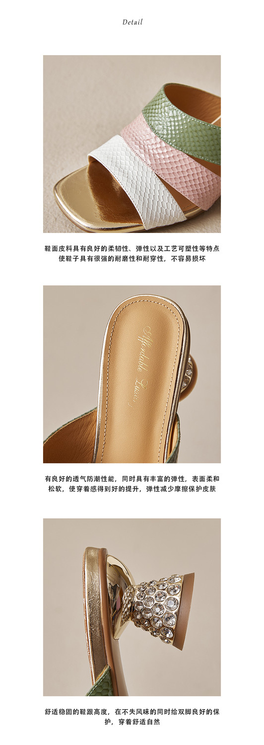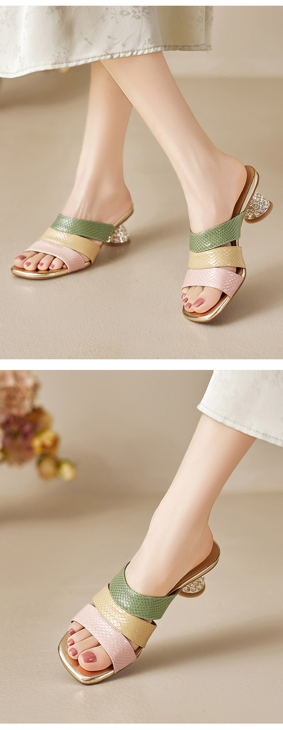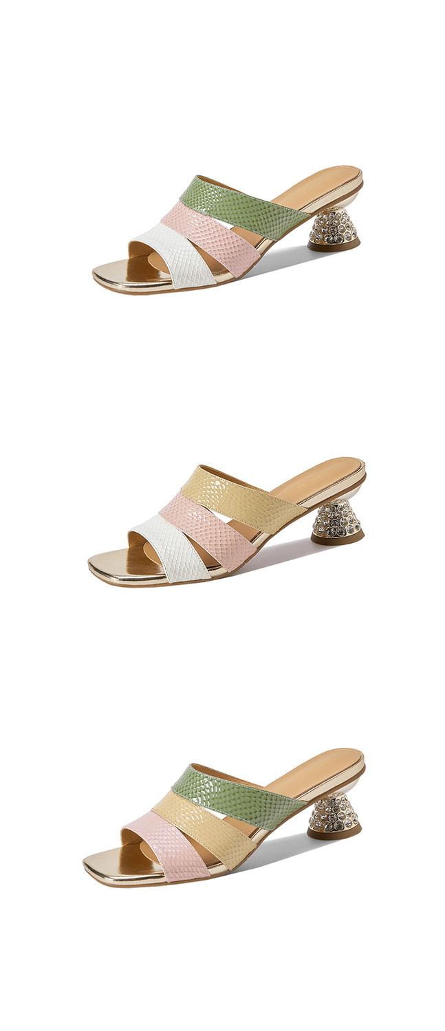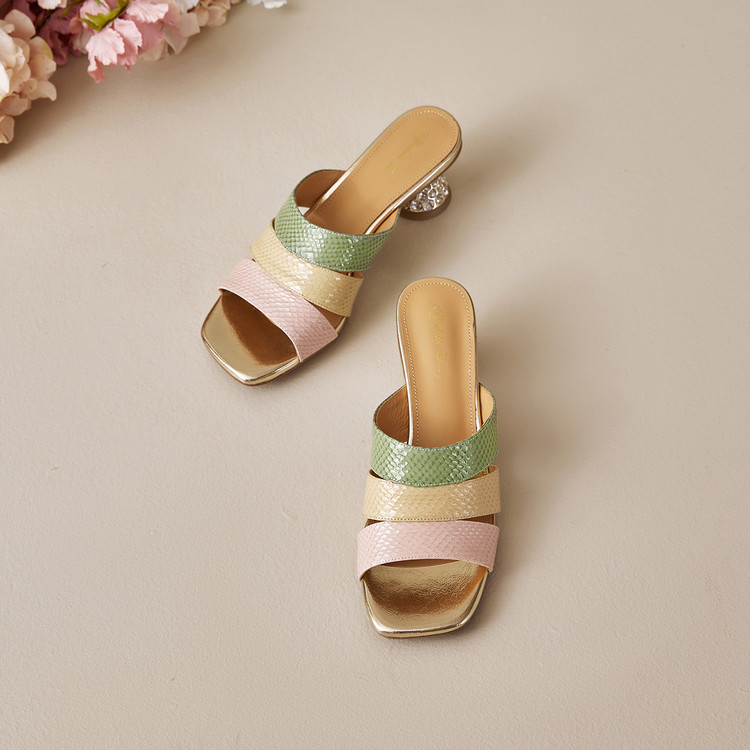 【预售5天】夏新款真皮一字拖女外穿露趾凉拖鞋拼色百搭时尚粗跟高跟凉鞋MBJR&6921
