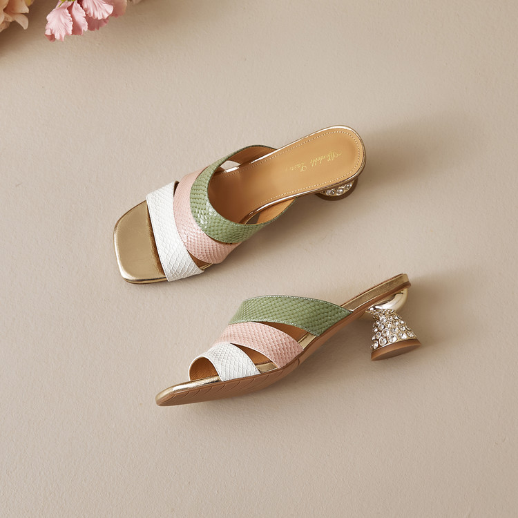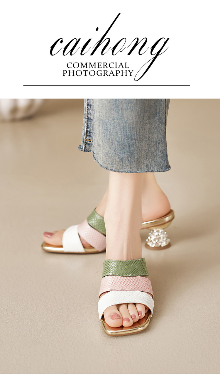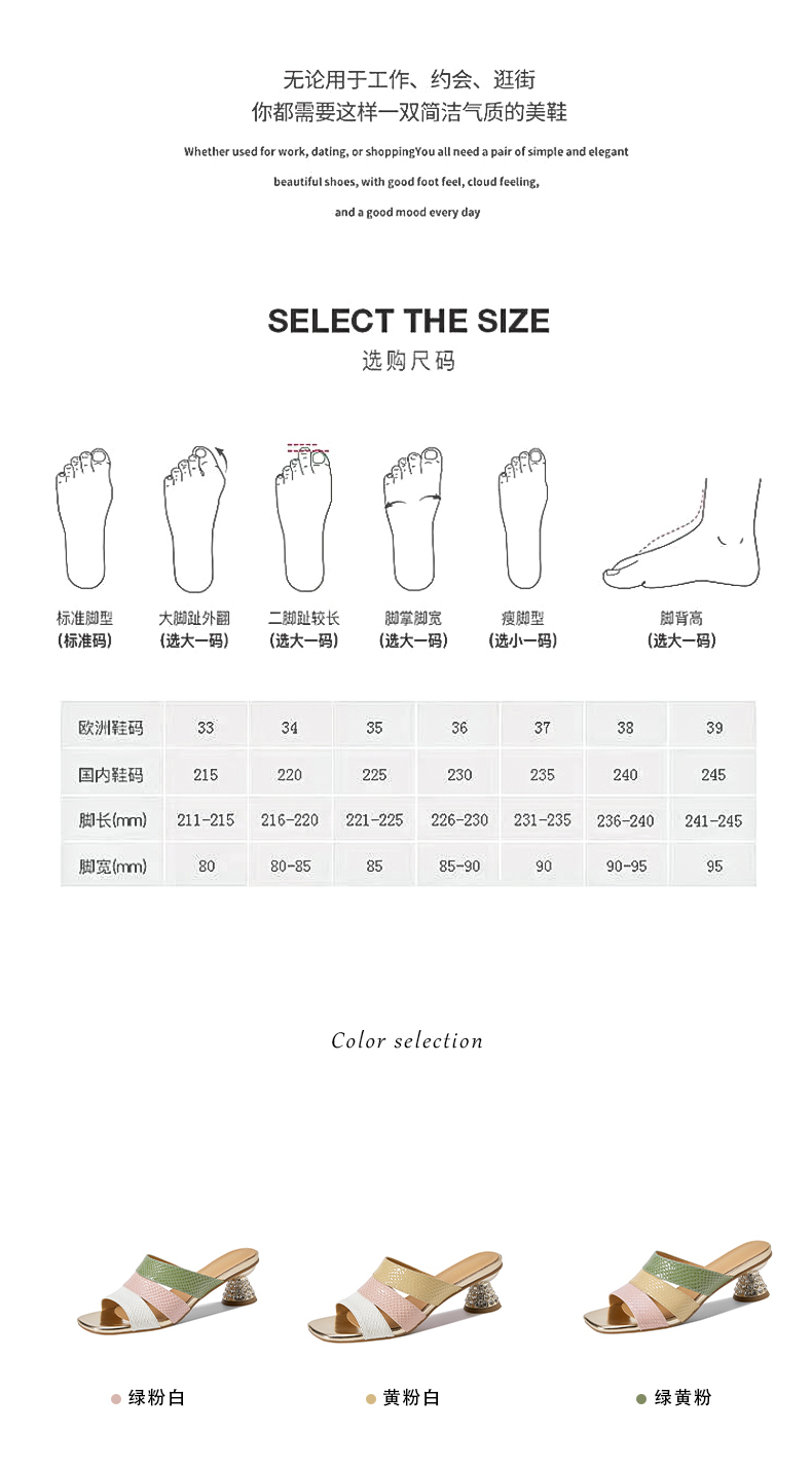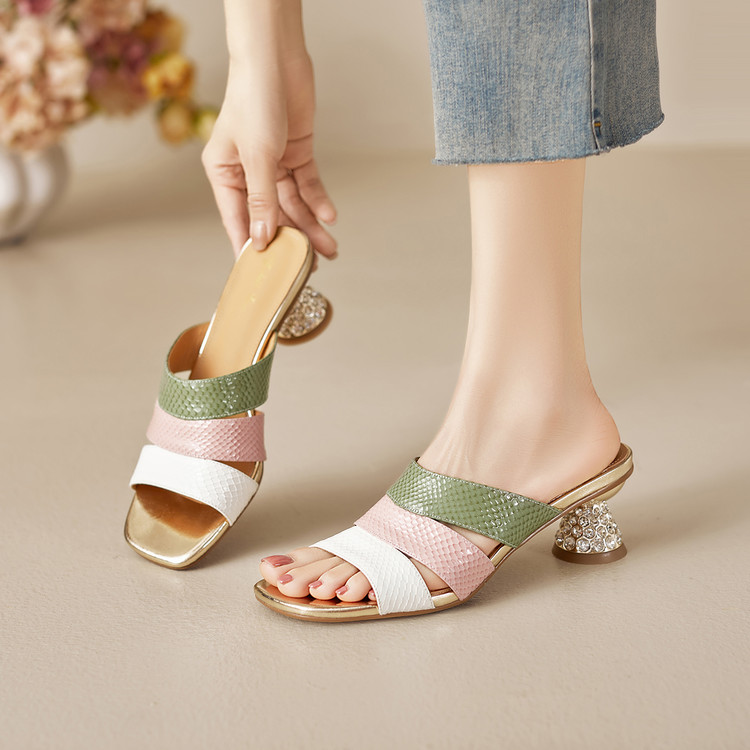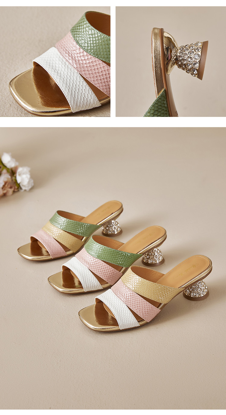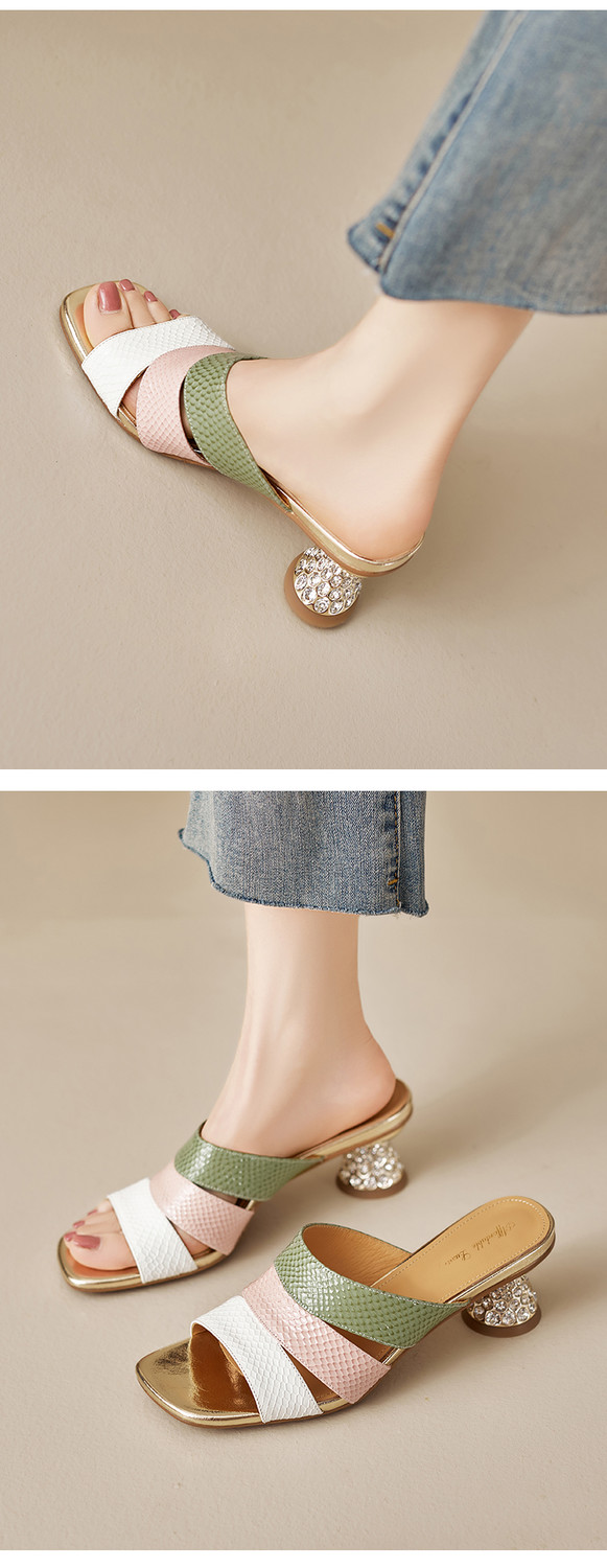 【预售5天】夏新款真皮一字拖女外穿露趾凉拖鞋拼色百搭时尚粗跟高跟凉鞋MBJR&6921