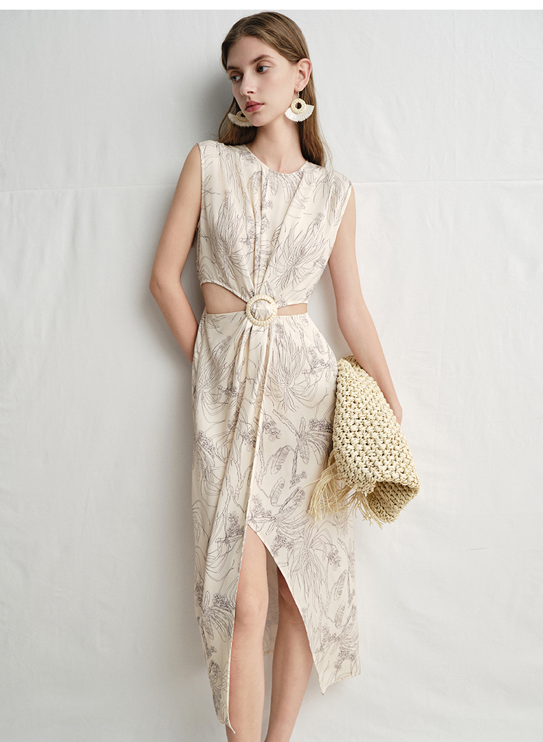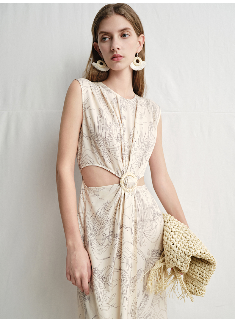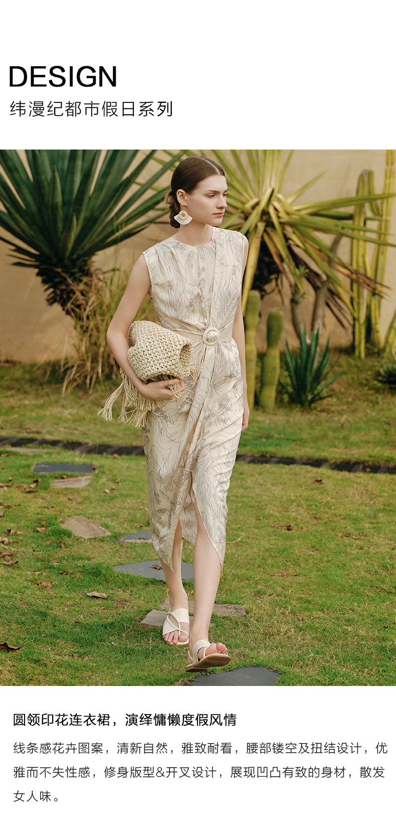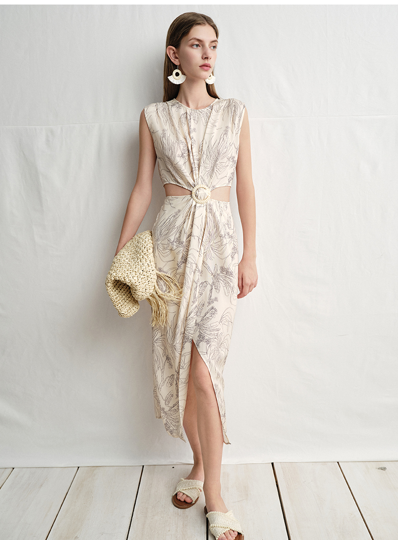 VIMAGE纬漫纪高级感线条花卉腰部镂空扭结收腰连衣裙2025夏季新款V2307913