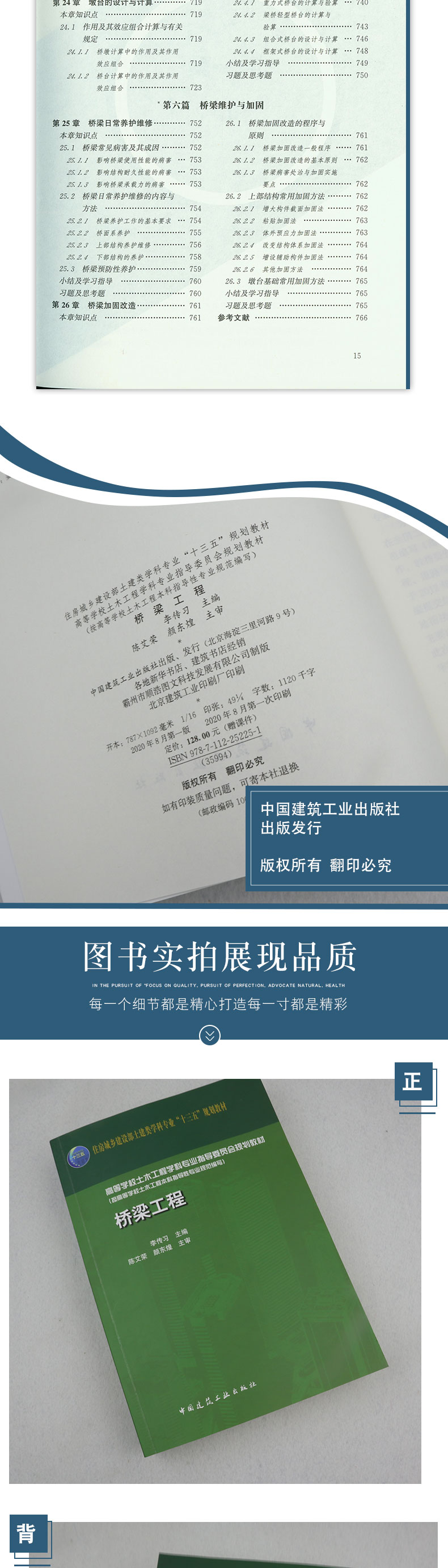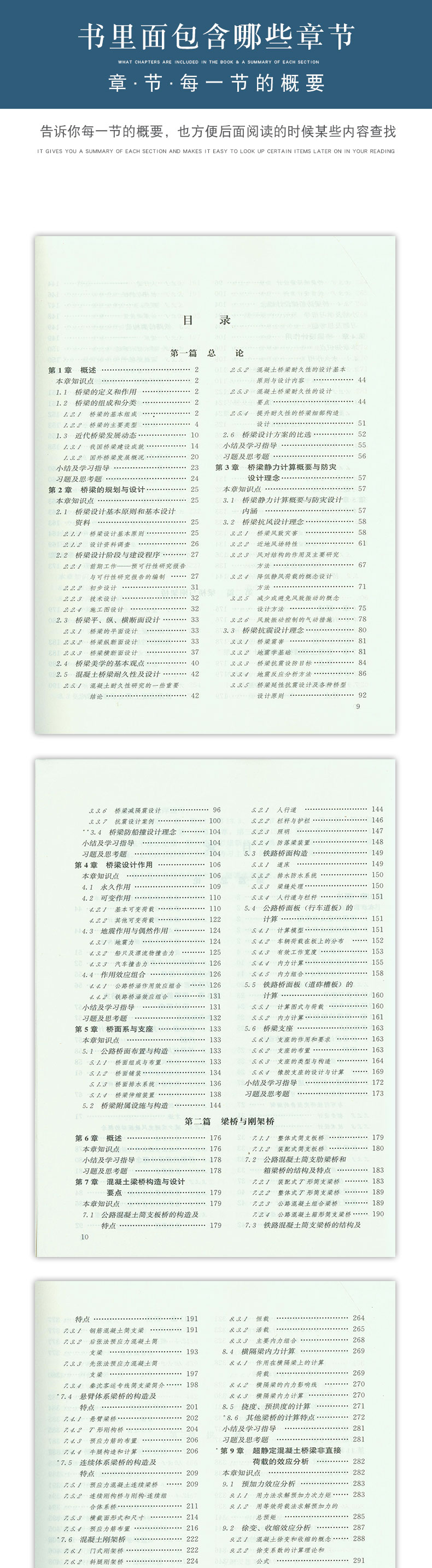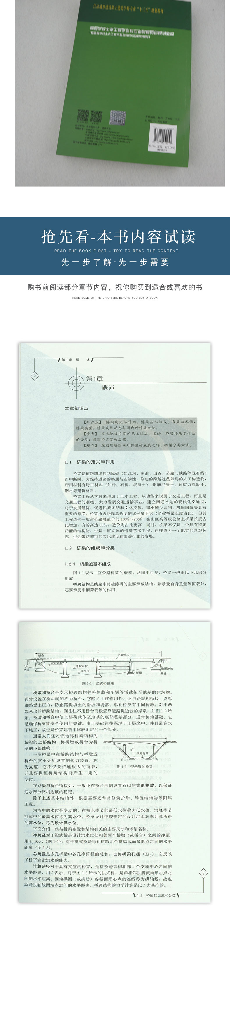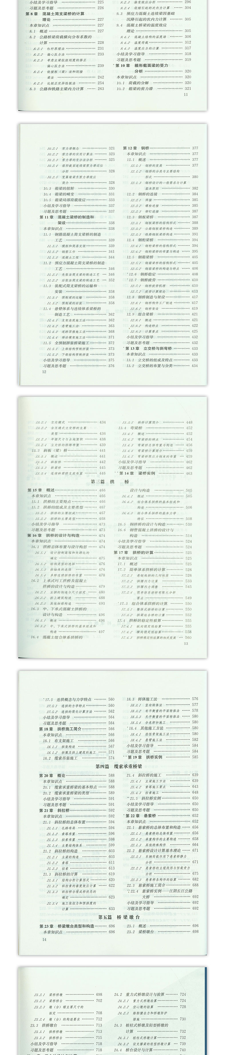 本教材对桥梁基本知识力求阐述清楚,通过算例和示例,使学生掌握要领,并能自如地解决各种工程计算问题,同时书中融入了桥梁领域当前的新规范、新技术、新进展和新趋势(如钢桥建设的逐渐增多),以及近些年来工程技术人员所普遍关心的问题(如耐久性、桥梁美学等)。 全书共六篇25章,第一篇介绍了桥梁工程的基本知识和发展动态,以及规划设计的方法和程序,防灾设计理论与方法,公路、铁路和城市桥梁的作用和组合,桥面系和支座。第二篇重点介绍了混凝土简支、悬臂和连续体系桥梁的设计计算方法、施工要点和示例。第三篇主要介绍上承式拱桥的构造、设计计算方法、施工要点和示例。第四篇主要介绍缆索承重桥梁(悬索桥和斜拉桥)的构造、设计计算要点、施工方法和示例。第五篇主要介绍桥梁墩台的构造和设计计算要点。第六篇主要介绍桥梁维修与加固的理论与方法。