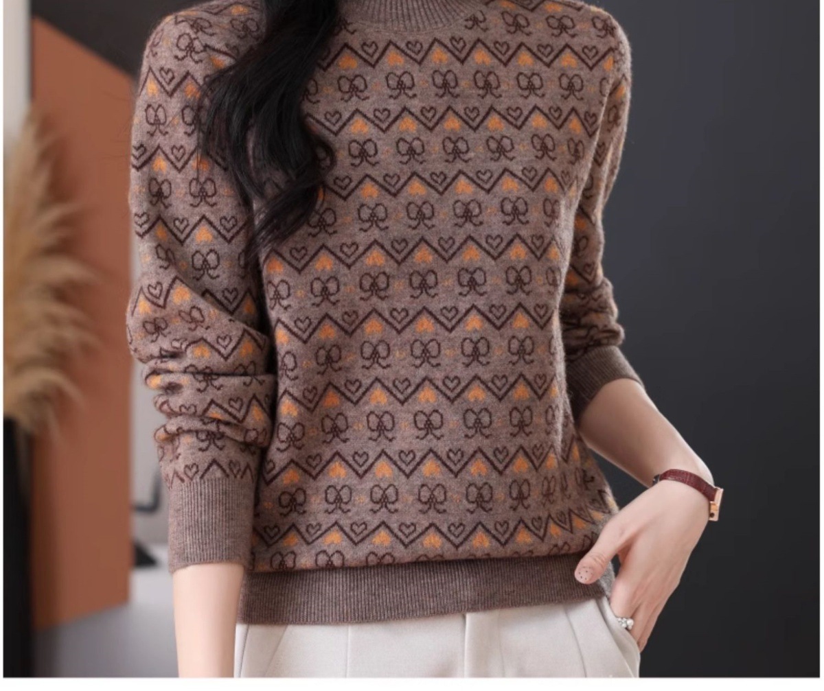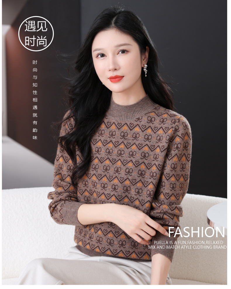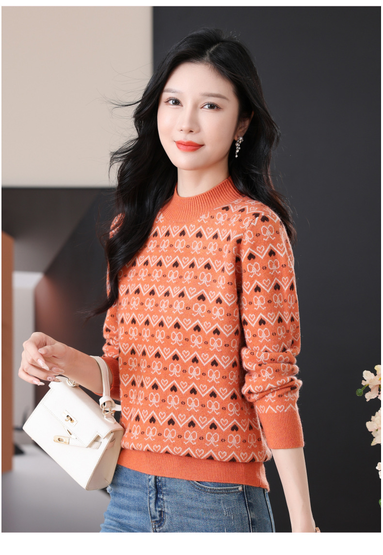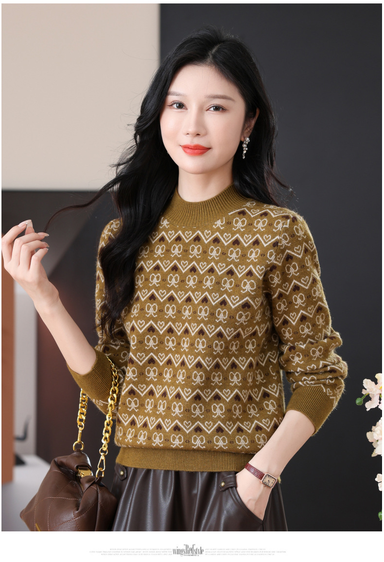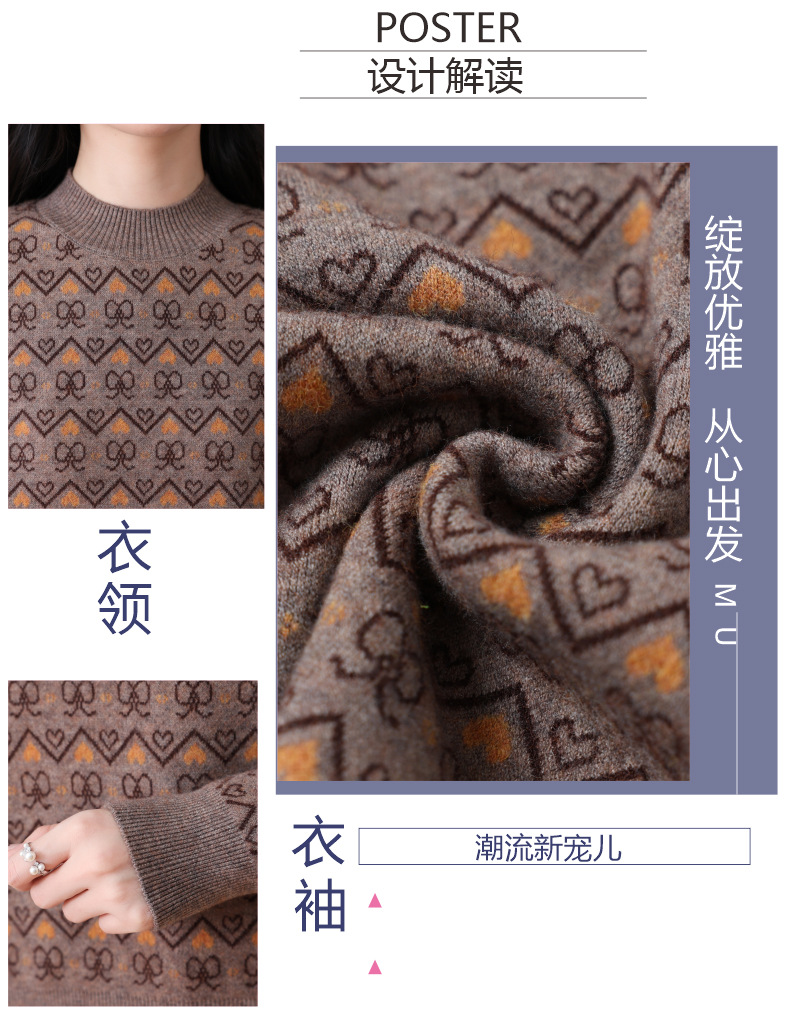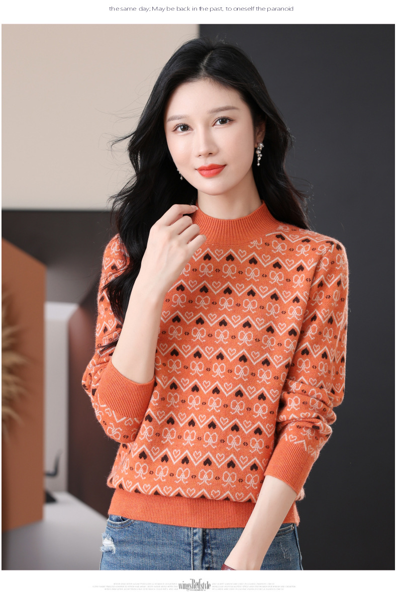 CC-103-8212秋冬季半高领针织毛衣保暖宽松女士洋气内搭提花厚款打底衫