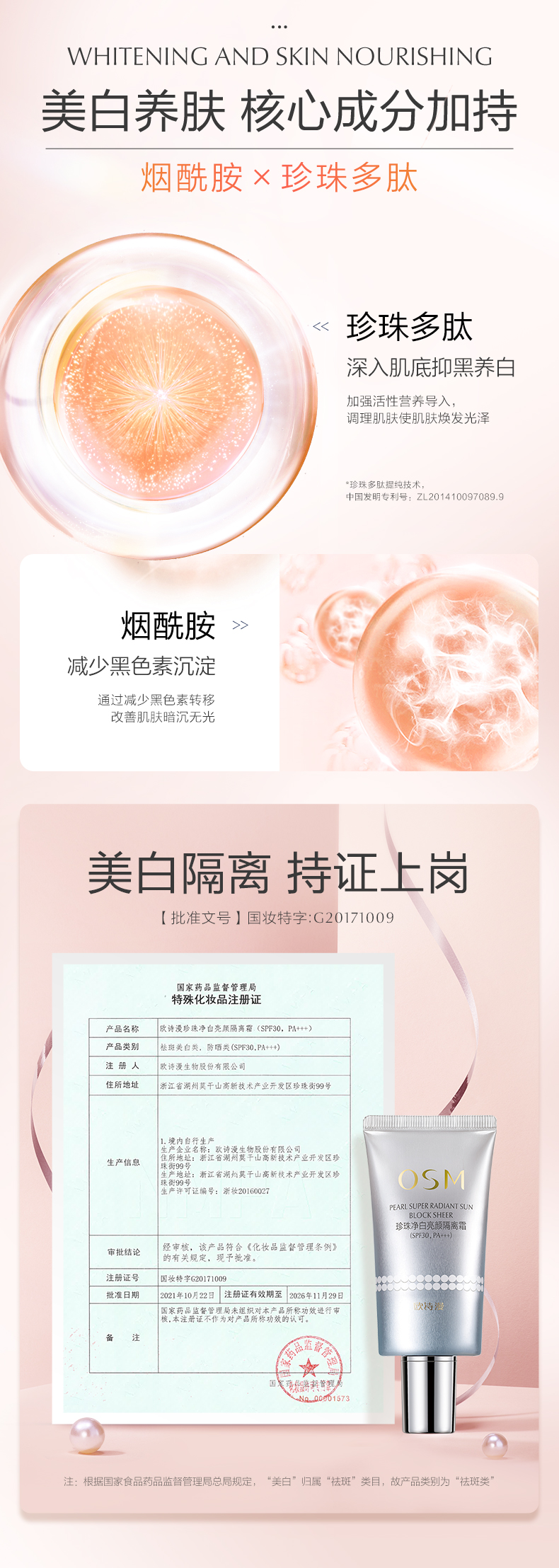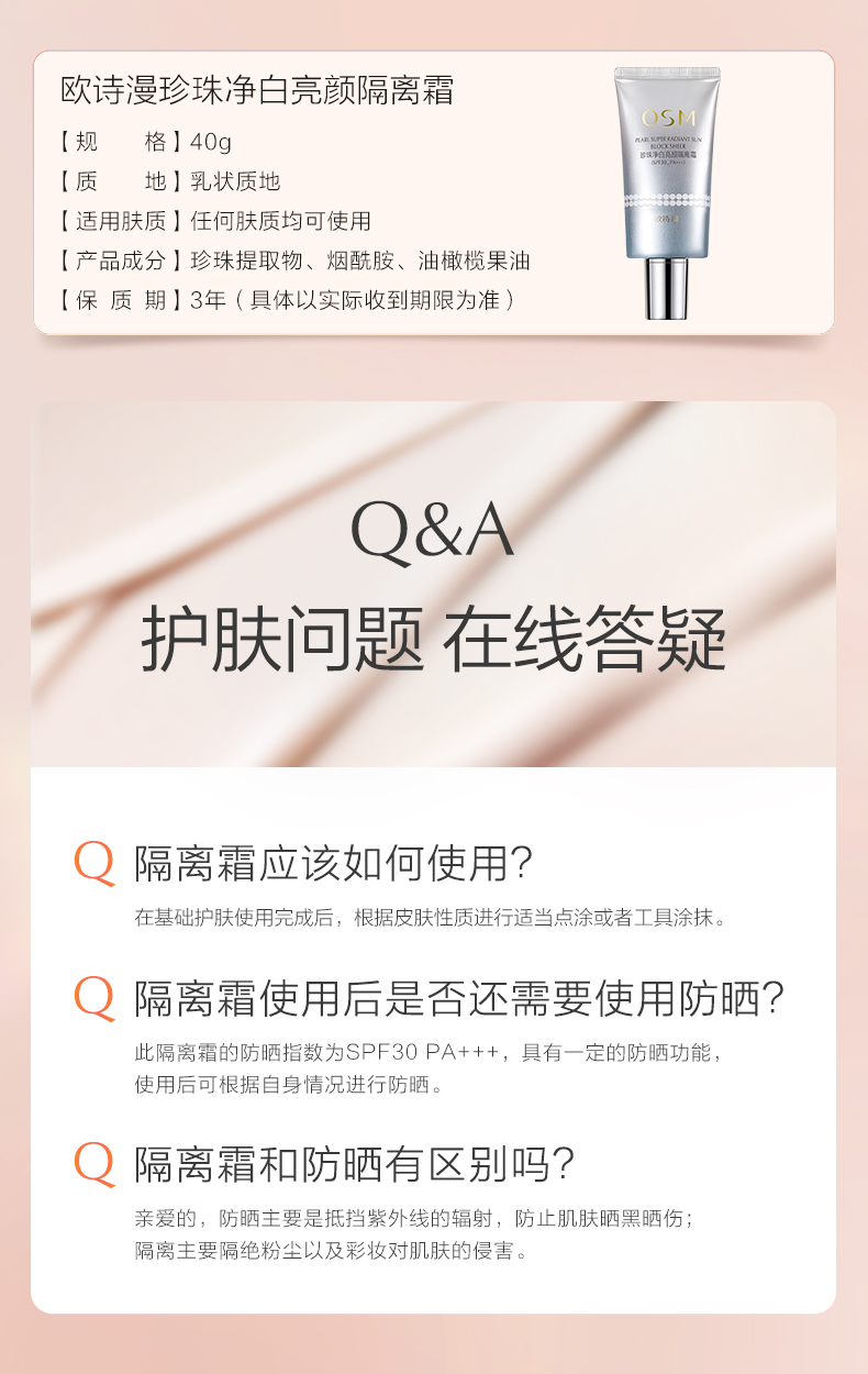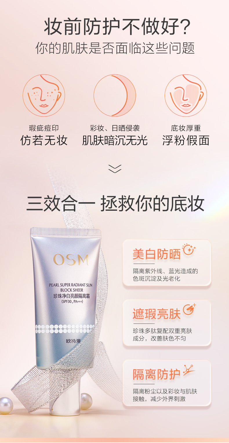 欧诗漫珍珠净白亮颜隔离霜40g美白遮瑕防晒三合一防紫外线