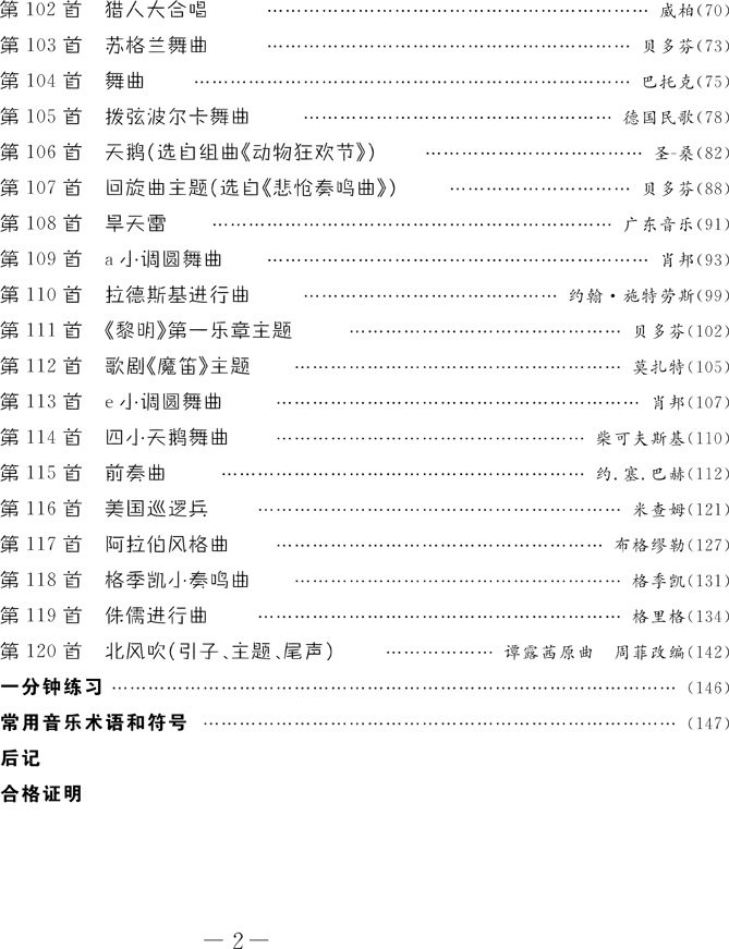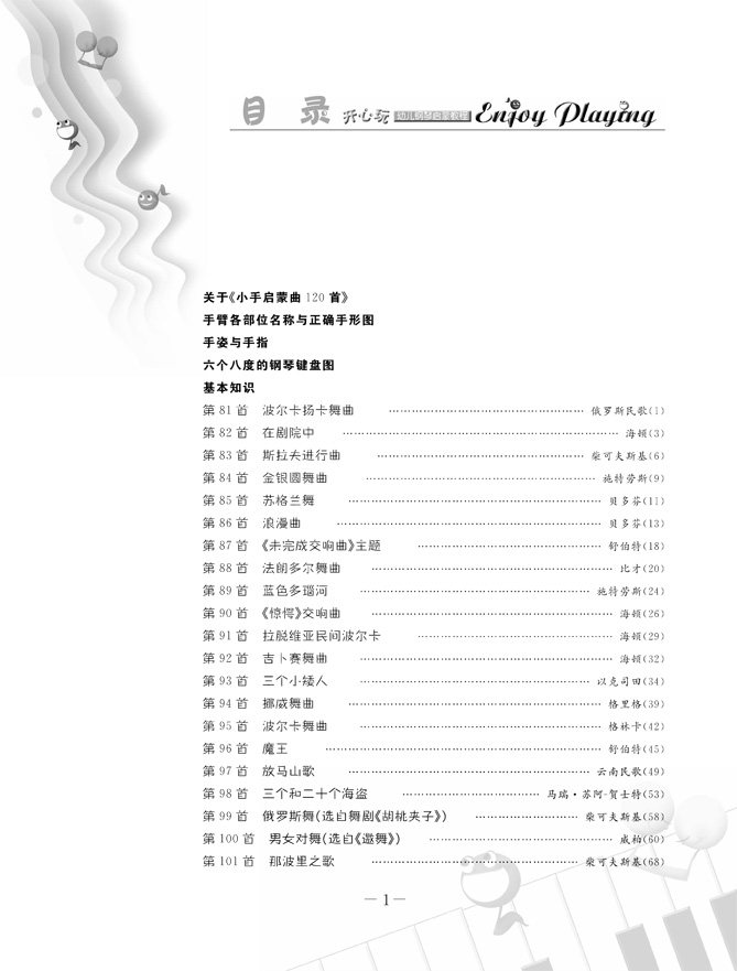 乐曲部分——《小手启蒙曲120首(下)》是结束模仿教材《跟我学15首》后的上谱教材,是本着通过学习钢琴而学习音乐、通过学习音乐而掌握知识、通过掌握知识而提高素质之目的,结合幼儿的生理、心理特点,加之启蒙阶段有限时间的可行性,精心编写而成的。本册共40首乐曲,主要包括中外儿歌、民歌和经典名曲,并介绍了一些作曲家。教材基本上对这40首乐曲都进行了旋律上的编配,旨在让孩子们在启蒙初期就能接触到经典名曲,了解作曲家,丰富音乐视野,更好地理解作品。