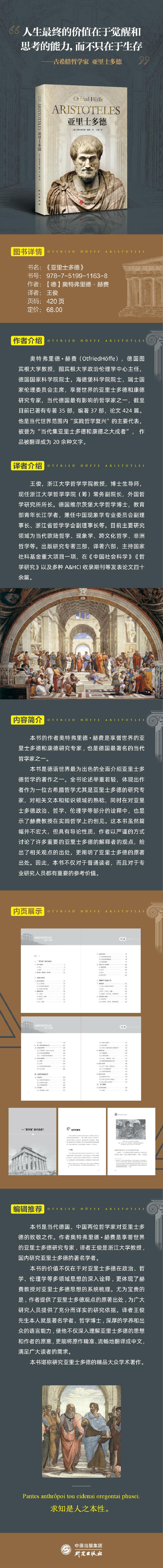 本书是德语世界为出色的全面介绍亚里士多德哲学的著作之一。全书论述举重若轻,体现出作者作为一位古希腊哲学尤其是亚里士多德的研究专家,对相关文本和知识领域的熟稔,同时在对亚里士多德政治、哲学、伦理学等部分的诠释中,也显示了赫费教授在实践哲学上的创见。这本书虽然篇幅并不宏大,但具有导论性质,作者以严谨的方式讨论了许多重要的亚里士多德的解释者的观点,给出了相关观点的出处,更阐明了亚里士多德的原著出处。因此,本书不仅对于普通读者,而且对于专业研究人员都有重要的参考价值。