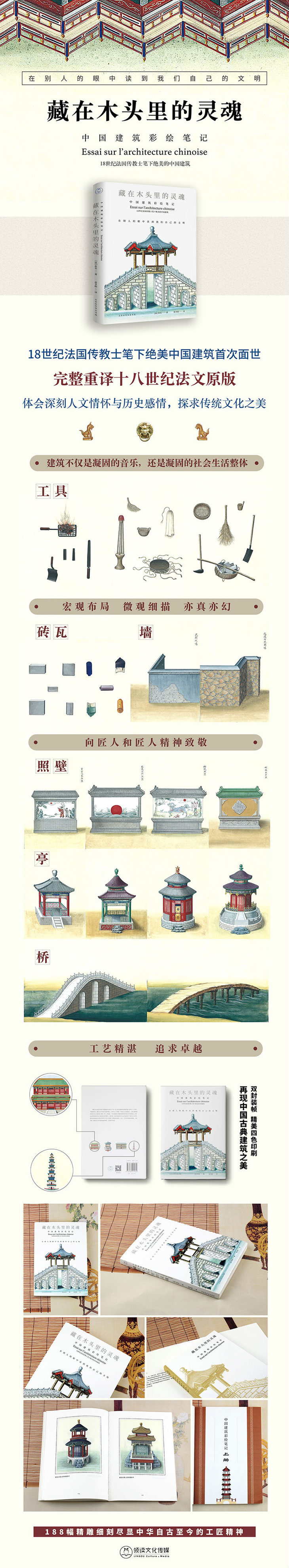 《藏在木头里的灵魂:中国建筑彩绘笔记》是一本描绘介绍中国建筑的画谱手稿,完成于十八世纪,作者是姓名、履历已不可考的法国传教士。原书分上下两册,共包含188幅绘画。上册主要是建筑常用工具、砖瓦墙、照壁、亭子、桥和塔。下册主要是大型整体建筑结构和住宅内部摆设、台等。在没有影像的时代,来自西方传教士(或学者)通过绘画这种方式记录着他们了解的东方世界。通过这些绘画也让西方世界对于东方古国有更直观的感受。另外,书中的才华制作精美,内容丰富,哪怕仅仅当作装饰画册来看,也是美不胜收。