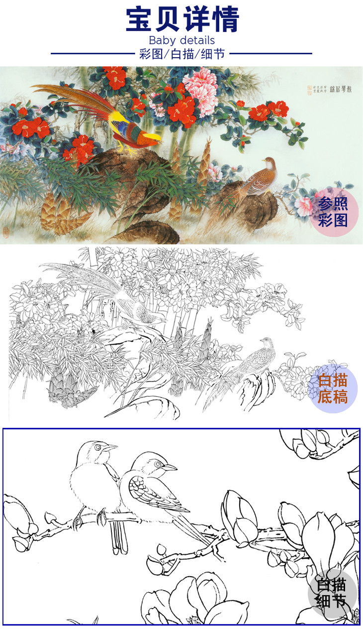 横幅四尺六尺工笔花鸟白描底稿-梁燕生-山茶花锦鸡《锦绣前程》-多种白描尺寸可选-A063